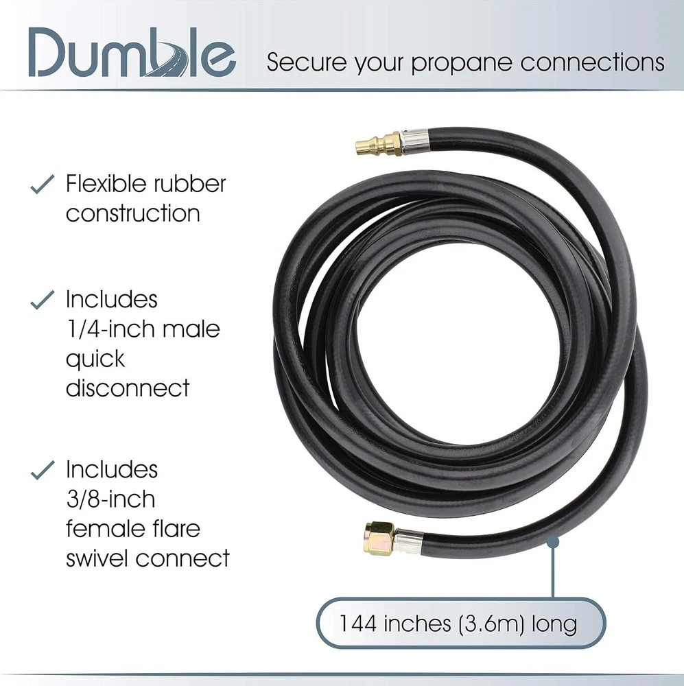 [Secure Your Propane Connections]: Connect your propane tank to the heater and grill for your RV with the Dumble RV Supplies Low Pressure LP Gas Regulator 12-Foot Hose; Safely and securely attach the propane to your desired source [No More Leaks]: No need to worry about this propane regulator hose leaking valuable gas; Flexible rubber hose is constructed to reliably transfer propane to your heater; Hose measures 144 inches (3.6m) long [In Rain or Shine]: Depend on this propane tank hose for your camper and RV; Use propane tank regulator hose indoors and outdoors on the campground, at the cabin, and other camping locations [Correct Connection]: Low pressure regulator hose includes 1/4-inch male quick disconnect fitting; This LP pressure regulator hose also includes 3/8-inch female flare swivel connect for your RV and camper propane tank [For Your Needs]: This flexible propane regulator low pressure hose is designed with your applications in mind; Use propane hose for your grill, heater, fire pit, water heater, and other RV and camper appliances; Not designed for air pressure