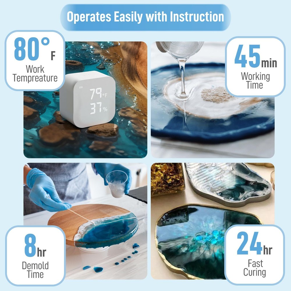 Clear Epoxy Resin Kit 1/2 Gallon 2 Part for Countertops Table Bar Tops Wood, Self-Leveling Food Safe Resina Epoxica Casting Resin Coat for Jewelry Tumblers Coaster DIY Wide Applications: Great for a variety of applications including coating, wood finishes, tabletops, jewelry making, and more, ideal choice for your artistic or business projects. Easy to Use: Easy to mix and no confusion, one to one mix ratio is fool proof. Just mix one part resin to one equal part hardener and has a forgiving 40 minute work time, perfectly matches all of glow paints in the dark, craft pigments and mica powders. UV Resistant: Our resin is designed for longevity with superior UV resistance, preventing yellowing and preserving clarity for durable and beautiful finish. Food-Safe When Fully Cured: Suitable for food-contact applications like kitchen and bar tops when fully cured, offers compatibility with wood and metal surfaces. Impact and Water-Resistant: Finished artwork offers exceptional durability against both impact and moisture, ensuring your projects withstand daily wear and tear. Read the instruction carefully: To achieve the best effect of your works, please read the user manual carefully before use. If you have any concerns or issues, don’t hesitate to contact us through Amazon and our customer service team will respond within 24 hours. crystal clear epoxy resin for casting and coating - 64oz kit Our epoxy resin designed for casting and coating, can be used on wood, concrete, stones, rocks, ceramics and granite, applied to tabletop, bar, countertop, tumbler, garage floor and more, to give a crystal clear and durable finish. With suitable molds, the great formula can be also used for casting fingers, including earrings, necklace, bracelet, pendant, craft gifts, etc. Expand your imagination, bring your great ideas and projects to life with our specially formulated art resin. Enjoy resin craft making with your imagination and creativity! Features: Crystal Clear 1:1 Mixing Ratio Fast Curing Self Leveling Resists Yellowing 40 minute work time No VOCs & Low Odor Non Flammable Specifications: Material: Epoxy Resin and Hardener Use: Casting and Coating Volume: Two 1/2 gallon bottles (1 gallon total) Longevity: Resists yellowing from sun exposure but should not be left permanently outdoors as all epoxy resin will eventually yellow from sun exposure Safety: Keep out of reach of children. Use only in a well ventilated area. Shipping We offer FREE shipping on all orders! We ship within Three business days of payment, usually sooner. We use a selection of shipping services such as UPS, FedEx, USPS etc. We only ship to the lower 48 states, no APO/FPO addresses or PO Boxes allowed. Local pickups and combined shipping options are not provided at this time. Return You can return a product for up to 30 days from the date you purchased it. Any product you return must be in the same condition you received it and in the original packaging. Please keep the receipt. Payment We accept payment by any of the following methods: PayPal Please pay as soon as possible after winning an auction, as that will allow us to post your item to you sooner! Feedback Customer satisfaction is very important to us. If you have any problem with your order, please contact us and we will do our best to make you satisfied. Contact Us If you have any queries, please contact us via ebay. We usually respond within 24 hours on weekdays. Please visit our eBay store to check out other items for sale! Thank you for shopping at our store.