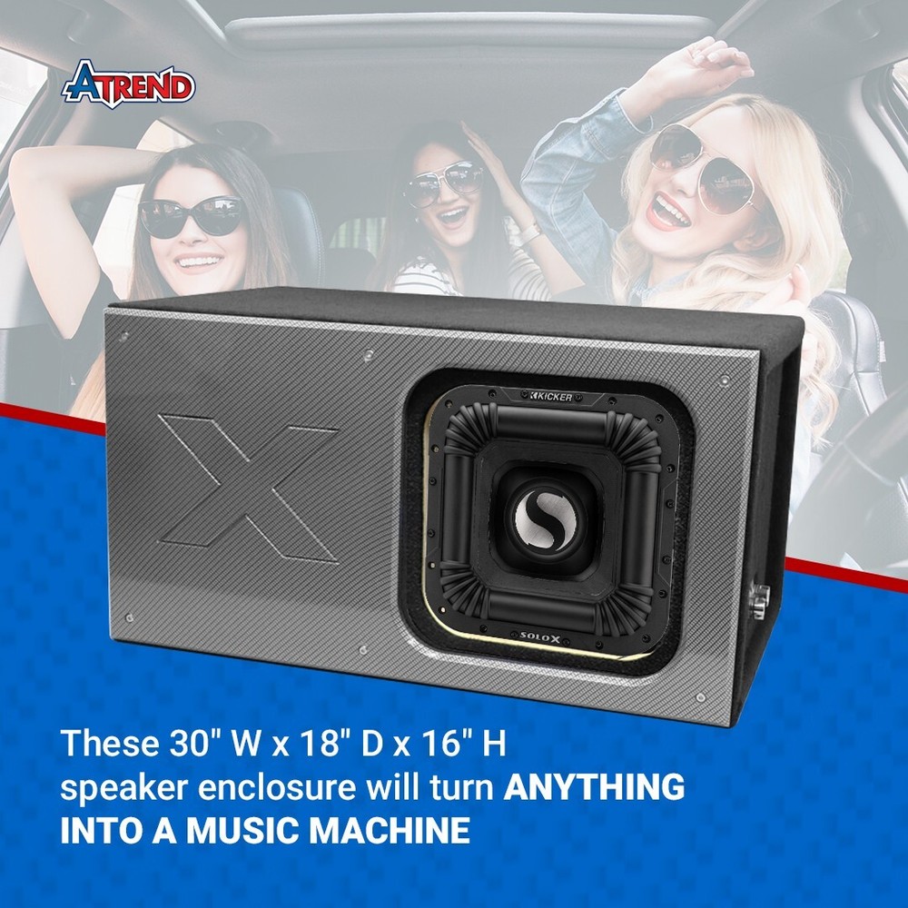Upgrade your car audio experience with this premium Atrend USA-Made Speaker Enclosure designed exclusively for the Kicker SOLO X 12" Subwoofer. Crafted from high-quality 1" MDF, this enclosure ensures robust construction and exceptional sound performance. Tuned to 31HZ - 30 inches wide X 16 inches high X 18 inches deepKey Features:Custom Face Plate: The enclosure boasts a custom face plate with inset bolts, providing a sleek and customized appearance. The attention to detail is evident in every aspect of its design.Heavy Duty Banana Clip Terminal Cup: Connect with ease using the heavy-duty banana clip terminal cup. This feature adds convenience to your setup while ensuring a reliable and secure connection for optimal performance.Plush Black Carpet Wrapping: The enclosure is expertly wrapped in plush black carpet, adding a touch of elegance to your car audio system. The carpet not only enhances the aesthetics but also provides additional protection.Vented Design: Enjoy deep and powerful bass with the vented design of this speaker enclosure. The tuned port allows for efficient airflow, maximizing the potential of your Kicker SOLO X Subwoofer.Inset Woofer Faceplate: The faceplate is designed to allow the woofer to be inset, creating a seamless and flush appearance. This design not only looks impressive but also contributes to a well-integrated audio system.Dimensions: The enclosure measures 30 inches wide, 16 inches high, and 18 inches deep, making it suitable for various car audio setups. The dimensions are carefully chosen to accommodate the specific requirements of the Kicker SOLO X Subwoofer.Tuning Frequency: With a tuning frequency of 31Hz, this enclosure is precisely tuned to complement the characteristics of the Kicker SOLO X Subwoofer, delivering a rich and dynamic listening experience.Invest in quality, precision, and performance with the Atrend USA-Made Speaker Enclosure. Elevate your car audio setup and unleash the full potential of your Kicker SOLO X 12" Subwoofer. Order now and experience the difference!