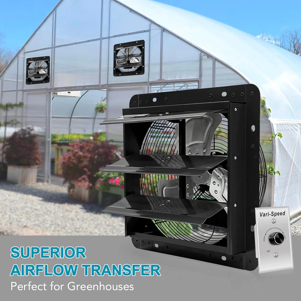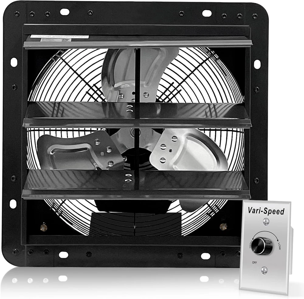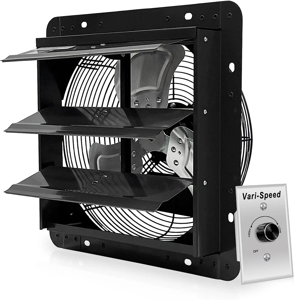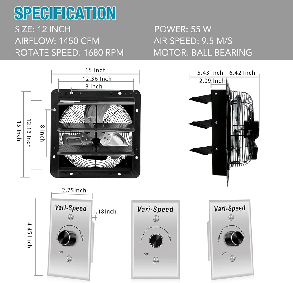 Widely Usage Shutter Fan: This VENTISOL 12 " Wall Mounted Exhaust Fan is a powerful fan that can be ventilated in garages, gardens, attics,barns, greenhouses, basements and a variety of other locations where needs to transfer the superior airflow for cooling and ventilation. Variable Speed Shop Exhaust Fan: Separately with a variable speed controller in package, can adjust fan speeds to customize your comfort. Easy Installation Attic Fan: No plug, No power cord, it’s a hard-wired connection, just wiring to your building’s electrical system. Longer Life-time Shutter Fan: Powder coating in black, constructed from galvanized steel frame, 3 aluminum shutter blades, fully enclosed ball bearing motor, provided 1 year warranty. Built-in shutter mechanism, self-closing shutters protect the fan from rain and snow when not in operation. It’s suitable for ventilating a building to the outside. Powerful & Efficient Exhaust Shutter Fan: The 12-inch exhaust fan runs on standard 120 volts at 55W, 0.42 amps, with 1680rpm, 9.5m/s, cooling and ventilating an area of 1450 cubic feet per minute,with ETL safety listed. Product Description Speed Controller With a separately Variable Speed Controller, make it easy to adjust the speed of the ventilation fans to your requirement. Save energy and control the noise levels of the ventilation fans. Range from 70% to 100% Start by turning the knob to High and gradually decrease the power to you desired power level.When finished,turn knob back to OFF. If the speed controller is not connected, the exhaust fan will run at maximum speed. Easy Installation Bare leads for custom application, black line to switch, white(or red) to neutral. With a detailed instructions in the package for reference. Automatic Shutters This wall mounted exhaust fan features a galvanized-steel shutter, rear grille, aluminium impeller. The automatic shutters open and close in conjunction with the operation of the fan. Powerful Motor Ball bearing motor, longer service life. High-airflow exhaust fan designed to ventilate our heat, moisture, odor and dust from various places, such as the greenhouses, attic, sheds, etc. With 1680rpm, 9.5m/s, cooling and ventilating an area of 1450 cubic feet per minute. The installation of speed controller. Firstly, theWhite(or Red) wire of the fan is connected to the Black wire of the speed controller. Secondly,the White wire of the speed controller is connected to switch ,the Black wire of the fan is connected to Neutral and green wire to ground. Installation method and connection diagram are come with clear directions on the user manual. It is very easy to connect with the speed controller and install on the wallt Mmultiple-purpose Venting Fan Greenhouse Attic Shed