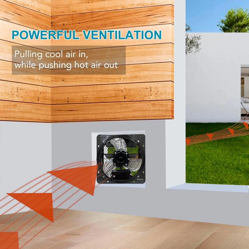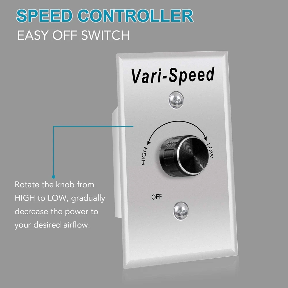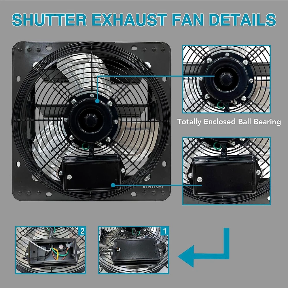 Widely Usage Shutter Fan: This VENTISOL 12 " Wall Mounted Exhaust Fan is a powerful fan that can be ventilated in garages, gardens, attics,barns, greenhouses, basements and a variety of other locations where needs to transfer the superior airflow for cooling and ventilation. Variable Speed Shop Exhaust Fan: Separately with a variable speed controller in package, can adjust fan speeds to customize your comfort. Easy Installation Attic Fan: No plug, No power cord, it’s a hard-wired connection, just wiring to your building’s electrical system. Longer Life-time Shutter Fan: Powder coating in black, constructed from galvanized steel frame, 3 aluminum shutter blades, fully enclosed ball bearing motor, provided 1 year warranty. Built-in shutter mechanism, self-closing shutters protect the fan from rain and snow when not in operation. It’s suitable for ventilating a building to the outside. Powerful & Efficient Exhaust Shutter Fan: The 12-inch exhaust fan runs on standard 120 volts at 55W, 0.42 amps, with 1680rpm, 9.5m/s, cooling and ventilating an area of 1450 cubic feet per minute,with ETL safety listed. Product Description Speed Controller With a separately Variable Speed Controller, make it easy to adjust the speed of the ventilation fans to your requirement. Save energy and control the noise levels of the ventilation fans. Range from 70% to 100% Start by turning the knob to High and gradually decrease the power to you desired power level.When finished,turn knob back to OFF. If the speed controller is not connected, the exhaust fan will run at maximum speed. Easy Installation Bare leads for custom application, black line to switch, white(or red) to neutral. With a detailed instructions in the package for reference. Automatic Shutters This wall mounted exhaust fan features a galvanized-steel shutter, rear grille, aluminium impeller. The automatic shutters open and close in conjunction with the operation of the fan. Powerful Motor Ball bearing motor, longer service life. High-airflow exhaust fan designed to ventilate our heat, moisture, odor and dust from various places, such as the greenhouses, attic, sheds, etc. With 1680rpm, 9.5m/s, cooling and ventilating an area of 1450 cubic feet per minute. The installation of speed controller. Firstly, theWhite(or Red) wire of the fan is connected to the Black wire of the speed controller. Secondly,the White wire of the speed controller is connected to switch ,the Black wire of the fan is connected to Neutral and green wire to ground. Installation method and connection diagram are come with clear directions on the user manual. It is very easy to connect with the speed controller and install on the wallt Mmultiple-purpose Venting Fan Greenhouse Attic Shed