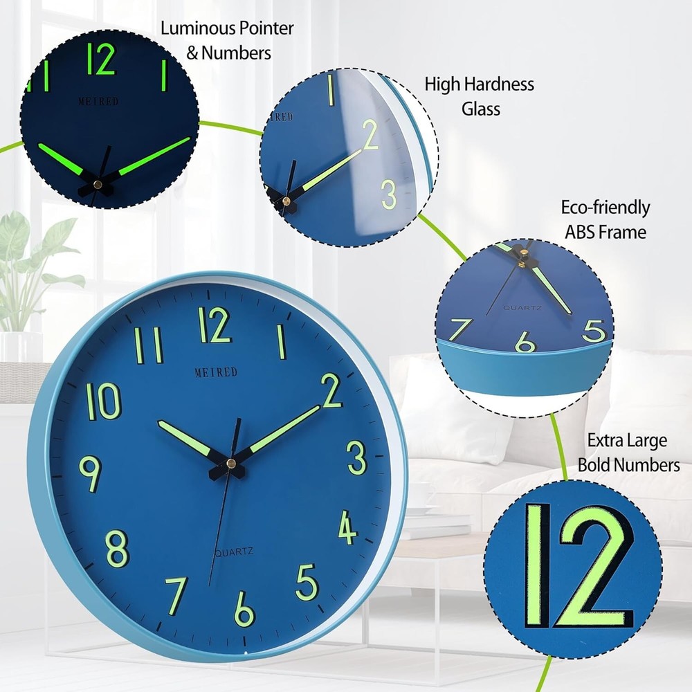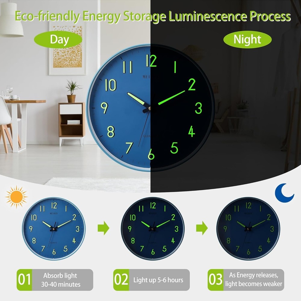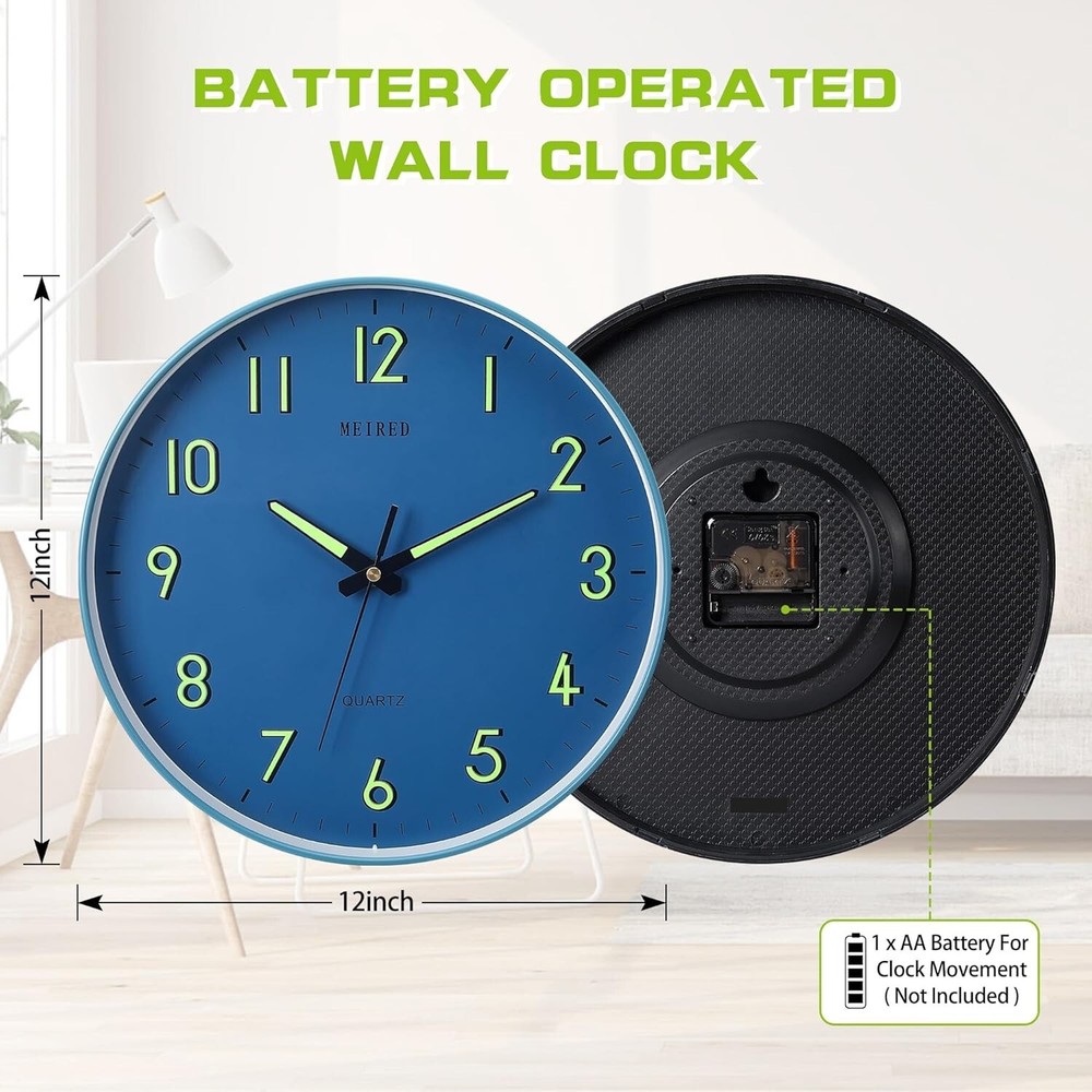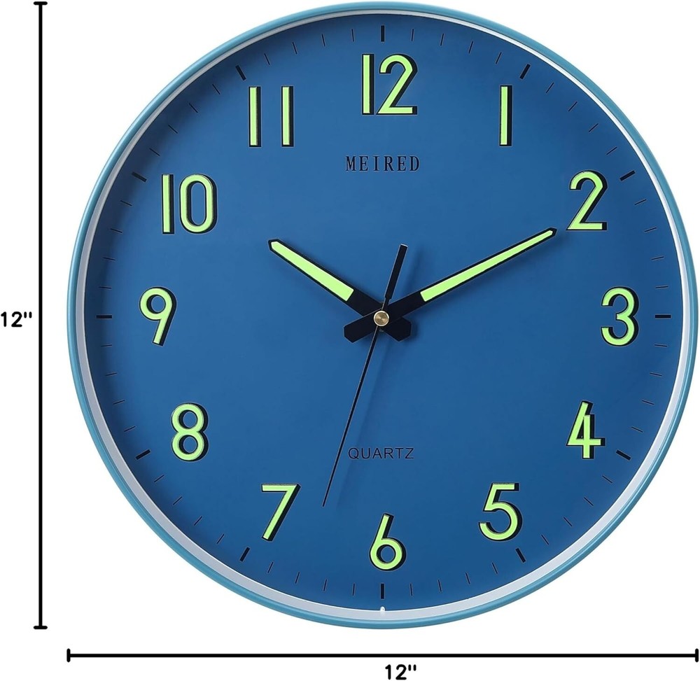 12" Silent Wall Clock, Glow in the Dark Numbers, Non-Ticking, Battery Operated GLOWING UP FUNCTION: Wall clock with night light features a luminous numbers and hands, asks for absorbing enough light energy during the day. For best results with the Glow in the Dark function: when you first receive the clock, please place the clock in sunlight or bright light for several hours. After this time period, the clock will lighted up at night or in the dark. 12" ROUND WALL CLOCK: The clock is equipped with a sturdy plastic frame and a highly transparent glass assurances perfect viewarge and keeps dust away from dial. Simple and elegant dial against the bold night light numbers creates easy viewing, make the clock easy to read any time. SUPER SLIENT CLOCK: Silent non ticking sweeping movement for peace and quiet. Perfect for working and sleeping environments. Precise quartz mechanism ensures accurate time. EASY TO USE: Hooks included with the clock, large slot in back offers easy and fast installation. It is perfect for kitchen, dining room, bedroom, classroom, office, shop, hospital, restaurant or diner BATTERY POWERED: Use 1 AA CARBON ZINC BATTERY - Not included (Note: Plus side of your battery should be inserted first). MEIRED have full experience in wall clock. Our company pursues high-quality product and delighting consumers with superior products and experience.