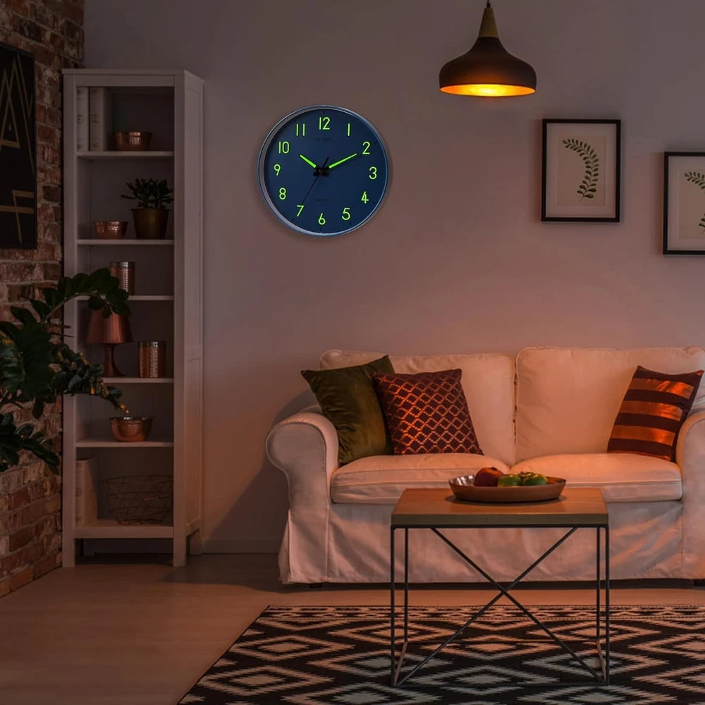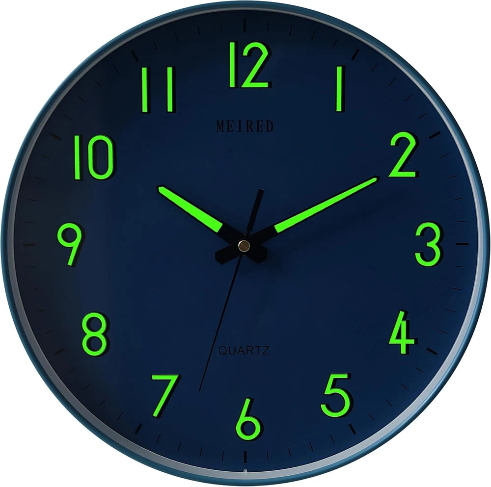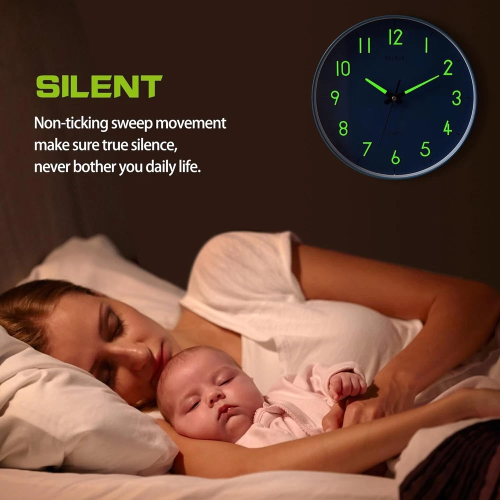 12" Silent Wall Clock, Glow in the Dark Numbers, Non-Ticking, Battery Operated GLOWING UP FUNCTION: Wall clock with night light features a luminous numbers and hands, asks for absorbing enough light energy during the day. For best results with the Glow in the Dark function: when you first receive the clock, please place the clock in sunlight or bright light for several hours. After this time period, the clock will lighted up at night or in the dark. 12" ROUND WALL CLOCK: The clock is equipped with a sturdy plastic frame and a highly transparent glass assurances perfect viewarge and keeps dust away from dial. Simple and elegant dial against the bold night light numbers creates easy viewing, make the clock easy to read any time. SUPER SLIENT CLOCK: Silent non ticking sweeping movement for peace and quiet. Perfect for working and sleeping environments. Precise quartz mechanism ensures accurate time. EASY TO USE: Hooks included with the clock, large slot in back offers easy and fast installation. It is perfect for kitchen, dining room, bedroom, classroom, office, shop, hospital, restaurant or diner BATTERY POWERED: Use 1 AA CARBON ZINC BATTERY - Not included (Note: Plus side of your battery should be inserted first). MEIRED have full experience in wall clock. Our company pursues high-quality product and delighting consumers with superior products and experience.