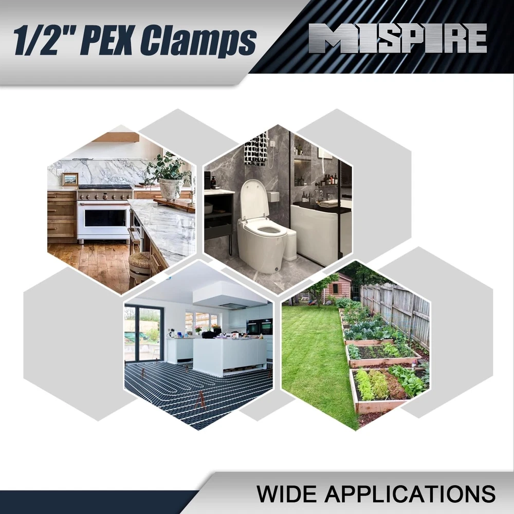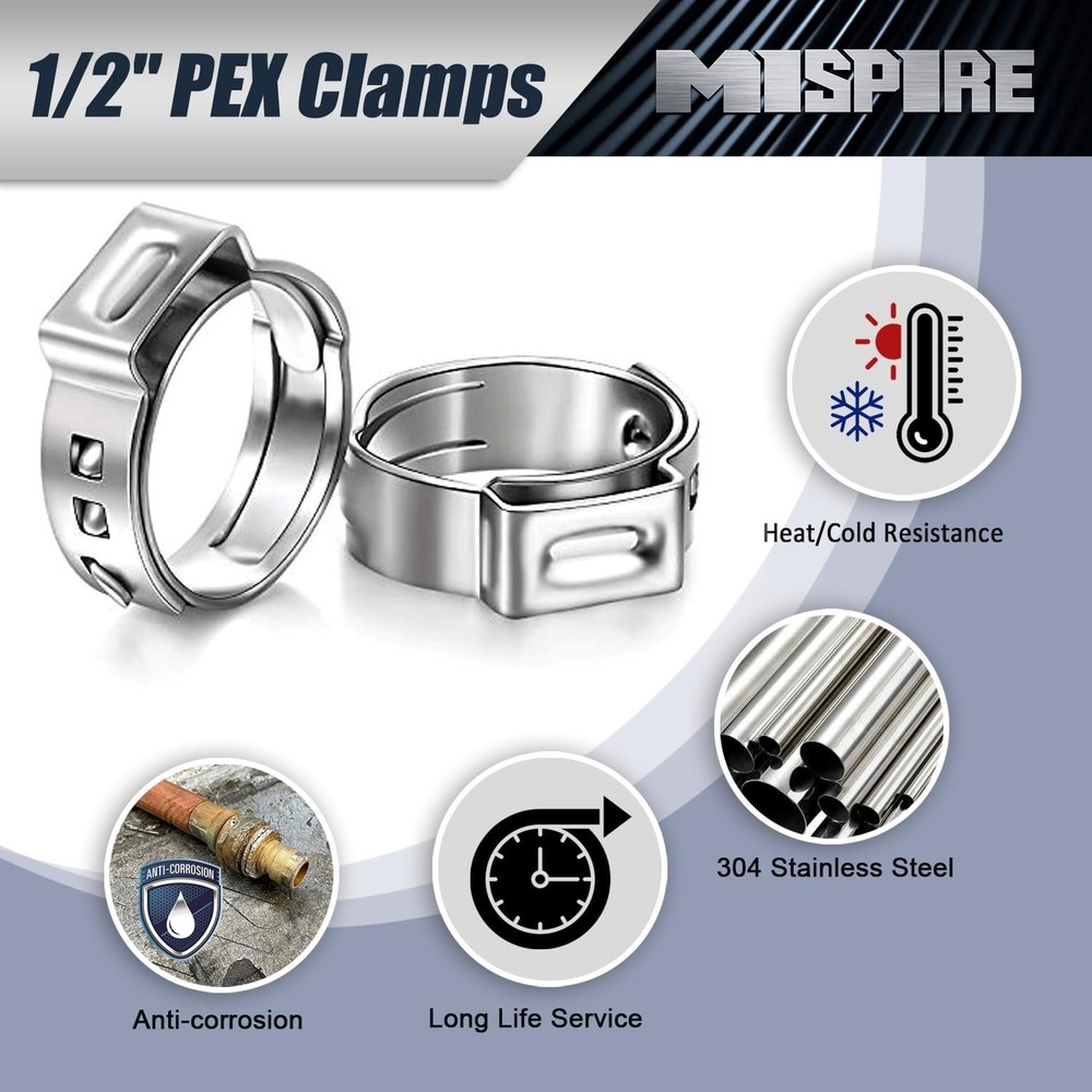 1/2 inch PEX Pipe Clamps 50 PCS, PEX Cinch Clamps Stainless Steel 304 Pinch Clamps for PEX Pipe Tubing Fitting Connections by MISPIRE Product Details Size: 1/2", 50 Pack Brand: MISPIRE MPN: MI-PC-012-50 UPC: Does not apply EAN: Does not apply Material: Stainless Steel Brand: MISPIRE Color: Silver Style: PEX Pipe Clamps Item Weight: 0.2 Kilograms Manufacturer: MISPIRE Manufacturer: MISPIRE Part Number: MI-PC-012-50 Item Weight: 7 ounces Package Dimensions: 7.6 x 5.63 x 1.14 inches Item model number: MI-PC-012-50 Size: 1/2", 50 Pack Color: Silver Style: PEX Pipe Clamps Material: Stainless Steel Shape: PEX Pipe Clamps Item Package Quantity: 50 Included Components: pex clamps Batteries Included?: No Batteries Required?: No Date First Available: September 24, 2023 [Package & Quantity] Pack of 50, 1/2 inch (17.5mm) PEX cinch clamp rings, fit for 1/2 inch PEX pipe. [Premium Quality] -High precision PEX clamps are made of 304 Stainless Steel, has good corrosion resistance, heat resistance, low temperature strength and mechanical properties, a good choice for long-term use. PEX cinch clamps are used to seal various types of pipes. [Leak-Proof & Easy to Use] -These interlocking rings provide a fast and reliable connection of all PEX pipes fittings. Form a complete 360-Degree watertight seal protection. The slide the clamp ring onto the pipe, push the pipe onto the fitting and squeeze it with a clamp tool. Provide a firm, leak-free and reliable crimp joint connection. [Widely Applications] -Widely applications in all plumbing system - Hydronic heating system, air condition system, water heater, Telecommunications electrical plumbing, food pipeline system etc. Providing a strong and reliable crimp fitting application. [Customer Service] Please feel free contact MISPIRE customer service team if any issues, we will do our best to fix the issue you meet.