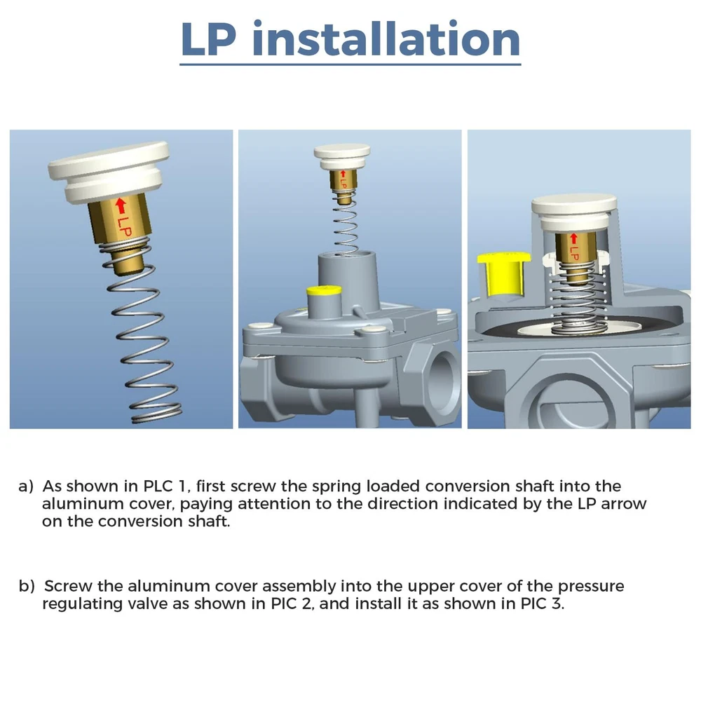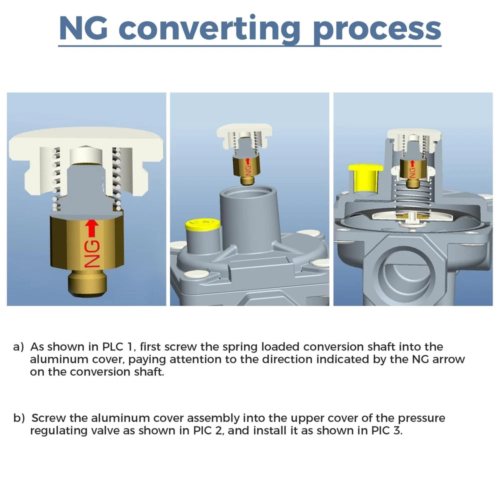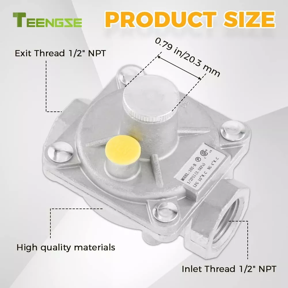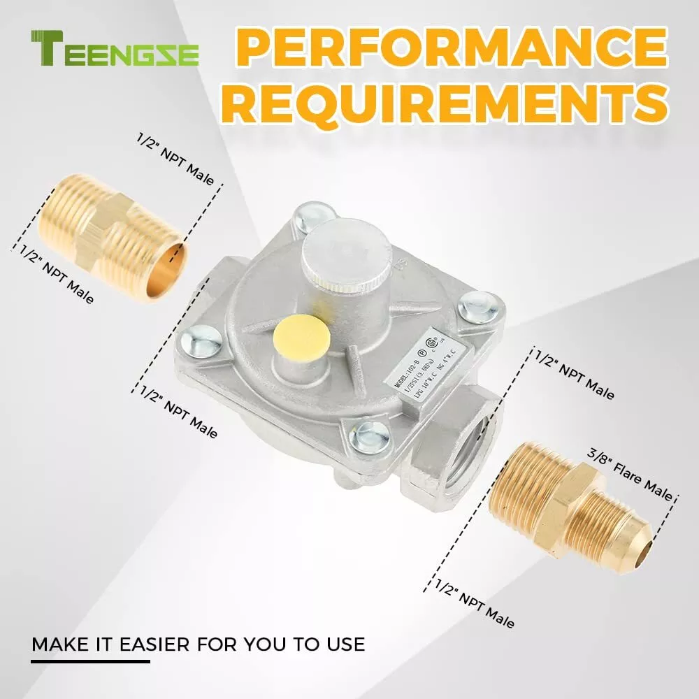 【SPECIFICATIONS】The 1/2 PSI gas regulator of the 102-B model fit for natural gas and liquefied gas valves. Both the inlet and outlet of the valve are 1/2" FPT pipe threads. We additionally furnish a brass 1/2" NPT conversion adapter-1/2" NPT male x 3/8" flare male. 1/2" NPT male x 1/2" NPT male. Plus joint thread tape. 【INSTRUCTIONS FOR USE】When the LPG gas regulating valve is used: LP inlet pressure is 2.74Kpa(11"w.c), outlet pressure is 2.45~2.55 kpa(10"w.c), and gas flow rate is 30L/min; when the natural gas regulating valve is used: LP inlet pressure is 1.74Kpa(7"w.c). Outlet pressure is 0.95~1.05 kpa(4"w.c), flow rate: 50L/min 【CONVENIENCE USE】This gas regulator is adjustable, which can be used for natural or propane application, but original setting is LP state. Please unscrew the 20.3mm diameter aluminum knob in the gas valve to switch the direction of the LP/NG copper shaft core. It is more simple, fast, and convenient. 【PERATE TEMPERATURE】32°F-225°F (0°C-107°C). Do not install the regulator too close to the heating equipment or use in very cold environment. Heat or cold can change the resistance of the spring inside the regulator. And the gas pressure regulator will not turn off the flow of gas. 【APPLICATION】This natural gas pressure regulator fit for natural gas grills, heater, oven, gas welding equipment, NG gas and liquefied interchange pressure regulator, etc.