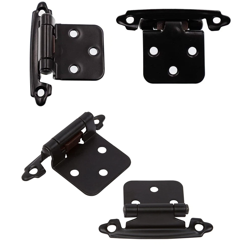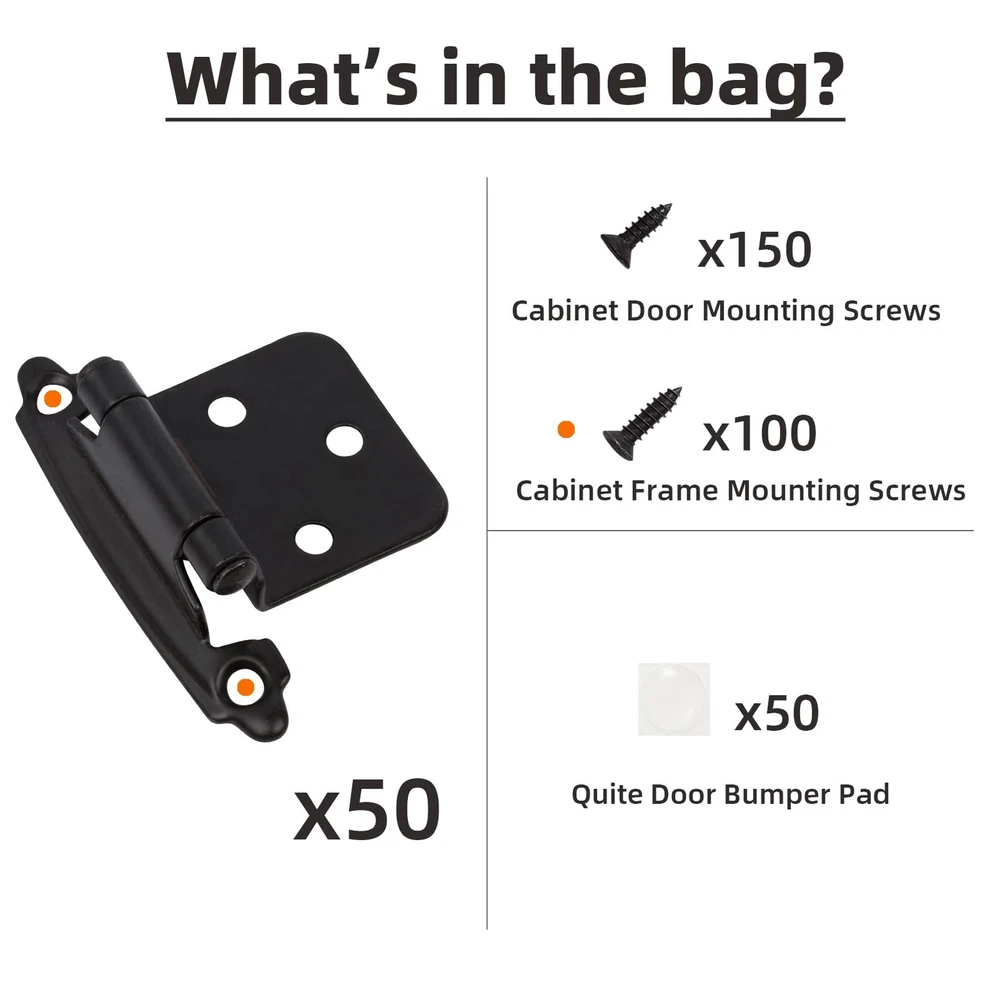 Variable Overlay Hinges: Our Cabinet Hinges are suitable for your overlay cabinet doors in kitchen and bathrooms. Overlay Hinges provide long-lasting durability, a soft closing, and the reinforced strength to outlast even the roughest kitchens or bathrooms. If you plan to replace your cabinet hinges or install your cabinets by yourself, think about cabinet hinges. These could be your best option: Premium thickened metal & sturdy screws are used Standard replacements while at much lower cost Two different attractive colors for choice Upgraded Steel Screws Secure from 5 positions Durable to use Important Note: These are overlay hinges not inset hinges. There is a big difference so please know what you are buying. Overlay means your cabinet door "overlays" (or overlaps) the cabinet frame and thus the door is perfectly flat on both front and back. A type of overlay is a Variable Overlay, these only come in a face mount. These are called Variable Overlay because your door does not have to overlap your frame by a set dimension (such as 1/2in. or so). Package Includes: The cabinet hinges are well packaged in a box: Cabinet Hinges x 25 Pair (50 pcs) Steel Screws x 25 Set UPGRADE YOURS TODAY: These semi-concealed, exposed hinges for cabinets work perfectly on your classic American cabinets. The finish on the black hinges for cabinet doors matches your style of cabinet pulls perfectly. ½ INCH OVERLAY CABINET HINGES. It means your cabinet door "overlays" (or overlaps) the face cabinet frame. The variable overlay self closing cabinet hinges are used for surface mount cabinets in your Kitchens and bathrooms. SELF CLOSING ACTION: These exterior cabinet hinges gives you outstanding functionality and product performance. Your kitchen cabinet door hinges will automatically close under 30 degrees. Silicon dampers also ensure every close is a quiet one. NEWLY UPGRADED HINGE SCREWS. The surface mount black kitchen cabinet hinges come with newly strengthened 5/8 screws to ensure a perfect fit, even using with power tools. Separately packed with silicon cabinet door bumpers for your convenience. BUILT TOUGH FOR AMERICAN FAMILIES. Our black overlay cabinet hinges can take the everyday grind of large families. Thick stainless steel and an electroplated outer coating of black finish mean they are durable, rust-proof kitchen hinge made to last.