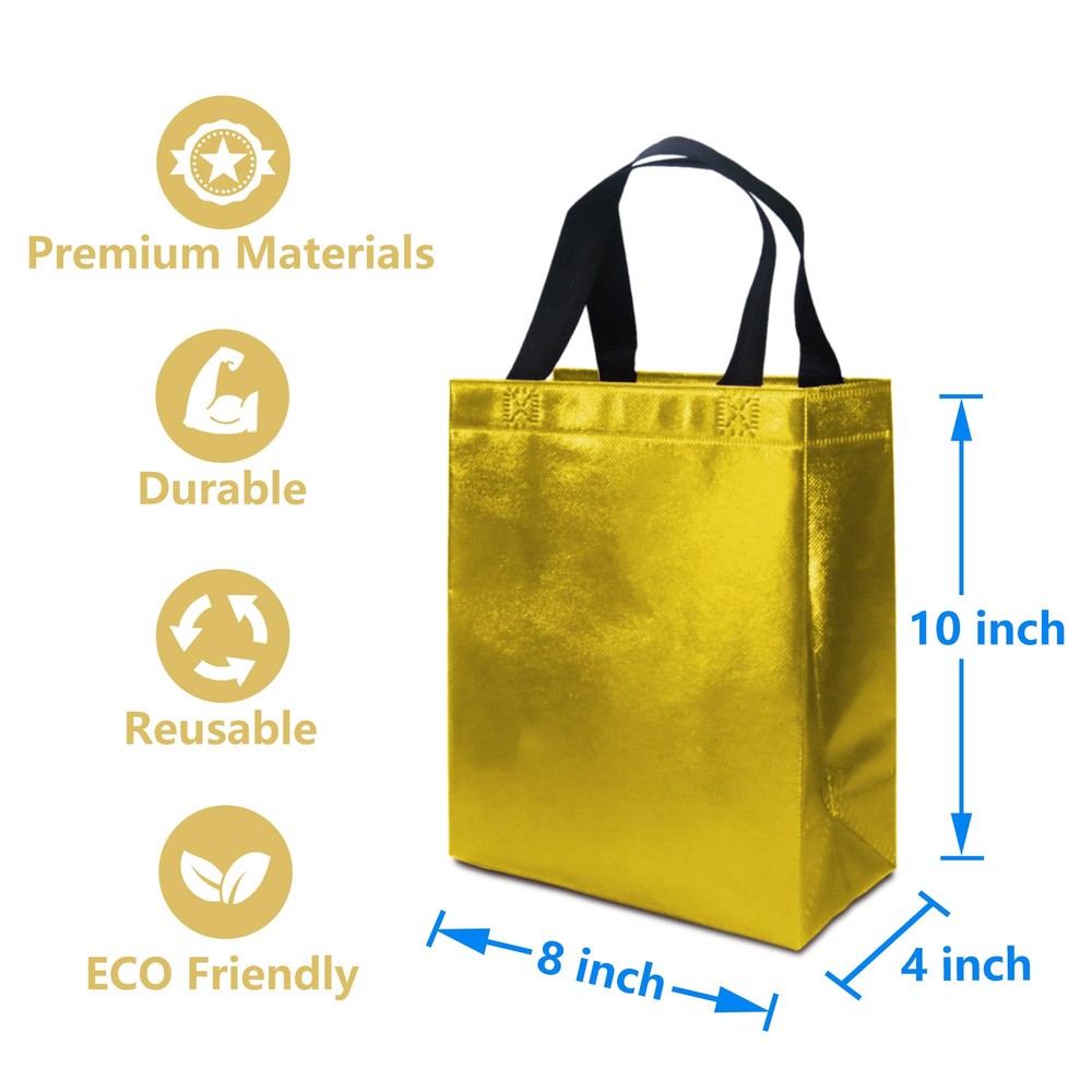 PREMIUM MATERIALS: This gold gift bags are made of high-quality non-woven fabric, so it can withstand heavier weight, stronger and not easy to break. ELEGANT & BEAUTIFUL: This shiny gift bags have a charming metallic luster on the surface, the appearance is beautiful gold, the handle is black, elegant and beautiful, fashionable and exquisite, as a gift bag is absolutely unique and attractive. REUSABLE: This reusable gift bags are made of strong and durable non-woven material, the surface is waterproof, the bottom is matched with cardboard, it can withstand heavier items, while ensuring that the bottom is flat, it can be used daily as a shopping bag, grocery bag, economical and practical. MULTIPLE OCCASIONS: This metallicl gift bags are suitable for various occasions, you can DIY various words and patterns with stickers or paint pens (please stay away from heat sources), which is very suitable for christmas, diwali, wedding, birthdays, party and other occasions. SIZE INFORMATION: The size of the gold gift bags are 8 x 4 x 10 inches/20 x 10 x 25 cm (L x W x H) , it can hold most gifts and enough party supplies.