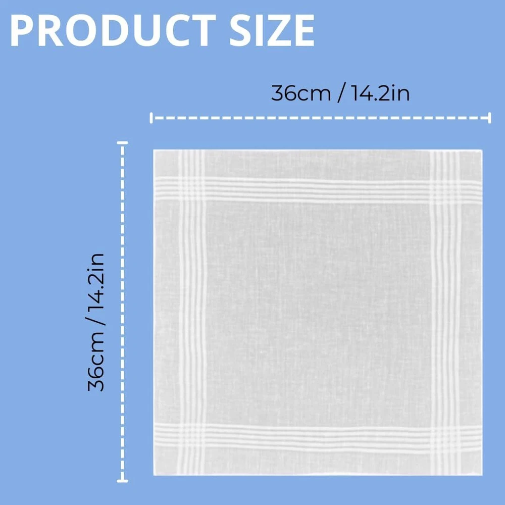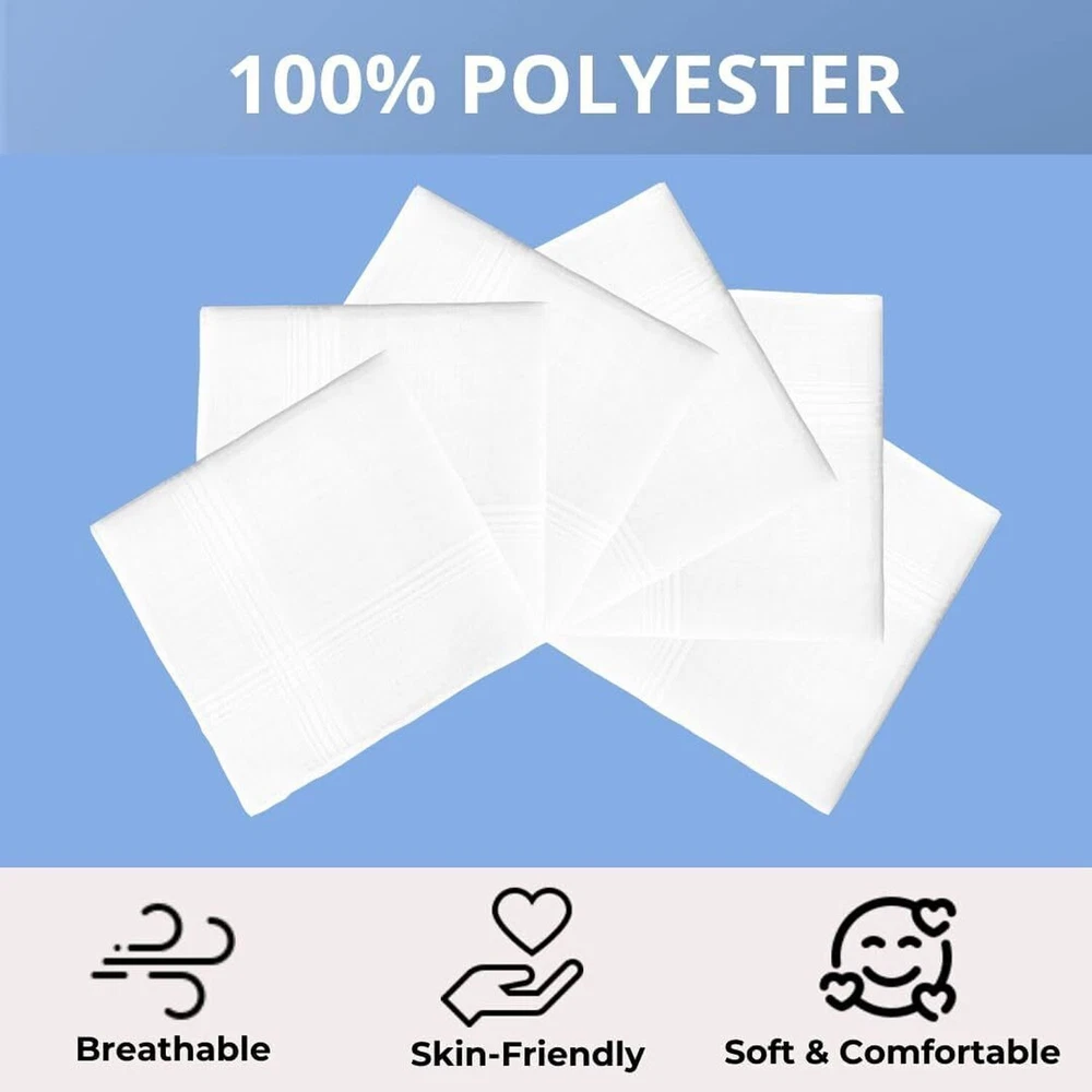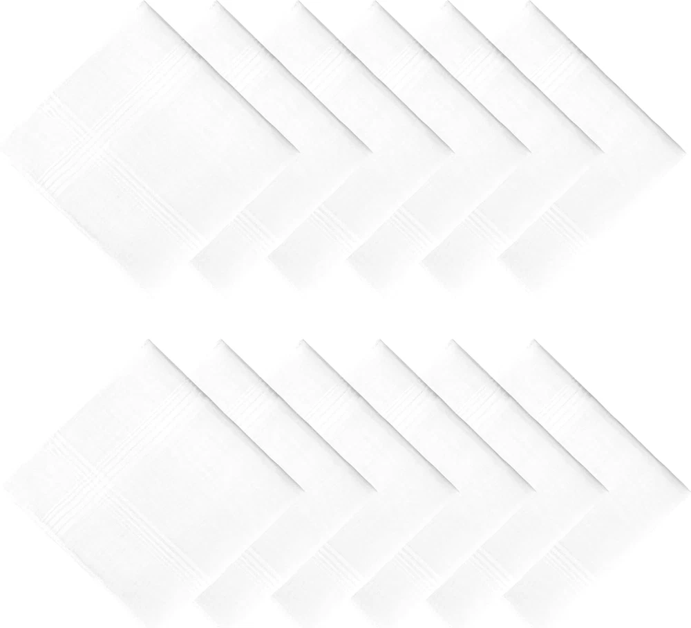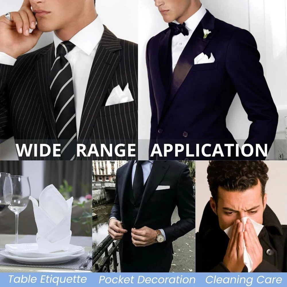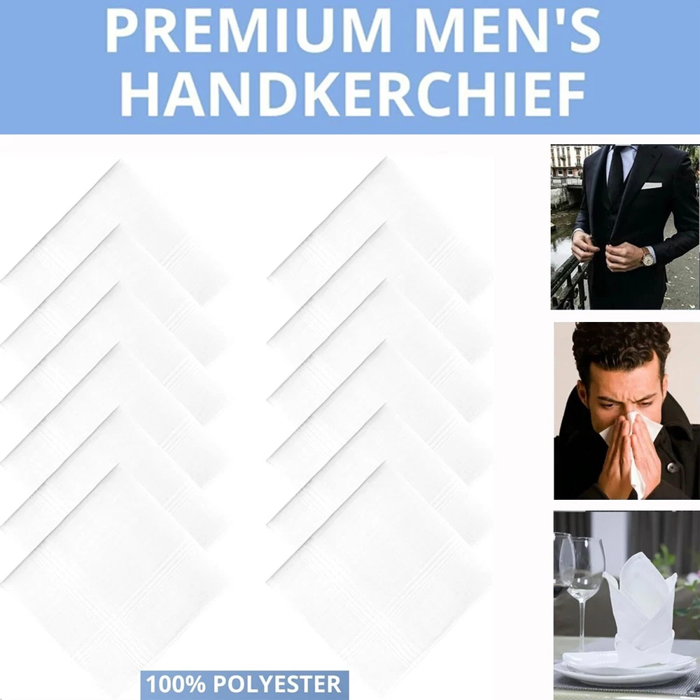 Elegant Appearance -12 pcs white handkerchief sets. Whether for daily use or formal occasions, the solid color appearance is elegant enough, and you can match different costumes for different occasions. Great Partner for Suits - Our classic pocket square handkerchief can be folded into a beautiful shape and placed in the suit pocket, adding charm to your entire outfit and making you more elegant and gentle. Soft Material - The men's handkerchief is made of polyester fiber, which is soft, lightweight, and has stitched edges, making it gentle on the skin and comfortable to touch. Multi Purpose - handkerchiefs are suitable for formal occasions such as dances, weddings, parties, business meetings, dates, graduation ceremonies, and daily life. You can also use these handkerchiefs as decorations or wipe other things. Perfect Gift - A soft handkerchief suitable for both men and women, the perfect gift for grandpas, fathers, sons, friends, or yourself on Father's Day, Christmas, and Thanksgiving. Product Description: Material: polyester Quantity: 12 Size: 14.2in x 14.2in Products include: 12 x Men's Handkerchiefs