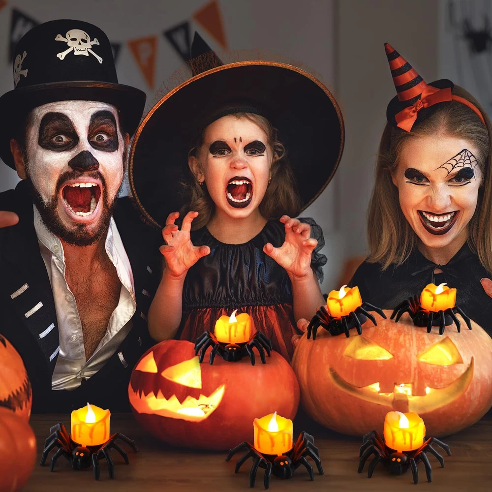 Realistic Spider Design: Black spider with orange tea light design enhances a sense of mystery to your house, invokes a feel for the event. An ideal decor for Halloween creepy themed party, create a spooky yet stylish atmosphere Safe Flameless Tealight: Powered by batteries (included), our spider lights can be used everywhere. Absolutely no mess, no dripping wax, no smoke, no matches, no fire hazards or burning risks, families and children can safely enjoy the light and fun Unique Halloween Decor:Special Spider Shaped Flameless Candles,bright and strange, especially suitable for Halloween and some interesting holiday decorations, parties, etc. This fun decorations can definitely bring a freaky and interesting atmosphere to you and your friends Premium Material: Halloween spider candle light is made of high-quality plastic, the surface is smooth and burr-free, the color is vivid and the light is bright. Also easy to use, equipped with 3 button battery for a long working time, and can be easily replaced Wide Application: Each spider tealight measure 3.4 x 2.8 x 2 inch,can be in the days and nights,Perfect for decorating Halloween Fall Thanksgiving party, gardens, patios, restaurants, bars, trees, tables, fireplace, wreaths, terraces, fences, pillars, centerpieces etc