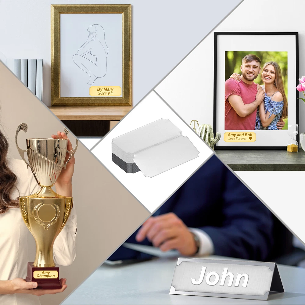 Document Our engraved nameplates are perfect for mounting on plaques, picture frames, sweaters, trophies, bags, display boxes, flag cases, and anything else.SpecificationMaterial: Stainless SteelColor: Silver/BlackSize: 10.2 x 5.1 cm/4 x 2 Inch(L*W)Thickness: 0.4 mm/0.02 InchPacking List: 12 Pcs x Engraved NameplateAdvantageOur engraved nameplates are made of brushed stainless steel which is durable, stable, not easy to fade, rust, or break, and can be used for a long time. With a smooth surface, it will not scratch your skin.The right thickness makes the plate stronger and allows for deeper engraving. These elegant nameplates have a beautiful luster and a simple design. Suitable for various crafts to add brilliance.The protective film design can effectively prevent scratches. The adhesive backing design allows you to stick this nameplate anywhere without any tools and it can be firmly on the objects.InstructionPlace a metal workbench block underneath the blank stamping tags for better stamping.NOTE:1. There may be light scratches and blemishes due to shipping, but they can be polished.2. Only for laser engraving, not suitable for mechanical engraving.3. Please remove the protective film before use. 12 Pcs 4" x 2" Engraved Name Plate Picture Frame Label Art Tag, Silver/Black Our engraved nameplates are perfect for mounting on plaques, picture frames, sweaters, trophies, bags, display boxes, flag cases, and anything else. Specification Material: Stainless Steel Color: Silver/Black Size: 10.2 x 5.1 cm/4 x 2 Inch(L*W) Thickness: 0.4 mm/0.02 Inch Packing List: 12 Pcs x Engraved Nameplate Advantage Our engraved nameplates are made of brushed stainless steel which is durable, stable, not easy to fade, rust, or break, and can be used for a long time. With a smooth surface, it will not scratch your skin. The right thickness makes the plate stronger and allows for deeper engraving. These elegant nameplates have a beautiful luster and a simple design. Suitable for various crafts to add brilliance. The protective film design can effectively prevent scratches. The adhesive backing design allows you to stick this nameplate anywhere without any tools and it can be firmly on the objects. Instruction Place a metal workbench block underneath the blank stamping tags for better stamping. NOTE: 1. There may be light scratches and blemishes due to shipping, but they can be polished. 2. Only for laser engraving, not suitable for mechanical engraving. 3. Please remove the protective film before use. Hot Item Payment 1.We accept eBay payment . 2.Payment must be received within 7 business days of auction closing. Shipping 1.We ship to your eBay or Paypal address. Please make sure your eBay and Paypal address is correct before you pay. 2.Items will be shipped within 1-3 business day when we received payment. 3.Delivery time depends on destination and other factors. Description Policy 12 Pcs 4" x 2" Engraved Name Plate Picture Frame Label Art Tag, Silver/Black Our engraved nameplates are perfect for mounting on plaques, picture frames, sweaters, trophies, bags, display boxes, flag cases, and anything else. Specification Material: Stainless Steel Color: Silver/Black Size: 10.2 x 5.1 cm/4 x 2 Inch(L*W) Thickness: 0.4 mm/0.02 Inch Packing List: 12 Pcs x Engraved Nameplate Advantage Our engraved nameplates are made of brushed stainless steel which is durable, stable, not easy to fade, rust, or break, and can be used for a long time. With a smooth surface, it will not scratch your skin. The right thickness makes the plate stronger and allows for deeper engraving. These elegant nameplates have a beautiful luster and a simple design. Suitable for various crafts to add brilliance. The protective film design can effectively prevent scratches. The adhesive backing design allows you to stick this nameplate anywhere without any tools and it can be firmly on the objects. Instruction Place a metal workbench block underneath the blank stamping tags for better stamping. NOTE: 1. There may be light scratches and blemishes due to shipping, but they can be polished. 2. Only for laser engraving, not suitable for mechanical engraving. 3. Please remove the protective film before use. Hot Item Payment 1.We accept eBay payment . 2.Payment must be received within 7 business days of auction closing. Shipping 1.We ship to your eBay or Paypal address. Please make sure your eBay and Paypal address is correct before you pay. 2.Items will be shipped within 1-3 business day when we received payment. 3.Delivery time depends on destination and other factors.
