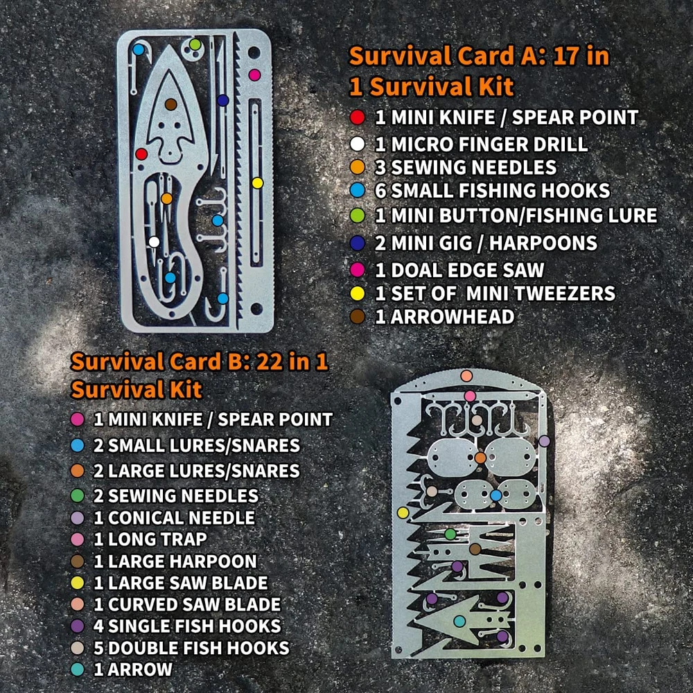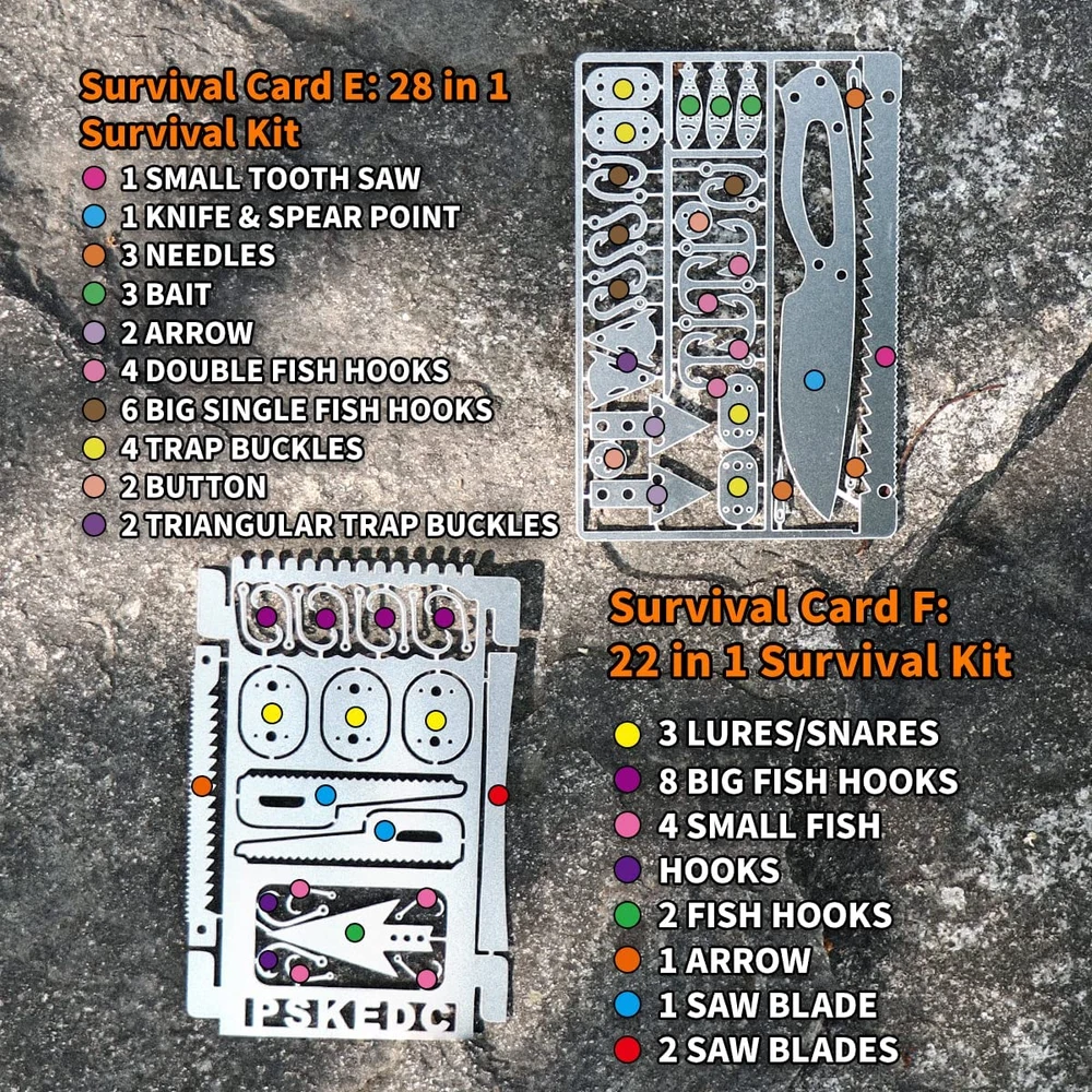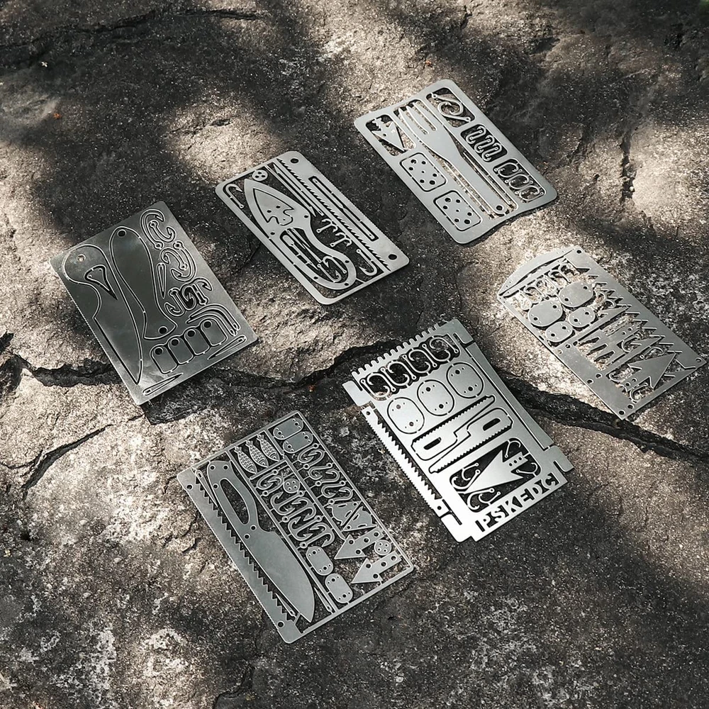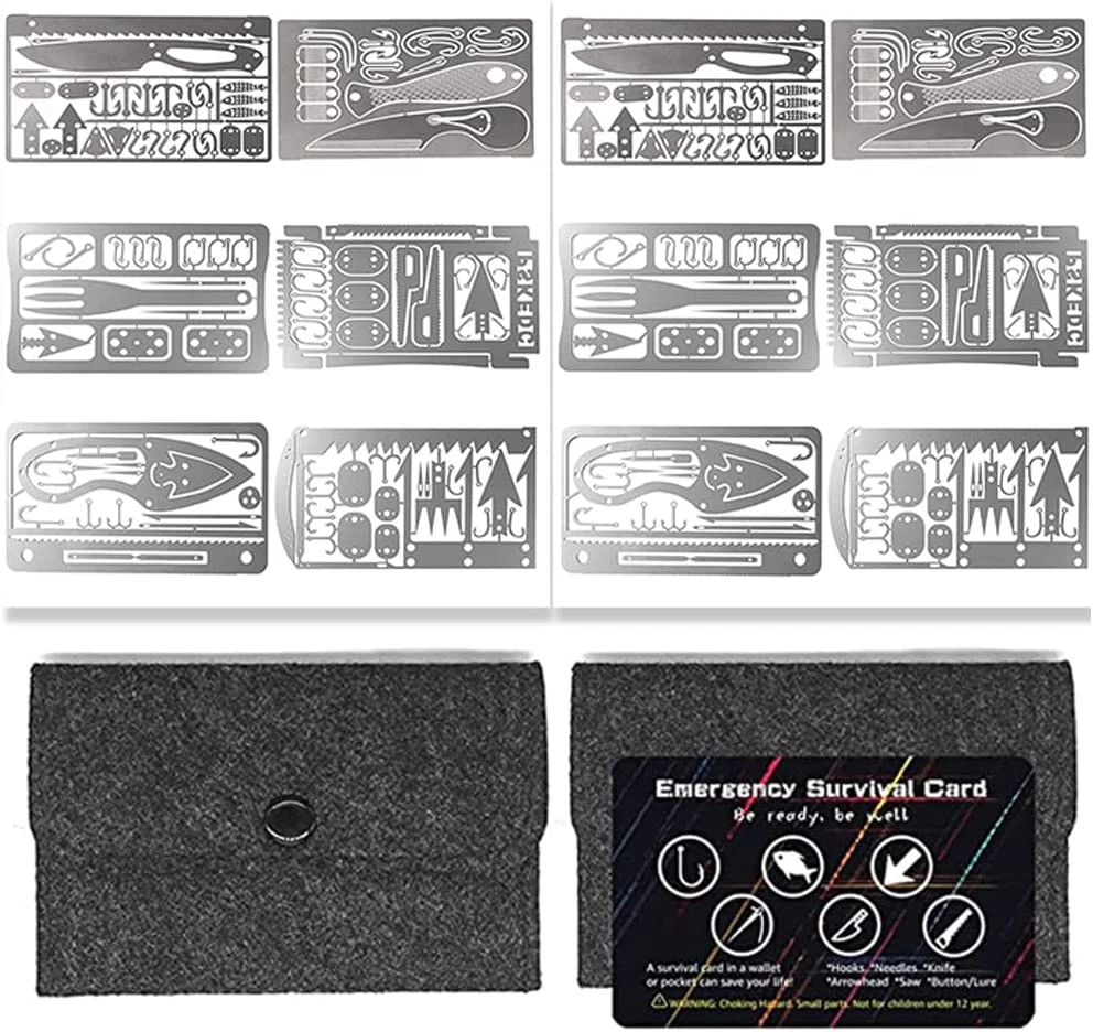 Lightweight survival card brings together a variety of fishing and hunting tools, clever combination of multiple cards. Average only 0.56 oz per piece and no bigger than the size of a credit card, fits right in your wallet. Made of 304 stainless steel, hardened and corrosion resistant, contains a variety of emergency tools. WIDELY USE: This survival credit card is used for many ways: camping, hiking, fishing, hunting, training for emergency, wilderness survival, and other adventure activities. GOOD Gear: This survial credit card is a good gear for family member and friends. Product Description MULTI-TOOL CARD DESIGNED FOR WILDERNESS SURVIVAL 12 PCS Cards Lightweight cards bring together a variety of fishing and hunting tools, clever combinations of multiple CARDS. It has the function of life-saving saws, sewing needles, arrows, fish hooks, snares, awl, and tweezers. This survival credit card is the best choice for wilderness survival, fishing, hunting, Gear, and Hiking. Card Case Size: 12.5/4.9in x 8.3cm/3.3in Material: Felt The net weight of cards is 65g and the thickness is only 0.6mm, comes with a card case. It is the size of a credit card and easy to carry fits in a Wallet / Pocket, Keep Them In Your Car or Emergency Supplies. Survival Credit Cards - Essential In An Emergency Material: 304 Stainless steel Color: Silver Type: Pocket-sized, multi-function tool Features: portable, durable, lightweight, multi-functional Suitable for: camping, hiking, fishing, hunting, outdoor sports