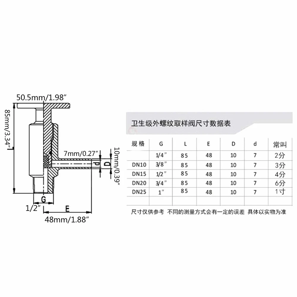 1/2�� Sanitary Sampling Valve Stainless Steel Handle Sampler Fit Water Oil Pipes 1/2” Sanitary Sampling Valve Stainless Steel Handle Sampler Fit Water Oil Pipes Specification: Material: Stainless Steel 304 Colour: Sliver Size:φ50.5*85mm Operating Temperature: - 10 ~ 40 ℃ Scope of Application: Sanitary Water Pipes, Oil Pipes, Wine Cans, Etc Features: 1.High Temperature and Corrosion Resistance 2. Strong Sealing 3.Long Service Life Package Included: 1×Valve Note: Please Allow 1-3mm Differs Due to Manual Measurement. Due to the Different Display and Different Light, the Picture May Not Reflect the Actual Color of the Item. Thanks for Your Understanding. Payment Delivery details Terms of sales About us Contact us Payment We accept ebay payment 。 Fees such as import duties, taxes are not included in the item price or shipping costs. These charges are the buyer's responsibility. Delivery details Shipping: 2-9 working days to: USA Terms of sales We maintain high standards of excellence and strive for hundred percent customer satisfaction. Feedback is very important to us. We hope that you contact us immediately before you give neutral or negative feedback, so that we can address your concerns. It is impossible to address issues if we do not know about them! About us Your satis faction is our ultimate goal. We work hard to earn your trust and future business. Our certified technicians have tested each item before shipping. The unit comes with 1 year limited warranty on all manufacturing defects. a) If you receive a defective item, you may return it or ask for a discount. Please contact us within 14 days after you receive the package. b) What you returned must be intact and in its original packaging as re? u. Customer is responsible for shipping costs of the returned item. c) We will cover the cost of shipping back t with the shipping rate indicated in the registration page. We will send you a new unit or refund the full payment you paid. Thank you. Contact us Business Hour Business Hour: Monday To Friday: 8:30 AM to 5:00 PM (Beijing China time) Due to time zones, our reply to your questions may not be immediately. But within above working time, we will reply your email within 24 hours. If it's non-workdays, please kindly be patient and wait till Monday. Please contact us with ebay message. Please feel free to contact us if you have any questions. Monday To Friday: 8:30 AM to 5:00 PM (Beijing China time) Due to time zones, our reply to your questions may not be immediately. But within above working time, we will reply your email within 24 hours. If it's non-workdays, please kindly be patient and wait till Monday. Please contact us with ebay message. Please feel free to contact us if you have any questions. Brand Unbranded Material Stainless steel 304 Colour Sliver Size φ50.5*85mm Operating temperature - 10 ~ 40 ℃ Scope of application sanitary water pipes, oil pipes, wine cans, etc Features High temperature and corrosion resistance, Strong sealing, Long service life MPN Does Not Apply Valve Operation See Item Description UPC does not apply On Feb 20, 2025 at 00:28:14 PST, seller added the following information: