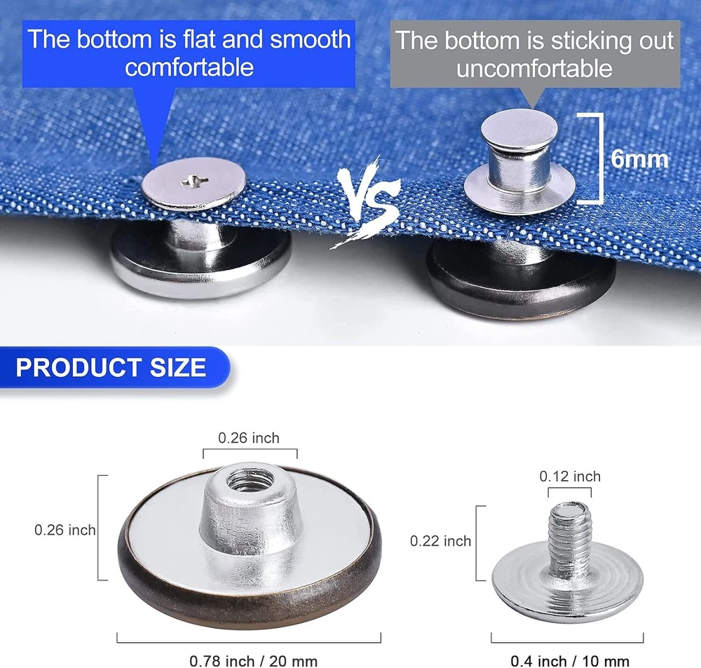 12 Sets Adjustable Buttons for Jeans 20Mm No Sew Instant Replacement Repair Kit SUPER STRONG AND DURABLE: Our metal buttons for jeans is made of high-quality zinc alloy, which is durable, rust and corrosion resistant. The no sewing jean button uses threaded connection to install simple and firm, and can be detached and reused. UPGRADED THREAD DESIGN: Our replacement jean buttons is connected by threaded design screws, which are more durable than adjustable jeans button pins styles, will not bend, and there is no hidden danger of being stabbed, comfortable and safe. PERFECT FIT BUTTON & ADJUSTER FOR PANTS WAIST: When you pants size too tight or too loose, add extra buttons to extend or reduce pants size, make the pants bigger or smaller. Let you say goodbye to the belt, comfortable all day WIDELY UESD: The button pins for jeans can not only replace old buttons, but also use to jeans, overalls, denim bags, skirt, jackets, suits, corduroy pants, coats, work clothes, crafts and mask button clip on hats. Gifts for family and friends YOU WILL GET JEAN BUTTONS SEWING KIT: 12pcs 20mm large button caps, 12pcs Thread rivets, 1pcs Screwdriver. Bronze letters pattern, retro all-match. The bottom of the jeans buttons is flat and smooth without sticking out, comfortable and safe. Shipping We offer FREE shipping on all orders! We ship within Three business days of payment, usually sooner. We use a selection of shipping services such as UPS, FedEx, USPS etc. We only ship to the lower 48 states, no APO/FPO addresses or PO Boxes allowed. Local pickups and combined shipping options are not provided at this time. Return You can return a product for up to 30 days from the date you purchased it. Any product you return must be in the same condition you received it and in the original packaging. Please keep the receipt. Customer satisfaction is very important to us. If you have any problem with your order, please contact us and we will do our best to make you satisfied. Contact Us If you have any queries, please contact us via ebay. We usually respond within 24 hours on weekdays. Please visit our eBay store to check out other items for sale! Thank you for shopping at our store.