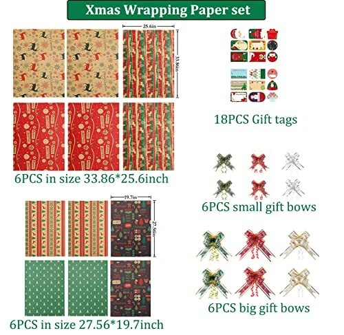 Return Policy Fast Delivery Trusted seller 12 Sheets Christmas Wrapping Paper Set(6 Large&6 Small, 59 Sq. Ft. Ttl) with 12PCS Gift Bows and Labels - Vintage Red Green Xmas Holiday Kraft Present Wrap Paper Product Description Convenient Gift Wrap Set - Including 12 sheets of wrapping paper, 12 PCS gift bows(Need to be assembled) and 18PCS Xmas name tag stickers. Total 59 Square Feet. - 6 sheets are 33.86*25.6inch (Suitable for medium gift like shoebox), and 6 sheets are 27.56*19.7inch (Suitable for small gifts). Six Holiday Designs - Contain many pretty & fancy festive elements such as elk, red Xmas ornaments, merry Christmas, green Christmas tree and snowflake. Premium Thick Kraft Paper - The matching Christmas wrapping paper is crafted from high-quality brown paper, is eco friendly and recycled, they will dress up your present beautifully. Decorate Your gifts festive - The premium material and well-printed of the paper will make your gift look nice. Suitable for wrapping gifts for your boys or girls or other family members. Shipping Returns Payment Shipping Shipping is FREE to all addresses other than APO/PO boxes in the lower 48 states. All our stock ships from US-based warehouses. Shipped via USPS or UPS (depending on location and package weight) Unless stated otherwise, all orders will ship within 24-72 hours of your payment being processed. Check our feedback to see the great reviews of FAST shipping we offer. Returns Seller does not accept returns Payment We currently accept payment via eBay managed payments only. Once payment is cleared, we will dispatch your shipment within 1-3 business days. Please refer to the "Shipping" tab for more information regarding shipping speed to your destination.