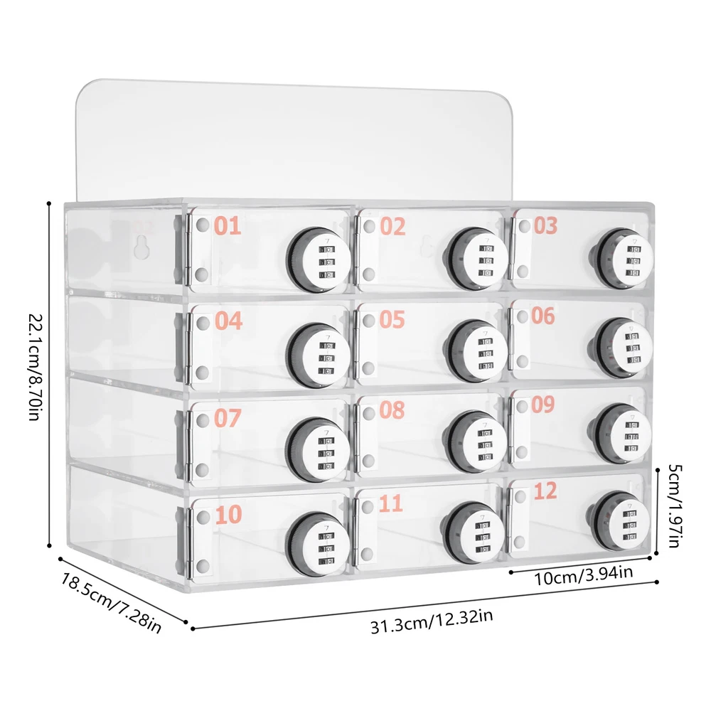 12 Slots Cell Phone Locker Box Transparent Acrylic Storage Box W/Locks TOP Description In this digital age, our mobile phones are not only a communication tool for everyone, but also a personal asset. That's why this mobile phone locker is designed to protect your favorite phone. It offers password protection, so you can rest assured that your mobile phone is safe and secure from theft and accidental damage. Its large-capacity design not only stores your mobile phone properly but also organizes keys, headphones, and other small items, keeping the space in order. Give your mobile phone a five-star home by choosing our mobile phone locker. Key Features Build to Last: The product is made of high-quality acrylic, using polishing technology, with high strength, wear resistance , and long service life. Safe and Secure: The three-digit combination lock has 1000 different combinations, providing a high level of confidentiality, keeping your mobile phone safe at all times, and also avoiding the hassle of carrying or losing your keys all the time. Large Capacity: Each of the 12 compartments measuring 1.97*3.94*7.09 inch es can not only store multiple mobile phones, but also keys, cards and other small items. It is suitable for storing 99% of mobile phone models on the market. Thoughtful Design: Each storage compartment has its number identification (1-12), allowing you to quickly pinpoint the location of your mobile phone. The clear body of the box makes it easy for you to observe the condition of your mobile phone and other items, avoiding accidents such as accidental taking. Productive Environment: With our mobile phone locker for storing mobile phones and wallets, you can stop letting your mobile phone cause a distraction during classes, meetings or sports, allowing your team to focus and create a productive environment. Easy Installation: Upon receipt, you do not need to assemble it to use it. The pre-drilled holes on the back of the product and the provided screws allow you to mount this product on the wall for your different needs. Easy to Clean: The smooth surface and simple structure allow you to easily clean it with a towel. Space-saving: I t has a small footprint (12.32*7.28* 8.7 inches) and can be placed on the desk without delaying the rest of your work. Customer Service: We aim to provide high-quality products and services. If you have any questions, please feel free to contact us. We will reply as soon as possible and solve the problem for you. Details Top Board: It gives you extra space to post reminder signs and more. Rectangular Base: It enables the product to stand steadily on the desktop. Application This product is ideal for use in classrooms, exam rooms, gyms, conference rooms, factories, labs, libraries, and more. How to Change a Password 1. Open the door and change the password to the initial password: 000 2. If the code is correct, press the metal (not included) against the right side of the lock hole. 3. Hold the right lock hole with metal while turning the numbers to the code you need. 4. After the password is changed, release the metal on the right side of the lock hole, and you are done. Specifications Style: Modern Shape: Rectangular Color: Clear Material: Acrylic Surface Treatment: Polishing Mount Type: Wall Mount, Tabletop Assembly Required: No Thickness: 3.5 mm/0.14 in Number of Compartments: 12 Lock Type: Combination Lock Weight: 3.4kg/ 7.49 lbs Net Weight: 3kg/ 6.61 lbs Product Size: 31.3*18.5*22.1 cm/12.32*7.28* 8.7 inch Each Compartment Size: 5*10*18cm/1.97*3.94*7.09 inch Package Size: 39*26*30cm/ 15.35*10.24* 11.81 in Package Included 1* Mobile Phone Locker Other Accessories Required for Installation Notes Please keep in mind your unlock code and storage location. Please note this product does not include other items. Please pay attention to the size before purchasing. Please allow the slight color difference caused by the shooting light and 1-3cm error due to manual measurement, and make sure you do not mind before you order. Payment Delivery details Terms of sales About us Contact us Payment We accept ebay payment 。 Fees such as import duties, taxes are not included in the item price or shipping costs. These charges are the buyer's responsibility. Delivery details Shipping: 2-9 working days to: USA Terms of sales We maintain high standards of excellence and strive for hundred percent customer satisfaction. Feedback is very important to us. We hope that you contact us immediately before you give neutral or negative feedback, so that we can address your concerns. It is impossible to address issues if we do not know about them! About us Your satis faction is our ultimate goal. We work hard to earn your trust and future business. Our certified technicians have tested each item before shipping. The unit comes with 1 year limited warranty on all manufacturing defects. a) If you receive a defective item, you may return it or ask for a discount. Please contact us within 14 days after you receive the package. b) What you returned must be intact and in its original packaging as re? u. Customer is responsible for shipping costs of the returned item. c) We will cover the cost of shipping back t with the shipping rate indicated in the registration page. We will send you a new unit or refund the full payment you paid. Thank you. Contact us Business Hour Business Hour: Monday To Friday: 8:30 AM to 5:00 PM (Beijing China time) Due to time zones, our reply to your questions may not be immediately. But within above working time, we will reply your email within 24 hours. If it's non-workdays, please kindly be patient and wait till Monday. Please contact us with ebay message. Please feel free to contact us if you have any questions. Monday To Friday: 8:30 AM to 5:00 PM (Beijing China time) Due to time zones, our reply to your questions may not be immediately. But within above working time, we will reply your email within 24 hours. If it's non-workdays, please kindly be patient