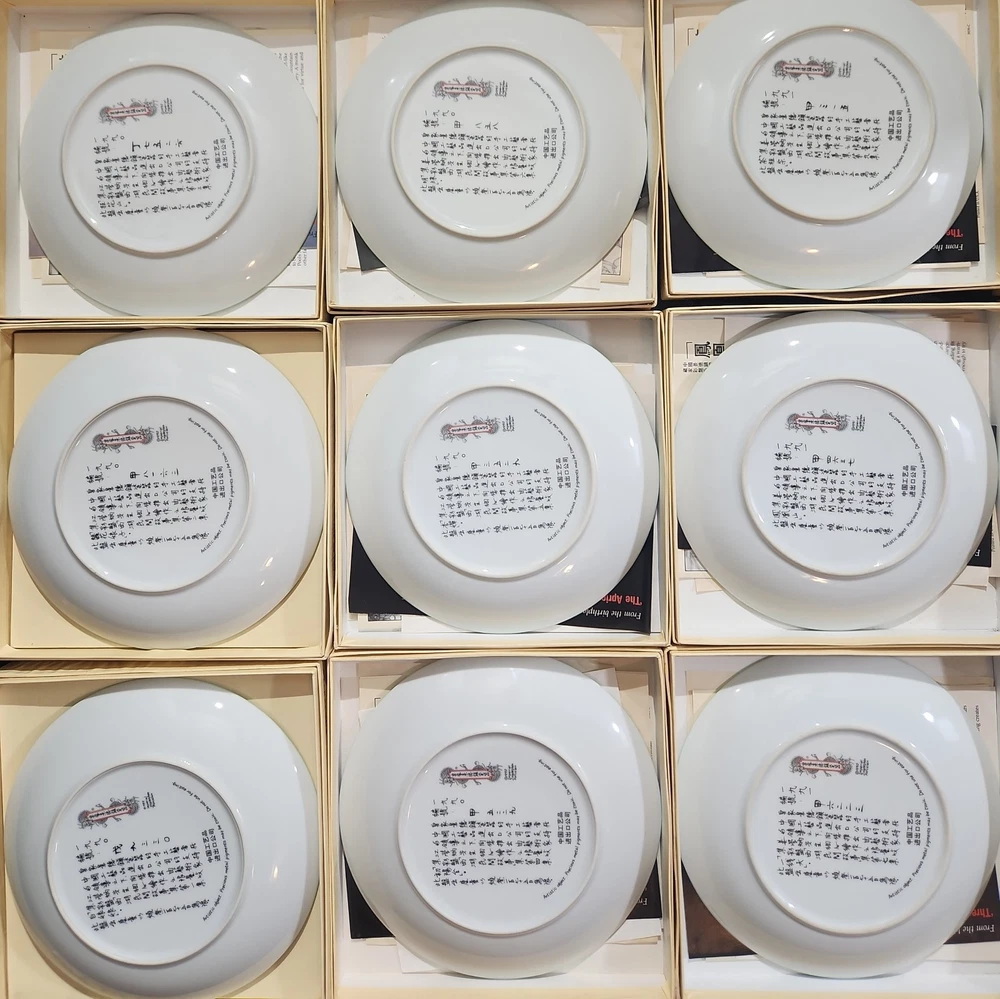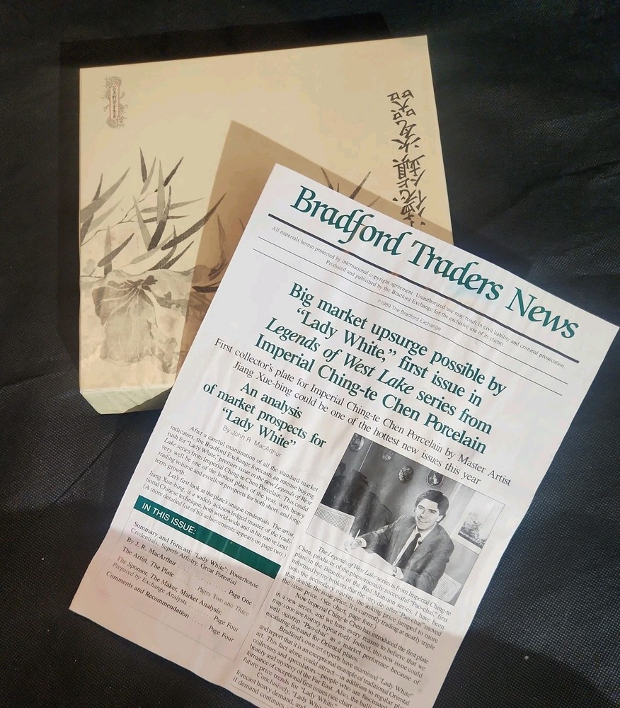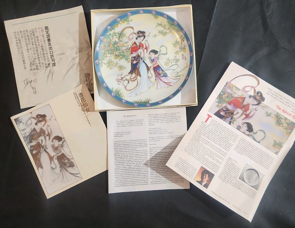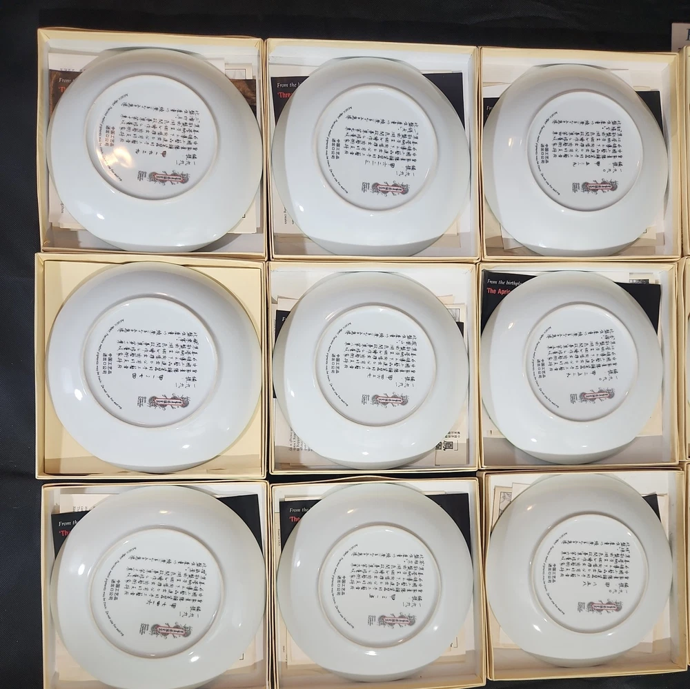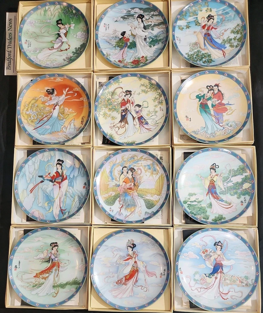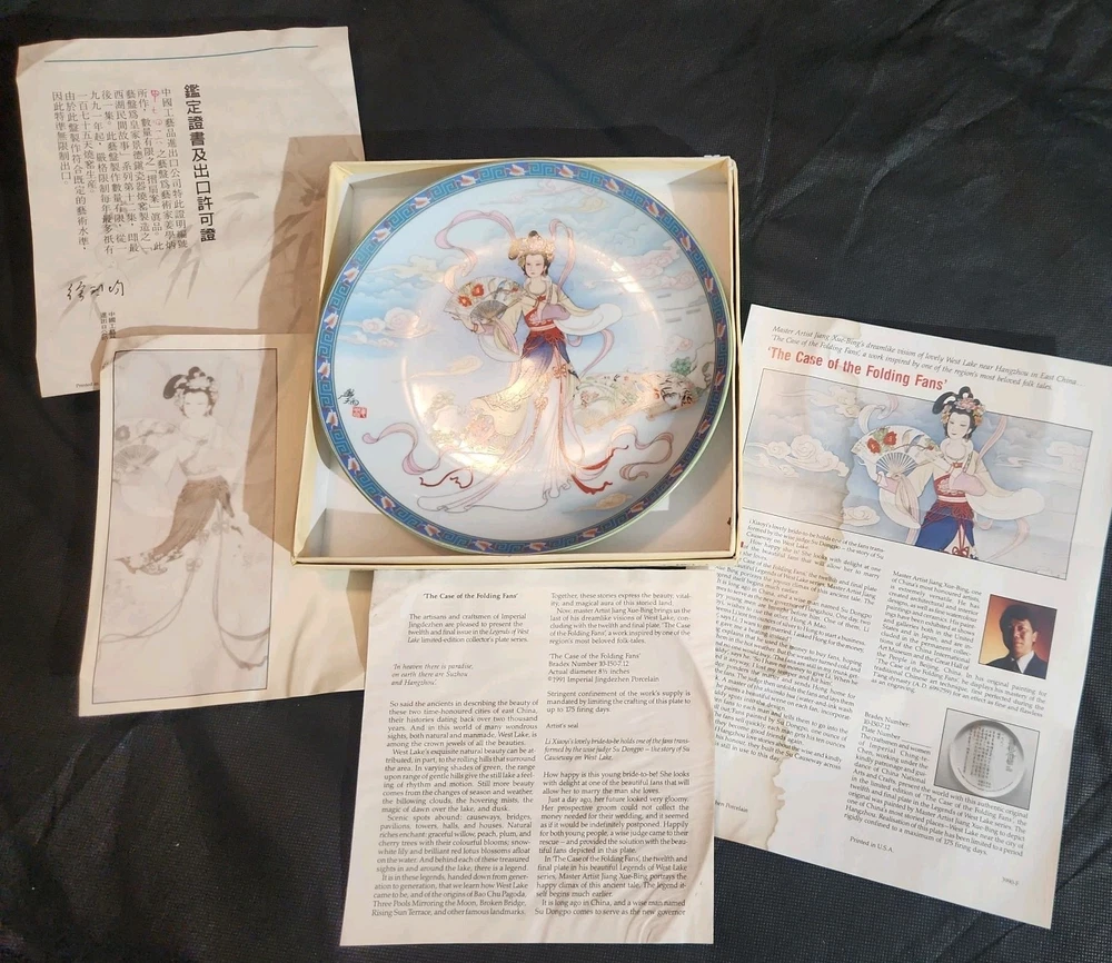 The product is a set of 12 round Imperial Jingdezhen porcelain collector plates from the Legends of West Lake series. These antique vintage decorative plates feature a bordered pattern drawn by the Master Artist Jiang Xue-Bing in full colour on fine Imperial Ching-te Chen porcelain. In this series you will find: Lady White Lady Silkworm Laurel Peak Rising Sun Terrace The Apricot Fairy Bright Pearl Thread of Sky Phoenix Mountain Ancestors of Tea Three Pools Mirroring the Moon Fly-in Peak and Case of the Folding Fans. Each depicting scenes from West Lake in China. Each plate comes with its original box, certificate of authenticity, and informational pamphlet in both English and Chinese which is almost unheard of it is so rare. The set was produced in China in the late 20th century, making it a unique and collectible addition to any display. This is a flawless complete set of all 12 Imperial Jingdezhen Porcelain "Legends of West Lake" plates that have never left their original boxes. Bradex Numbers 10-150-7.1 / 10-150-7.12 Please look at all pictures, some of the boxes and colored informational packets have some discoloration or are not in pristine condition. All plates are in pristine condition.