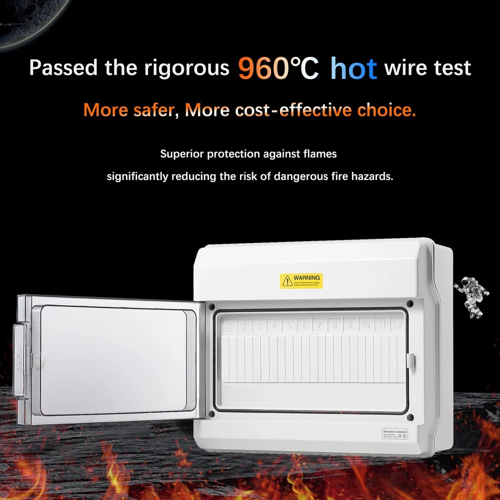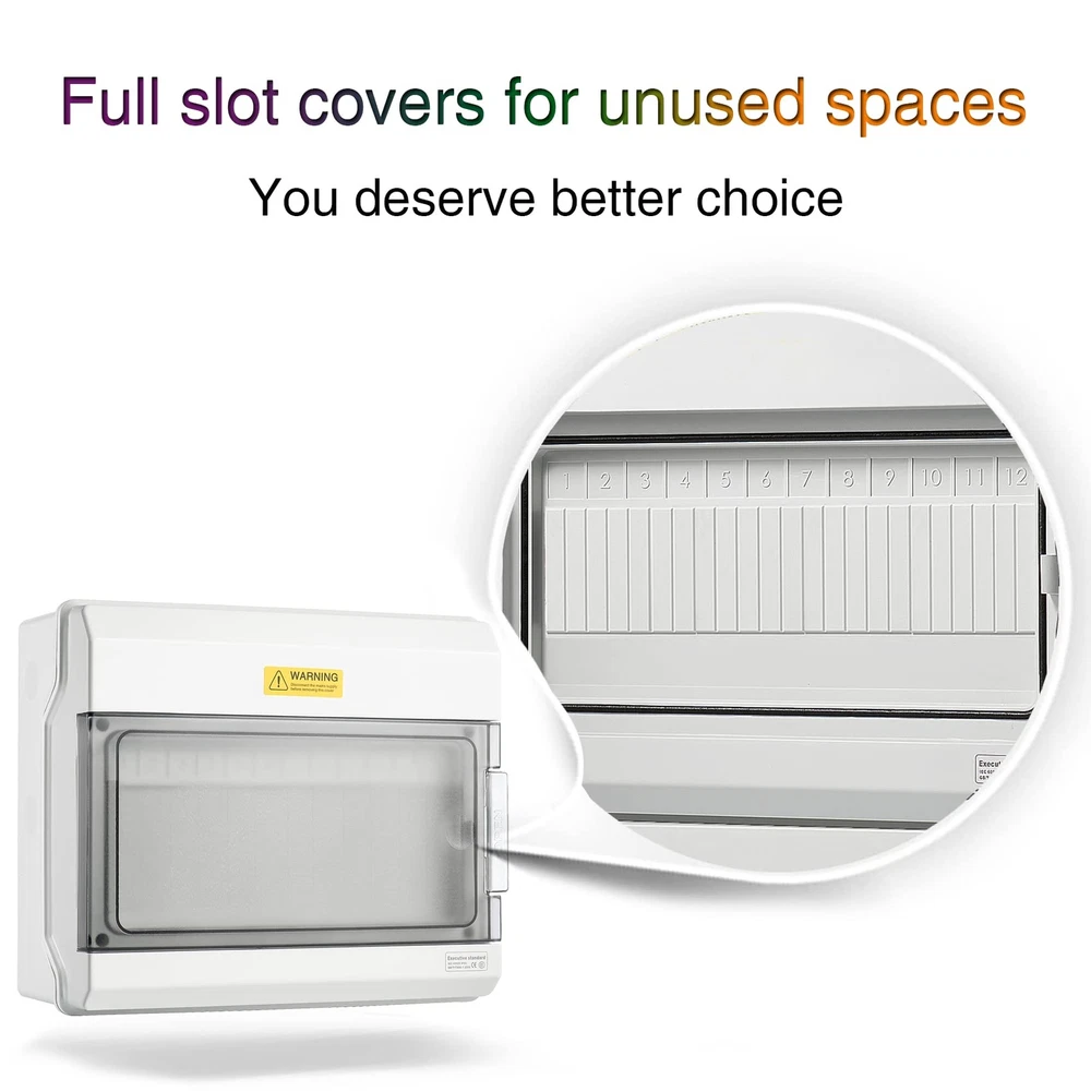 Description IP65 Waterproof Home Electric Vehicle Charger Box Specifications * Way: 12 way * Material: PC plastic * Waterproof Rating: IP65 * Size: 273x230x110mm/(10.7"x9"x4.3") Application Electric Vehicle Charger, Communication, Firefighting, Lighting, etc 【SUPERIOR FIRE SAFETY】- The material for this circuit breaker box has been upgraded to the finest V0 PC/ABS alloy plastic now, which has demonstrated flame resistance through a rigorous 960℃ hot wire test. This premium material provides enhanced durability, superior resistance to high temperatures and pressures, and longevity that's second to none. It's the perfect solution for high-end projects that demand the highest-quality equipment. 【FULL SLOT COVERS】- upgrades all outdoor breaker boxes with full slot sovers for snused spaces. This ensures protection from electrical shock, prevent the accumulation of dust and debris and reduce the risk of damage to the electrical components. 【BUS BARS INCLUDED】- Easy for neutral and ground wiring, made from high quality copper to ensure a good conductivity, safety and reliable for your applications. 【IP65 GRADE】- The power distribution boxes are waterproof & weatherproof designed, effectively block splashing water, rain, dust, snow, oil, UV rays and more. You can rest assured to use the box in both indoor and outdoor applications. 【EFFORTLESS SETUP, EXTENSIVE VERSATILITY】- The reserved hole position of our din rail enclosure can help you mount the box to the wall very easily. It can be widely used for solar power systems, electric vehicle charging stations, networks, communication infrastructures, and other utility applications. 【EXTERNAL DIMENSIONS】- 10.7"x9.1"x4.3" (273x230x110mm). Ensure a perfect fit: Please double-check dimensions before purchasing to ensure a seamless match that saves you time and costs. If you have any doubts about the dimensions, please don't hesitate to us. 【UNIQUE SERVICE】- At , we're more than just a brand, we're a community that puts your satisfaction at the heart of everything we do. We understand that perfect experiences are crafted with care, so we offer an exceptional extended after-sale service for effortless returns, even beyond 's return window. Please don’t hesitate to us if you have any issues. Our dedicated after-sale team is here to turn every concern into comfort, ensuring your journey with us is nothing short of perfect. Your voice helps us grow and refine, guiding us to serve you better. 【WHY CHOOSE 】- We're exclusively focused on industrial products, bringing electrifying expertise to your projects. While words can easily be duplicated, true excellence shines through in comparison. Guided by the invaluable insights from our valued customers, we commit to thinking differently, redefining standards of quality and service. Try , you're choosing more than a provider; you're gaining a partner committed to enhancing your efficiency and reducing costs.