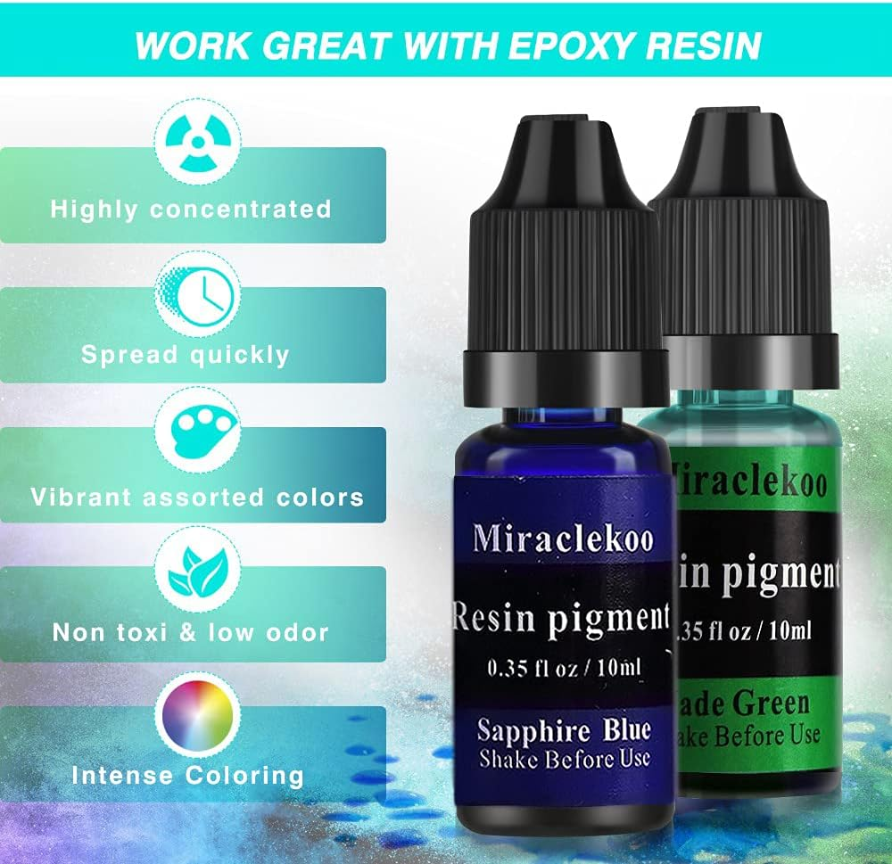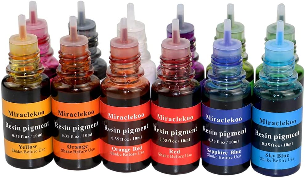 Store New Arrivals Add to Favorite View Feedback 12 Colors Epoxy Resin Color Dye Colorant Liquid Epoxy Resin Pigment,10Ml Each,Translucent Description Item model number 12CEURCDCLP-1 Number of Items 1 Compatible Material resin Color 12 Colors Vivid Brand Miraclekoo Country of Origin China Item Weight 0.35 Ounces Item Form Liquid Product Dimensions 1.57 x 1.57 x 4.72 inches Manufacturer Miraclekoo technology Co., Ltd. HIGH QUALITY – This epoxy resin dye is made of high quality material,non-toxic and non-radioactive.Safe for the environment and you RESIN PIGMENT – This epoxy resin dye kit can be used when working with resin and a little goes a long way.Note:the white one will sink to the bottom,please shake it before use VARIED COLOR AND CAN BE MIXED – This is a resin pigment in the form of liquid. You can mix it with another pigments to achieve the desired color PERFECT FOR ALL CRAFTS AND ARTS – They can be widely used on crafts decorations, nail art, jewelry making, garment accessories, or other DIY making BEAUTIFUL COLORS – White,Black,Sky Blue,Sapphire Blue,Yellow,Orange,Grass Green, Bright green, Orange Red,Red, Pink,Purple Product Description Specification: High-quality Brand new Material: Pigment Color: 12 colors Volume: 10 ML Oily pigment This is a resin pigment in the form of liquid,it is oily. VARIED COLOR AND CAN BE MIXED – This is a resin pigment in the form of liquid. You can mix it with another pigments to achieve the desired color. HIGH CONCENTRATED A little drop can go a long way! TRANSLUCENT&VIVID The range of different colors is great for mixing and creating just about every color you can think of! MIX WELL WITH RESIN Our resin dye mixes wonderfully with epoxy resin ABOUT US We offer the best prices around on high quality products. Our E-store includes media such as books, movies, music and games while offering electronics, toys, sporting apparel, clothing, tools, general home, garden items and more. SHIPPING We are always working hard to ensure your package arrives as soon as possible. Please understand that some factors like weather, high postal traffic, and the performance of shipping companies are outside of our control. We offer free shipping to the lower 48 states and ship within 2 business days of payment, usually sooner. We do not accept P.O. Boxes. Please provide a physical address. RETURNS We offer a 30-Day Return Policy on items which you are not completely satisfied with. You have the option for a full-refund or an exchange of the item. No returns are available on items shipped outside of the USA. PAYMENT We accept PayPal. CONTACT US This page content is yet to come Please ad us to your favorite seller and visit again later Thank You