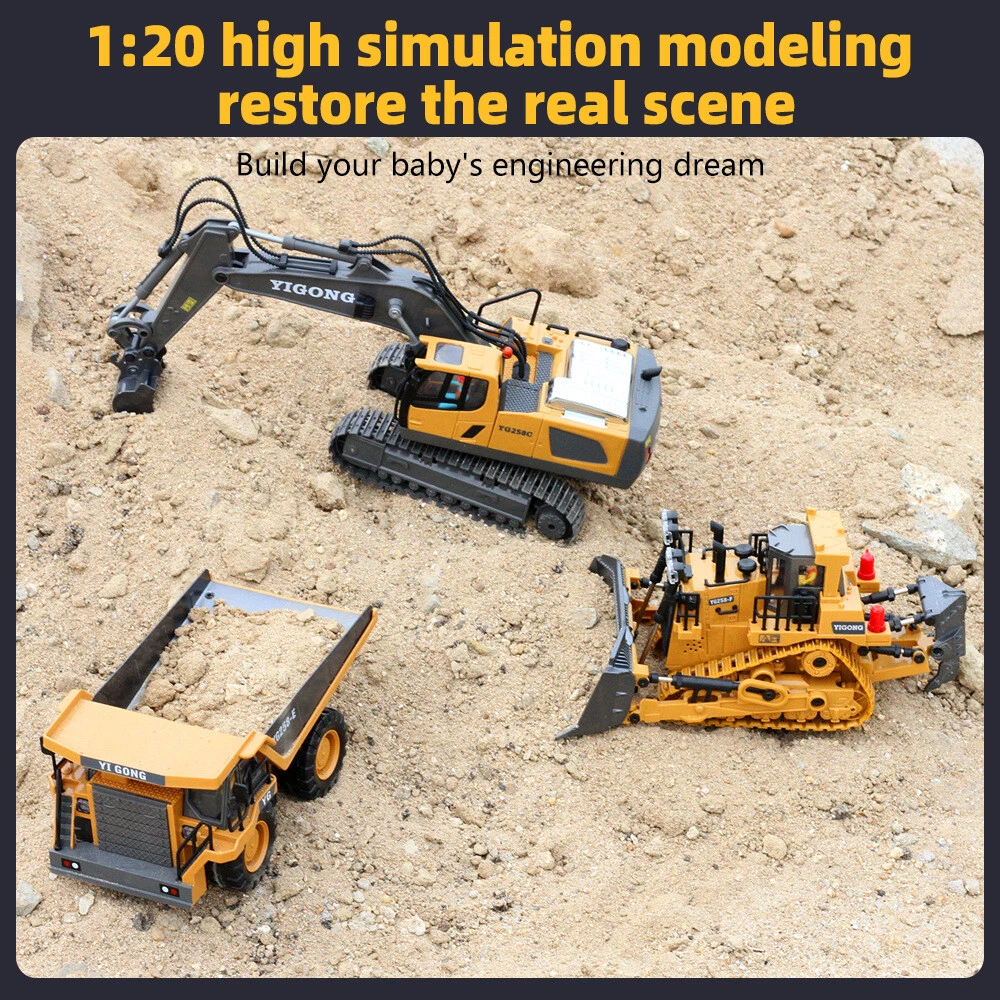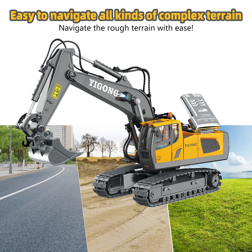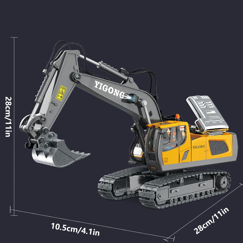 Advantage: 1. Made of high-quality ABS material, with metal shovel ,non-toxic, odorless, safe and durable. 2. Flexible alloy excavator bucket is strong, wear-resistant and impact resistant. It can move sandstone, stone and so on. 3. 2.4GHz frequency provides further RC distance and more accurate operation, with excellent anti-interference performance. 4. High simulation music and LED light functions add more fun when playing. 5. 680 ° rotation enables it to move object in different directions. 6. Powerful and flexible arms and buckets can be moved to load or unload soil, sand or anything else. 7. Two tracks provide strong traction and durability. 8. Easy to operate and great gifts for children. Specification Product material: plastic + metal + electronic components (alloy version) Product color: yellow gray Number of channels respectively: 11 channels Product frequency: 2.4G Body battery voltage: 3.7V Applicable age: 4~8 years old + Body battery charging time: 120 minutes/battery Product life time: about 40 minutes Remote control batteries: 2 AA batteries (not included) Charging plug type: USB charging cable Product remote control distance: about 30 meters Alloy excavator product size: 28 * 10.5 * 28CM Alloy excavator Body battery capacity: 1200mAh, 2 lithium batteries included Function: Alloy excavator remote control mode: left hand forward and backward/table left and right turn, right hand left and right turn/bucket up and down. Alloy excavator product features: 1.Simulation modeling, bright colors, 1:20 size, suitable for indoor and outdoor play, more suitable for multi-site control; 2.2.4G signal without interference, remote control distance; 3.Forward, backward, left turn, right turn, digging arm can be excavated and unloaded, the worktable can be rotated by 680 degrees remote control, one-key demonstration, lighting, sound effects. One set contains: 1 x Car 1 x Remote control 1 x Instruction manual 2 x batteries 1 x Charging cable 1 x Screwdriver