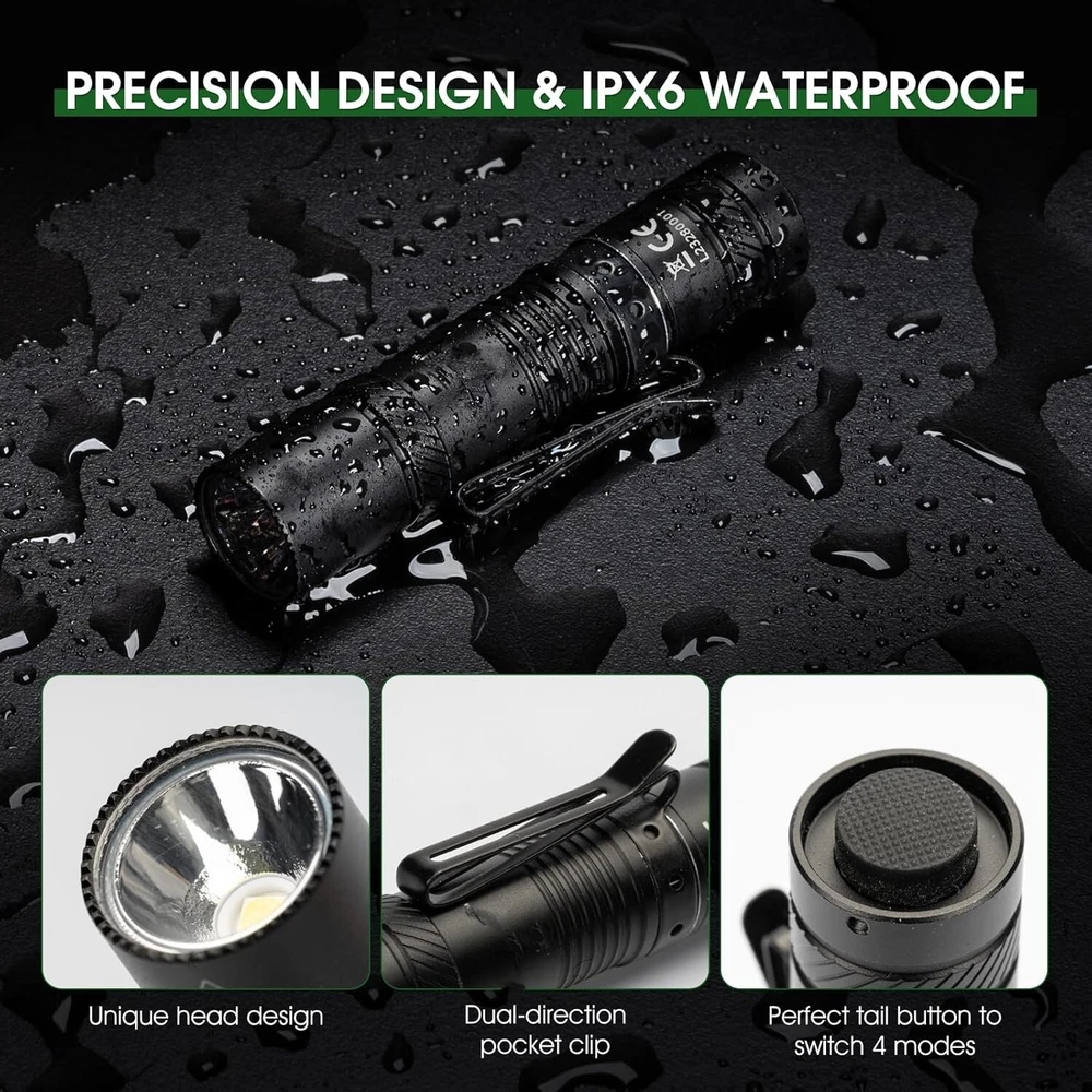 ALTO RENDIMIENTO: Esta linterna superbrillante emplea LED P8, que ofrece un potente haz de 1200 lúmenes que se extiende hasta 115 metros. Con cuatro modos de iluminación (alto, medio, bajo y estroboscópico), los potentes lúmenes altos de las linternas satisfacen las necesidades de iluminación en varios escenarios, desde caminatas y paseos con perros hasta uso diario y emergencia. COMPACTA Y PORTÁTIL: Con tan solo 3,72 pulgadas y un peso de solo 60 gramos, las pequeñas linternas potentes ocupan un espacio mínimo en el bolsillo, lo que maximiza su portabilidad. Equipada con un práctico clip, asegure sin esfuerzo la linterna de bolsillo L2 a su chaqueta, mochila, sombrero o cinturón para un fácil acceso en sus viajes. DURABILIDAD RESISTENTE: Fabricada con una aleación de aluminio resistente de grado aeroespacial, la linterna táctica no solo es duradera, sino que también es un equipo EDC imprescindible para los entusiastas del aire libre. Con resistencia al agua IPX6 y resistencia al impacto de 1,5 metros, se enfrenta sin miedo a las condiciones climáticas desafiantes y las situaciones inesperadas, lo que la convierte en una compañera confiable para acampar, hacer caminatas y el uso diario. RECARGABLE POR USB-C: Equipada con una batería recargable y compatible con baterías AA estándar, la linterna AA recargable garantiza que nunca te quedes a oscuras. El cable de carga USB C incluido permite una carga conveniente en casa, en el automóvil o mientras viajas, lo que hace de esta mini linterna la herramienta ideal para viajes por carretera improvisados y escapadas de fin de semana. ILUMINA DONDE LA NECESITES: No es solo una linterna de mano, es una herramienta versátil para tu vida diaria. Ya sea que estés explorando las maravillas de las actividades al aire libre, navegando por las junglas urbanas o simplemente necesites una iluminación confiable durante los cortes de energía, esta linterna compacta de alta potencia es tu compañera de confianza.