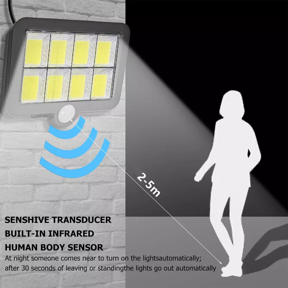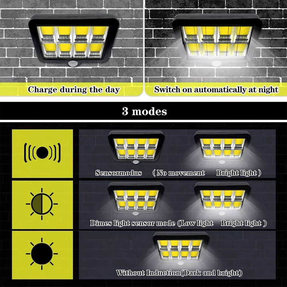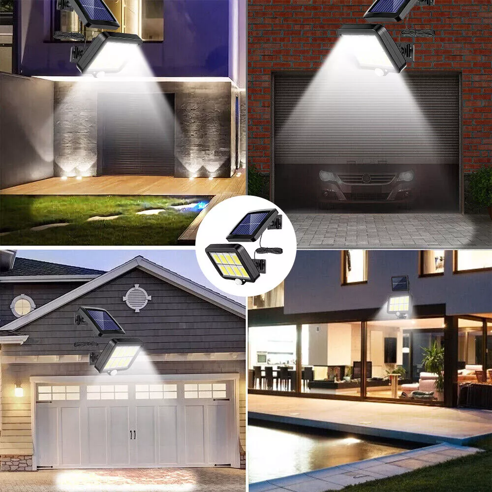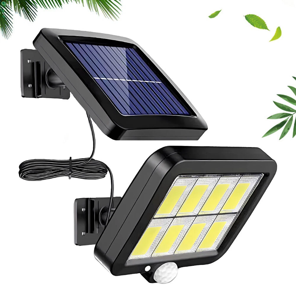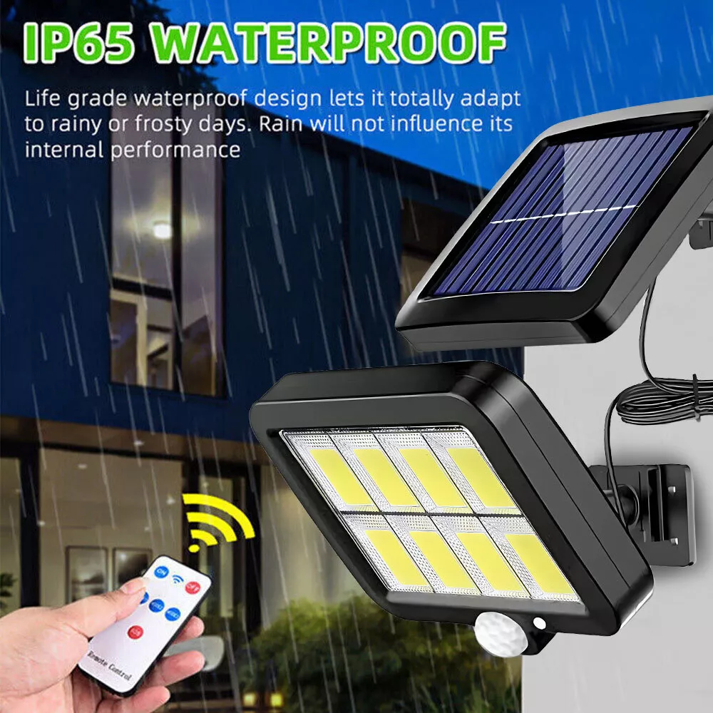 Product Description Feature: √【 Two Installation Ways 】 With integrated and separated two installation ways. (The separated installation makes it possible to install the LED lamp panel in a sunless place where you need light , and the solar panel can be installed at a distance where it can charge more sunlight.) √【 3 Light Modes 】 Motion Sensor Light come with 3 lighting modes: Mode 1. automatically on with full brightness when motion detected and off after 30 seconds; Mode 2. automatically on with full Brightness when motion detected and change to dim brightness after 30 seconds; Mode 3. always on with dim Brightness in dark. √【 PIR Sensitive Motion Sensor 】 Solar light outdoor absorb sunlight at daytime and turn on automatically at night when motion is detected.The range of motion sensor is 26.25ft(120COB) at up to 120°sensing angle and stay on for approx 30s. √【 IP65 Waterproof 】 Made of heatproof PC plastic steel + Anti-UV Material that it can withstand all weather that it cannot easily infiltrate inside the lamp body. √【 Polysilicon Solar Panel 】 Waterproof solar security light have both Polysilicon solar panel and rechargeable lithium battery (3.7v,2400mAh,120COB). Higher solar efficiency up to 17% that can get charged with 6-8 hours absorbing sunlight and will last up to 8-10 hours after completely charged. √【 Brighter Solar Powered LED Lighting 】With 120 upgraded COB LED Lights. √【 Easy Installation & Setting 】 Our street light can be mounted directly on the wall and pole. √【 Widly Used 】 The solar power lights is ideal for gardens, swimming pools, fences, patios, decks, yard, driveways,stairs. Specifications: Solar panels: Polycrystalline Silicon solar panels Battery: 3.7V 2400mAh lithium battery--120COB; Angle of the sensor: 120° Maximum Induction distance: 26.25ft(120COB) Brightness: 260LM -- 120COB Quantity of LED: 120COB Voltage: 5V Waterproof rating: IP65 Lighting Range: 40㎡ Material: ABS Induction Distance: 3-5m (6.56-16.4inch) Package Included: 1x Solar Street Light Kindly Note: It's recommended to install the solar lights in outdoor places away from shade caused by trees, building and etc., so that it can ensure they absorb enough sunlight. You can install them at a height of 6.5-8 FT over the ground; If it has been rainy or short of enough sunlight for several days, the lights might not light up at night due to lack of power. Please charge them at least 8 hours when the sun comes out; With light sensor on the solar panel, the lights will not turn on in daytime or in location near light source. After they take in sufficient sunlight, you can cover the solar panel by hand to test on or off status. Our store are specializes in all kinds of Car LED Headlight and Car Parts.We sell them at the best price, Fastest speed,and offer the best service. You will find a large selection of high quality automotive accessories. Not only do we sell quality, affordable parts, but we also sell confidence.
