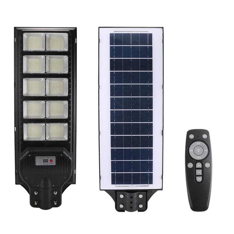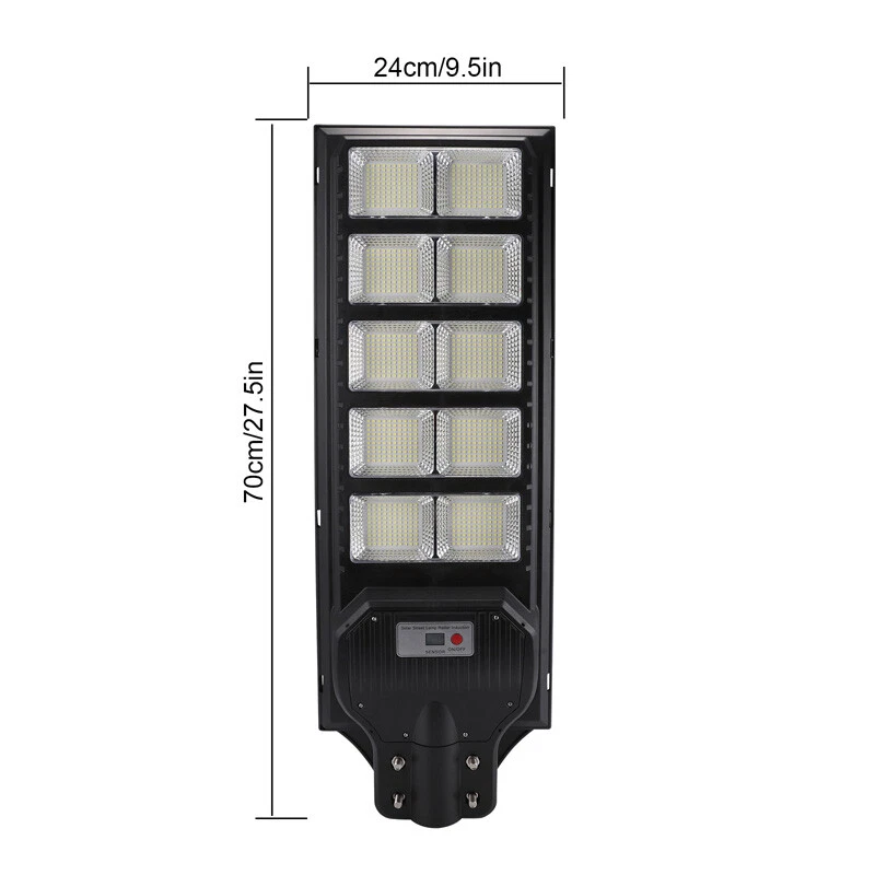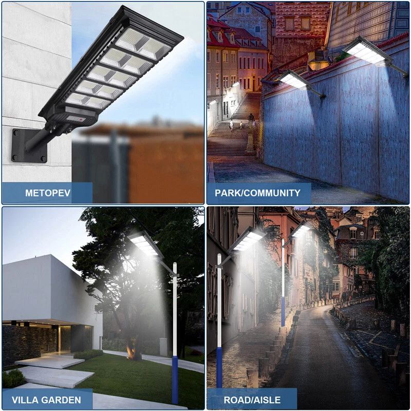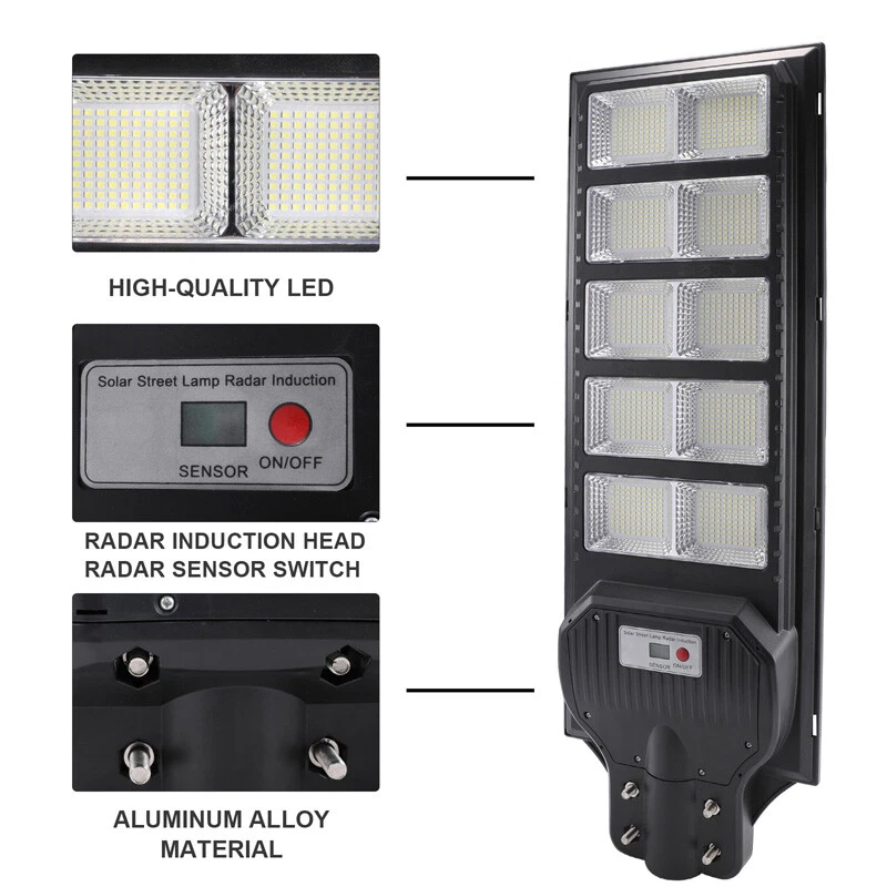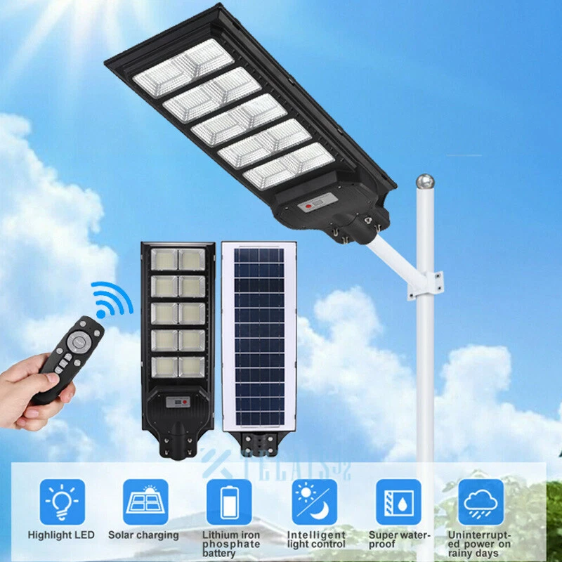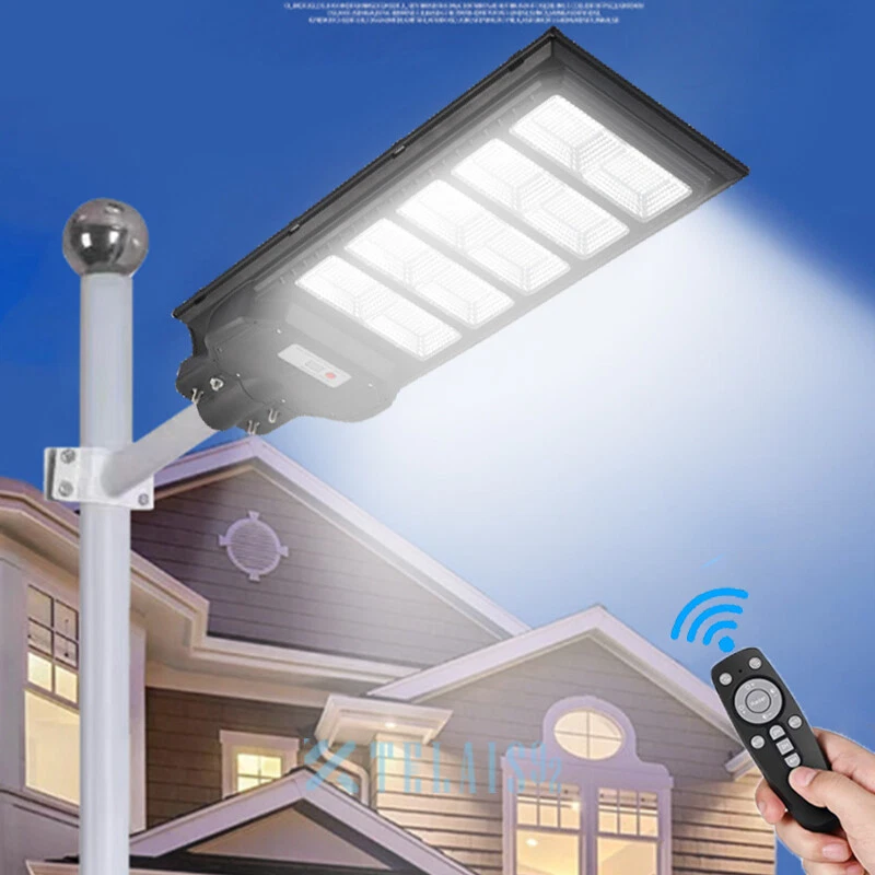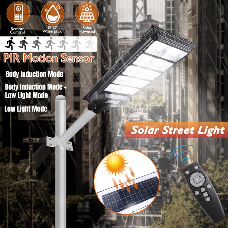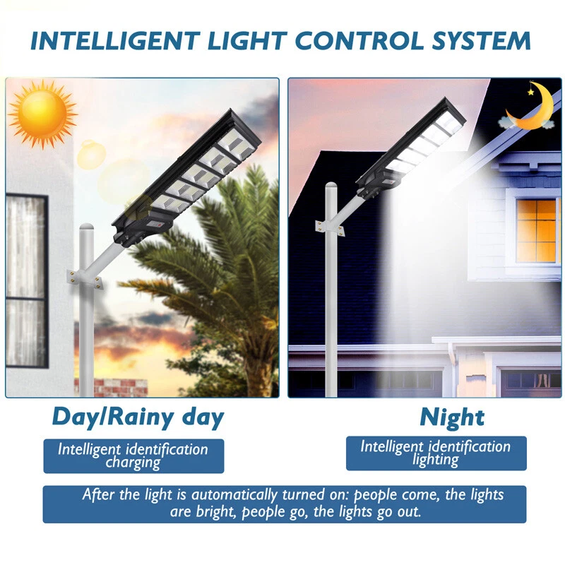 120000lm Commercial Solar Street Lights LED Outdoor Dusk Dawn Solar Super Bright Ship within 24 hours. 100% New & Excellent Quality Strictly QC, Each item was fully checked before shipping FREE & FAST Shipping delivery with Tracking Number Features: - Remote Control & Adjustable Support ,This outdoor led solar light has classic adjustable bracket that enables you to adjust the exposure angle of the solar lamp according to the operating environment. Besides, the remote control is more convenient for you to adjust the working mode of the lamp at any time,you don't have to use a ladder. - LED Brighter & Wider Lighting ,This solar motion sensor light equipped with upgraded high quality LED lamp Beads and newest energy management chip, which increases the angle and area of illumination by 50%. - All-Season Working Light ,LED solar light absorbs and converts sunlight into electricity,efficient solar panel has good heatproof and IP67 Waterproof function and can continue to work during the cold winter months,lighting up your life in any weather and any season. - Super Long Lifetime ,Solar powered light is IP67 waterproof that it completely protects circuit and battery and makes its life span 2 times than others. - Using microwave body sensing technology makes it more energy-efficient, light on when sensing motion, dim light when sension no motion. - Polycrystalline Solar Panel convert solar energy into electricity, more environmentally friendly. - High hardness , sealed and IP67 Waterproof, easy to install and durable. - No pollution, energy saving and environmental protection - Application: Outdoor wall or pole in Plaza, Park, Garden, Courtyard, Street, Walkway, Pathway, Campus, Farm, Perimeter Security etc.. Note: Ultra-Bright Remote Outdoor Led Solar Flood Light Every Solar-powered LED Light is built-in with LEDs that together provide a brighter, more efficient lighting system. Wider Illumination Range & Longer Motion Distance Descriptions: - 3 Mode, light control + Radar motion + remote control Super Simple Installation The light can be mounted on the porch/wall/tree/pole with provided accessories in seconds, and no need cable or wire, save your much time. Wattage: 1000W Fully charged lighting: 20 hours Solar panel: 6V/30W Battery capacity: 3.2V 30AH Product function: radar + light control + remote control Lamp body size: 782*242cm Lamp beads: 1000 Irradiation area: 250 square meters Installation height: 4-6m Material: ABS engineering plastic PC cover Waterproof :IP67 Remote control :Normal light or induction mode Remote control battery type: 2*AAA ( included) Life: 100000 (h) Package Included:(not include mounting pole) 1x Solar Street Light+ 1x Remote Control If you need to purchase a mounting pole, click here to purchase the Street Light + Pole Kit. 120000lm Commercial Solar Street Lights LED Outdoor Dusk Dawn Solar Super Bright | eBay