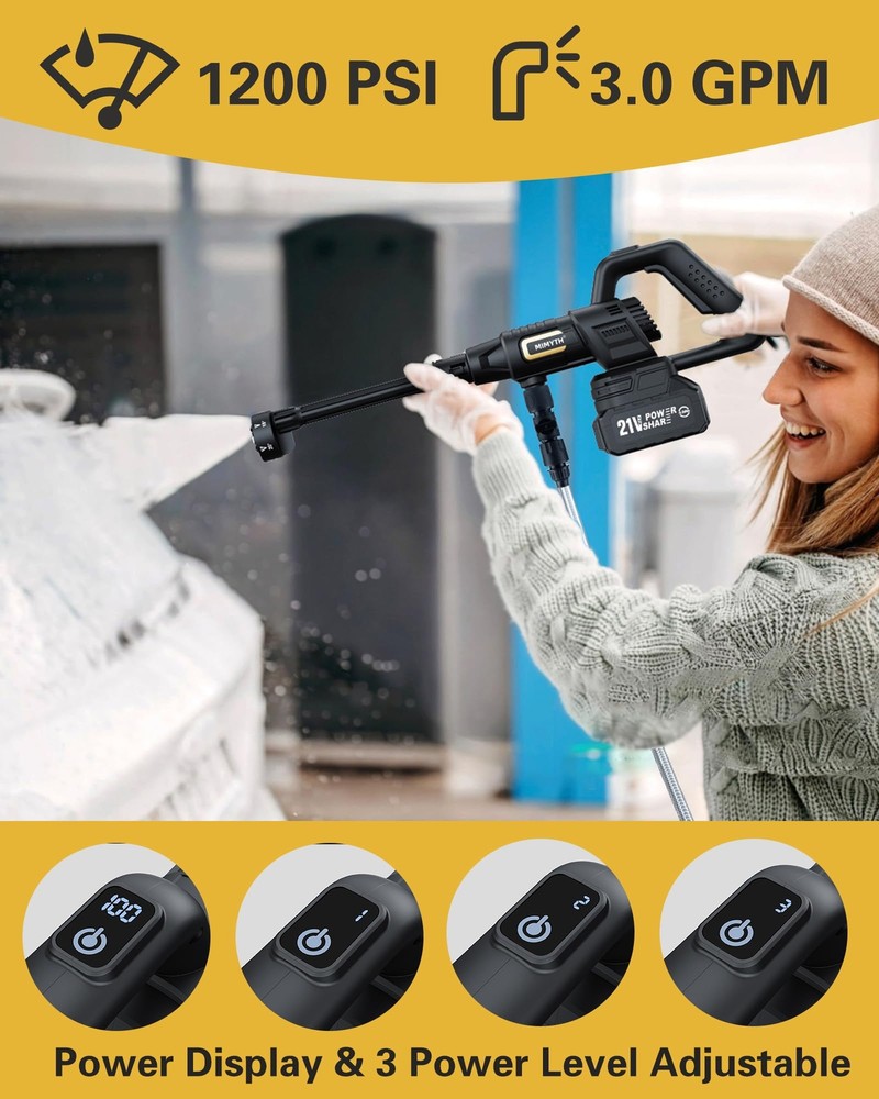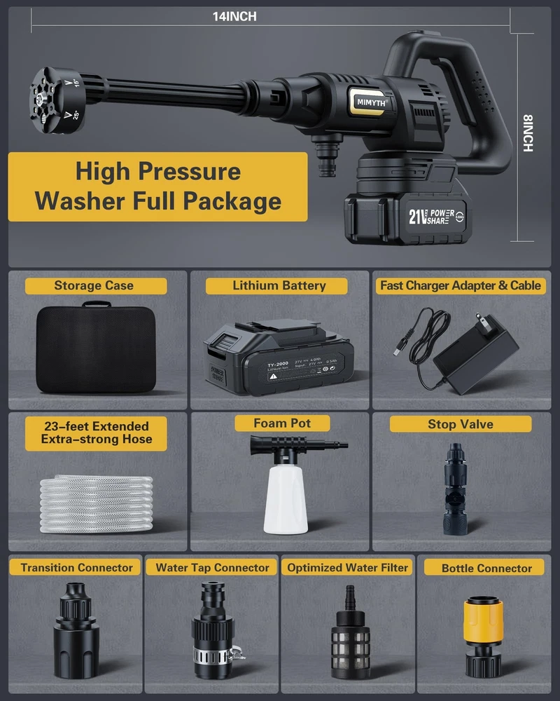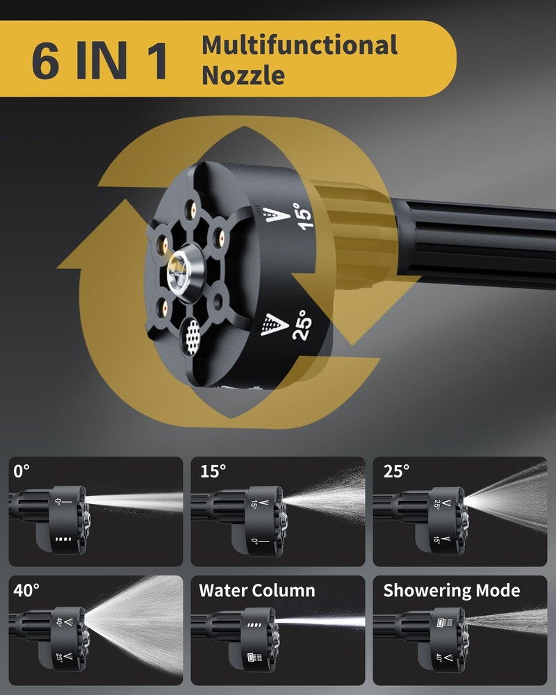 [Unmatched Strong Portable Power Washer Cordless] Cordless Pressure Washer delivers an impressive cleaning power. Our high pressure washer can tackle even the toughest dirt with ease, making the cordless power washer perfect for any cleaning task. [High-Capacity Battery] Equipped with advanced 21V 4.0Ah battery, our car pressure washer ensures faster charging times, longer runtime and consistent power output. Enjoy up to 40 minutes of uninterrupted cleaning with our battery powered pressure washer. [Versatile 6-in-1 Nozzle & Foam Pot] Our nozzle offers a range of spray patterns, including 0°, 15°, 25°, 40°, jet, showering, versatile for all scenarios. Other than a good car washer, it's also good for foam cleaning, bikes, window, wall, floor, etc. [Draw Water from Anywhere] Our car wash pressure washer machine includes all connectors for drawing water. The faucet connector draws from tap. The weighted filter absorbs water from buckets & pools easily. The bottle connector takes water from bottle. [Easy carry & Install] Weighed 3.2 lbs, our portable handheld pressure washer is designed for easy carry. With detailed instruction & quick-connect ports, our mini small battery operated power washer allows for fast and easy setup. hidrolavadora portatil [What is included] Pressure Washer, 4.0Ah Battery, Fast Charger, 6-in-1 Nozzle, Foam Pot, 23FT Extended Extra-strong Hose, Faucet Connector, Stop Valve, Weighted Filter, Bottle Connector, Bottle Straw, Storage Case, User Manual, 24-hour response service.