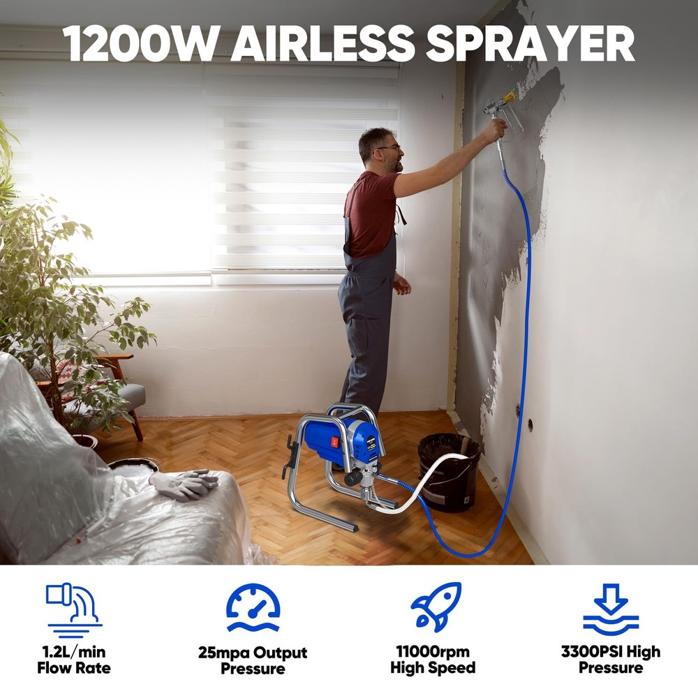 airless paint sprayer 【POWERFUL MOTOR】 airless paint sprayer has a 1200W motor that delivers a flow rate of 1.2L/min, which is 5X faster than roller painting, helping you to save your spraying time. 【TWO USE METHODS】This electric paint sprayer is very simple to use with the push of a switch, which has a direct nozzle and a 12-inch extension pole that can be used in two ways, making it easy for you to spray near and far. 【EVEN SPRAYING】With an adjustable spray pressure of up to 3300PSI, our electric paint sprayer is capable of efficient and even spraying, and is equipped with a 515 nozzle to make the paint more delicate, presenting a professional spray effect. 【COMPACT DESIGN】stand airless sprayer weights only 16.5 lbs, and is also designed with a multi-purpose portable handle and a 29.5 ft. long hose storage rack, making it not only convenient to store, but also easy to move and carry. 【WIDE APPLICATION】The paint sprayer machine is suitable for home interior and exterior, furniture, fences, decks, garage, etc., making it an excellent spraying companion. And please you can contact us if you have any problems in using.