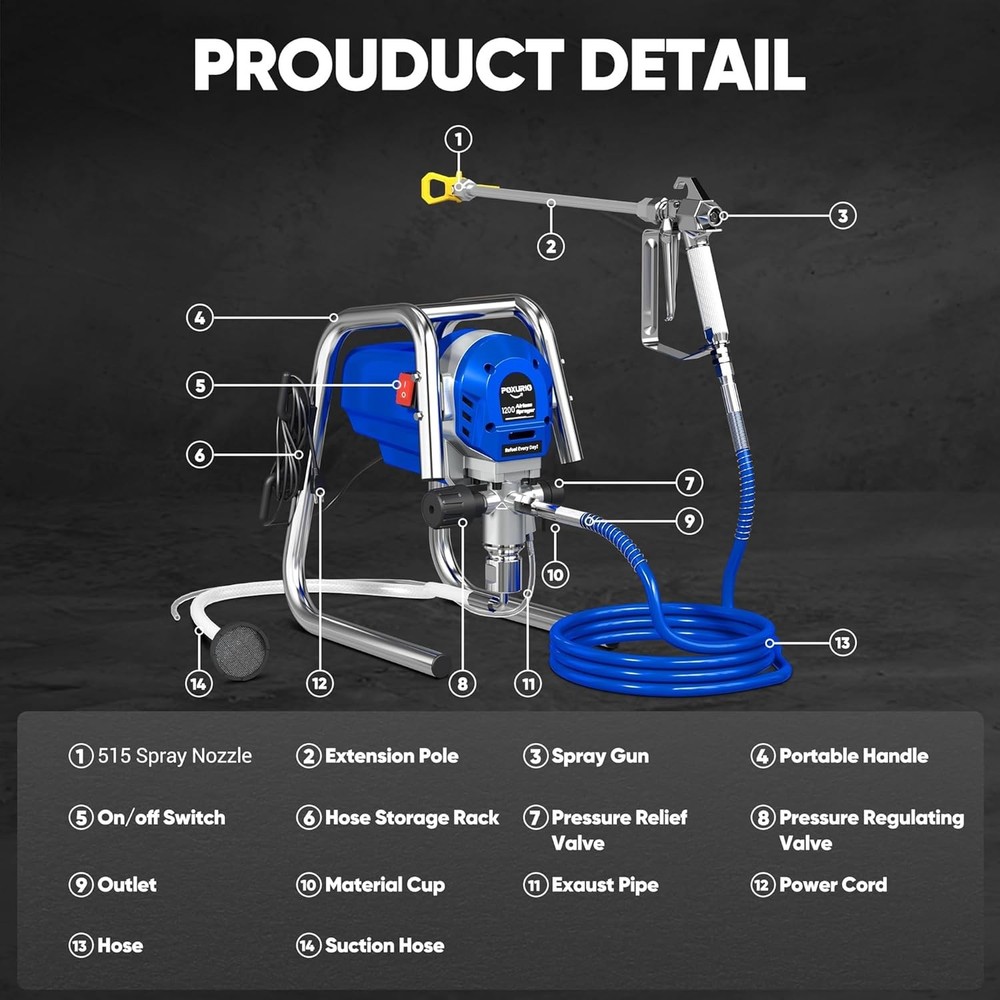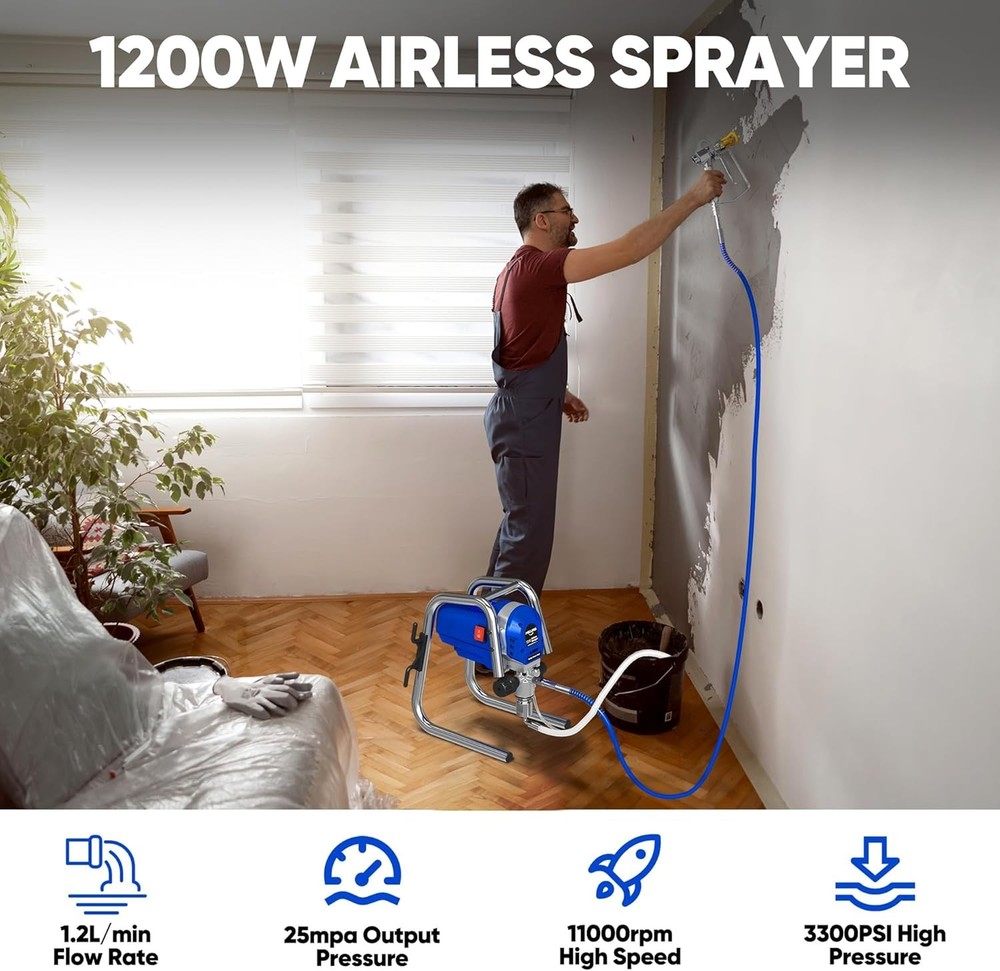 1200W Airless Paint Sprayer, 3300PSI High Efficiency Electric Paint Sprayer with Extension Rod, Thinning-Free Stand Airless Sprayer for Home Exterior and Interior, Garage, Deck, Furniture Item Description About this item 【POWERFUL MOTOR】 POXURIO airless paint sprayer has a 1200W motor that delivers a flow rate of 1.2L/min, which is 5X faster than roller painting, helping you to save your spraying time. 【TWO USE METHODS】This electric paint sprayer is very simple to use with the push of a switch, which has a direct nozzle and a 12-inch extension pole that can be used in two ways, making it easy for you to spray near and far. 【EVEN SPRAYING】With an adjustable spray pressure of up to 3300PSI, our electric paint sprayer is capable of efficient and even spraying, and is equipped with a 515 nozzle to make the paint more delicate, presenting a professional spray effect. 【COMPACT DESIGN】POXURIO stand airless sprayer weights only 16.5 lbs, and is also designed with a multi-purpose portable handle and a 29.5 ft. long hose storage rack, making it not only convenient to store, but also easy to move and carry. 【WIDE APPLICATION】The paint sprayer machine is suitable for home interior and exterior, furniture, fences, decks, garage, etc., making it an excellent spraying companion. And please you can contact us if you have any problems in using. › See more product details Payment We accept payment only through PAYPAL Shipping We ship products worldwide through standard express courier service, it will reach within 7 to 10 days to abroad buyers, we ship the product after recieved clear payment and give full information about shipment to the buyer Return We accept product return within 7 to 21 days from delivery date but product should be in original position and not in damaged condition,the return shipping charges will be buyer responsibility
