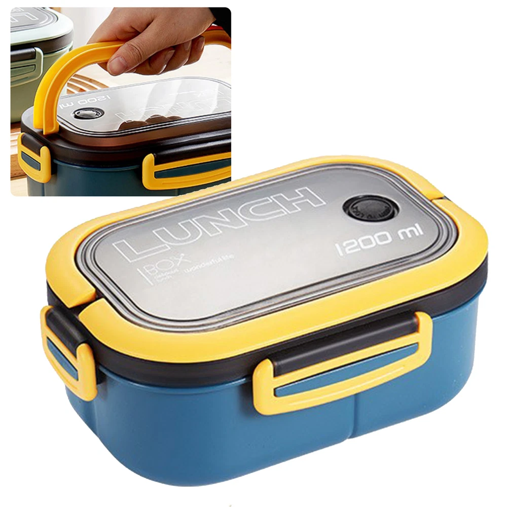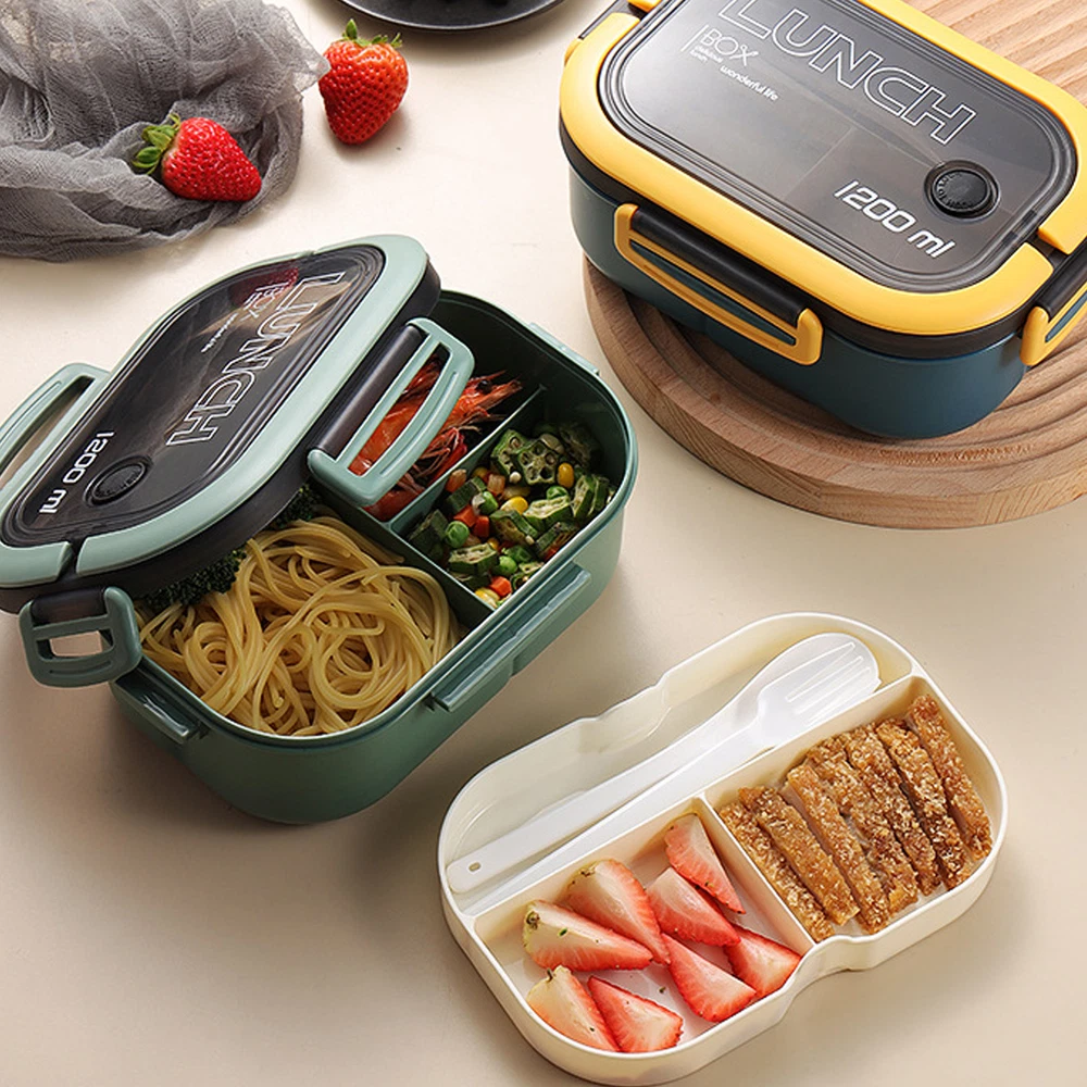 Feature: 1. Leak Proof Design: The bento lunch box has a built in silicone and is designed to be sealed to prevent leaks. 2. Double Layer Design: The layered lunch box features a double layer divider design to hold more food. 3. Insulation Function: The bento box has a snap on sealing lid, which provides good insulation and ensures no loss of flavor. 4. Quality Material: The lunch box container is made of high grade PP, which is safe and healthy to use. 5. Portable: The lunch box features a large capacity of 1200ml, making it easy to carry and suitable for students and office workers. Specification: Item Type: Bento Lunch Box Material: PP, Silicone Size: Approx. 21.5 x 8.2 x 15.8cm/8.5 x 3.2 x 6.2in Volume: 1200ml Gross Weight: Approx. 255g/9.0oz Package List: 1 x Bento Lunch Box 1 x Fork 1 x Spoon Note: Please allow some errors due to manual measurement.