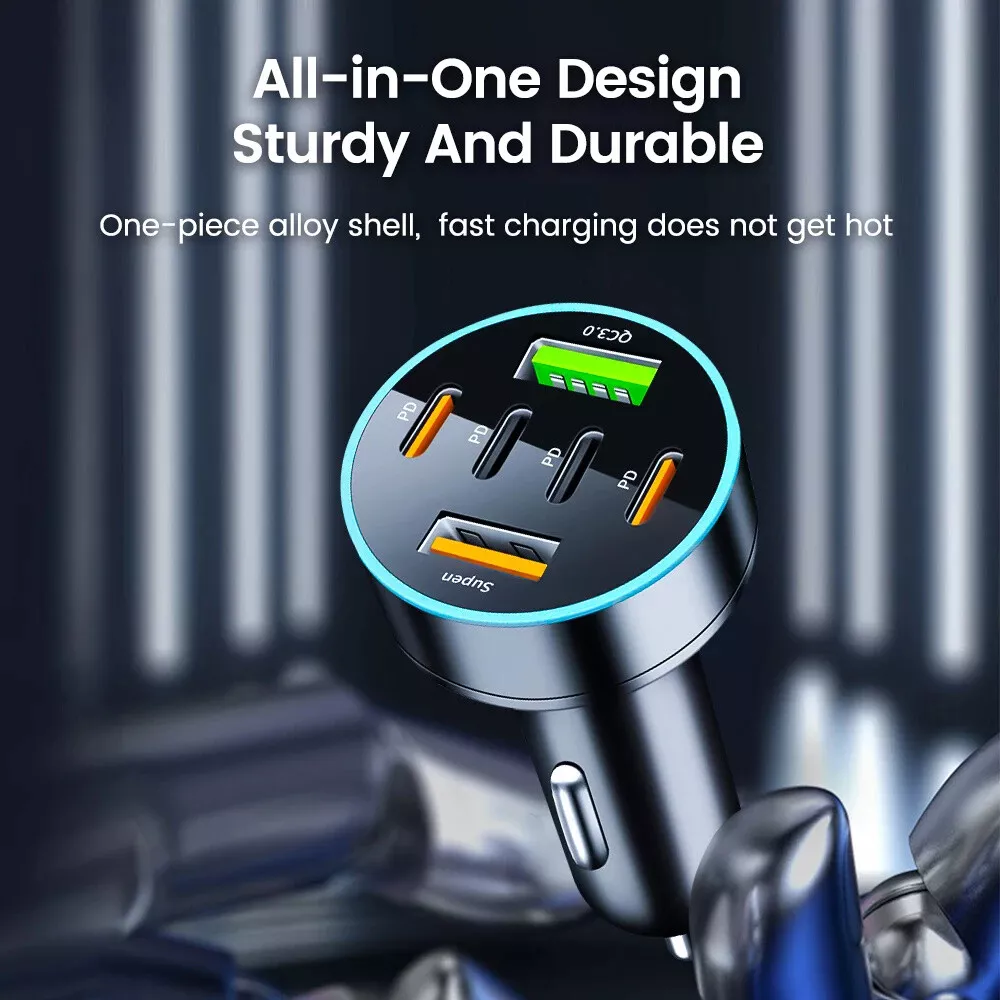 Feature: ⚡6 ports fast car charger:2 for your choice-with 2 USB A ports and 4 PD port is compatible with most Android mainstream phones for fast charging. It can charge up to 6 devices at the same time,such as Android,iphone and laptop,achieving true stability and speed. ⚡Upgrade smart chip:Our compact charger has a built-in upgraded smart master core chip that contains a power management chip and a fast charging protocol chip. It can provide protection against over voltage,over current,over temperature and over power short circuit.ensure your safe charging while driving. ⚡ On both sides of the charger we have strengthened the anti-slip shrapnel, elastic and solid,even if driving on uneven mountain reads,there will be no power failure. ⚡Wide compatibility: Effectively compatible with various cell phones,tablets,car recorders and other USB devices for charging,widely used in mainstream models with 12-24V voltage input,compatible with various models of cigarette lighters,including family cars,business SUVs,off-road sports cars,etc. Function: 6-port power supply,QC3.0 fast charging,PD fast charging,intelligent current division,intelligent chip,solid installation,universal for various automotive. Specifications: Input voltage. DC 12-24V Digital display: voltage monitoring, charging current Number of ports:6(2*3.1A+4*PD) USB Output. DC5V⎓3.1A PD Output (PD). 5V⎓3A, 9V⎓2A, 12V⎓1.5A. The package contains: 1* car charger Or 3ft Cable