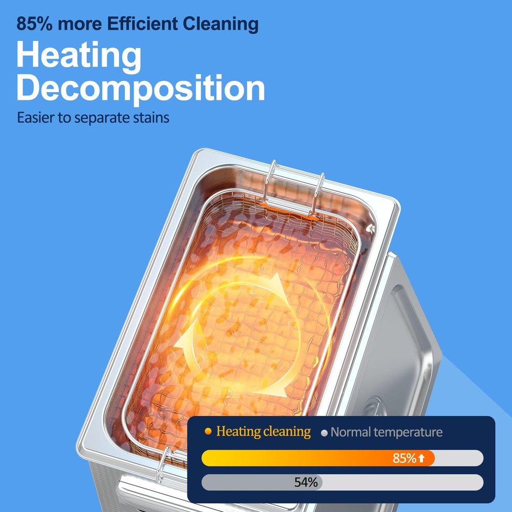 Overheat protection Product capacity: jewelry cleaning machine 3.2L 3.2L ultrasonic machine Product power: 120W best jewelry cleaner ultrasonic Operating frequency: 40khz professional eyeglass cleaner machine Inner groove size: 9.4×5.3× 4 in Overall dimension:10.4 × 6.5 × 9.1 in Timer:Digital 1~30min adjustable More Features: Digital Control + Timer + Heater + Degas 【Powerful Cleaning Effect】120W sonic cleaner possesses ultrasonic cleaning frequency 40kHz, ultrasonic power 120W.sonic jewelry cleaner machine have powerful and efficient cleaning performance to remove dirt, grime and contaminants from delicate items 【Heater Timer】The ultrasonic parts cleaner adopts digital control panel to control the working time and accurately determine the temperature. 150W heating power can heat the cleaning solution to effectively remove impurities, stains, anti-rust treatment and so on 【Degas Mode】Ultrasonic cleaning Machine with degassing mode can effectively remove the gas in the liquid, improve the cleaning efficiency, reduce the gas content in the liquid, protect the experimental samples, improve productivity, and extend the service life of the equipment 【Special capacity design 】jewelry cleaner ultrasonic capacity 3.2L, Tank Size: 9.4 × 5.3 × 4 in, made of high-quality 304 stainless steel, with corrosion resistance and oxidation resistance, more durable and sturdy, can be used for many years.is widely used for cleaning jewelry, eyeglasses, watches, circuit boards, dental equipment, and other small parts 【LED Digital Display】Sonic cleaner machine -Time setting: 0-30 minutes. The LED digital timer precisely controls the time 【Firm and not loose 】The ultrasonic eyeglass cleaner machine uses a high-strength flexible fixing adhesive to bond the ultrasonic transducer to the stainless steel tank,preventing the vibrating head from falling off when the ultrasonic cleaning machine is running