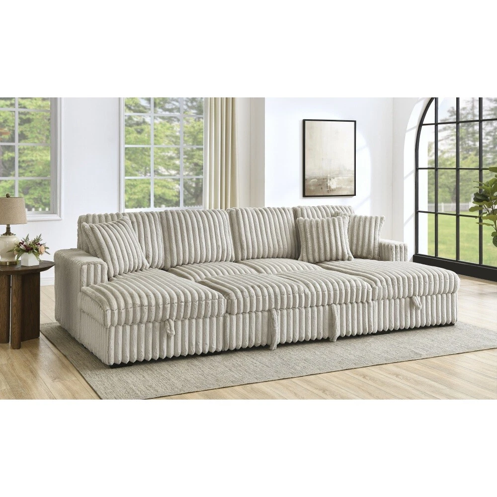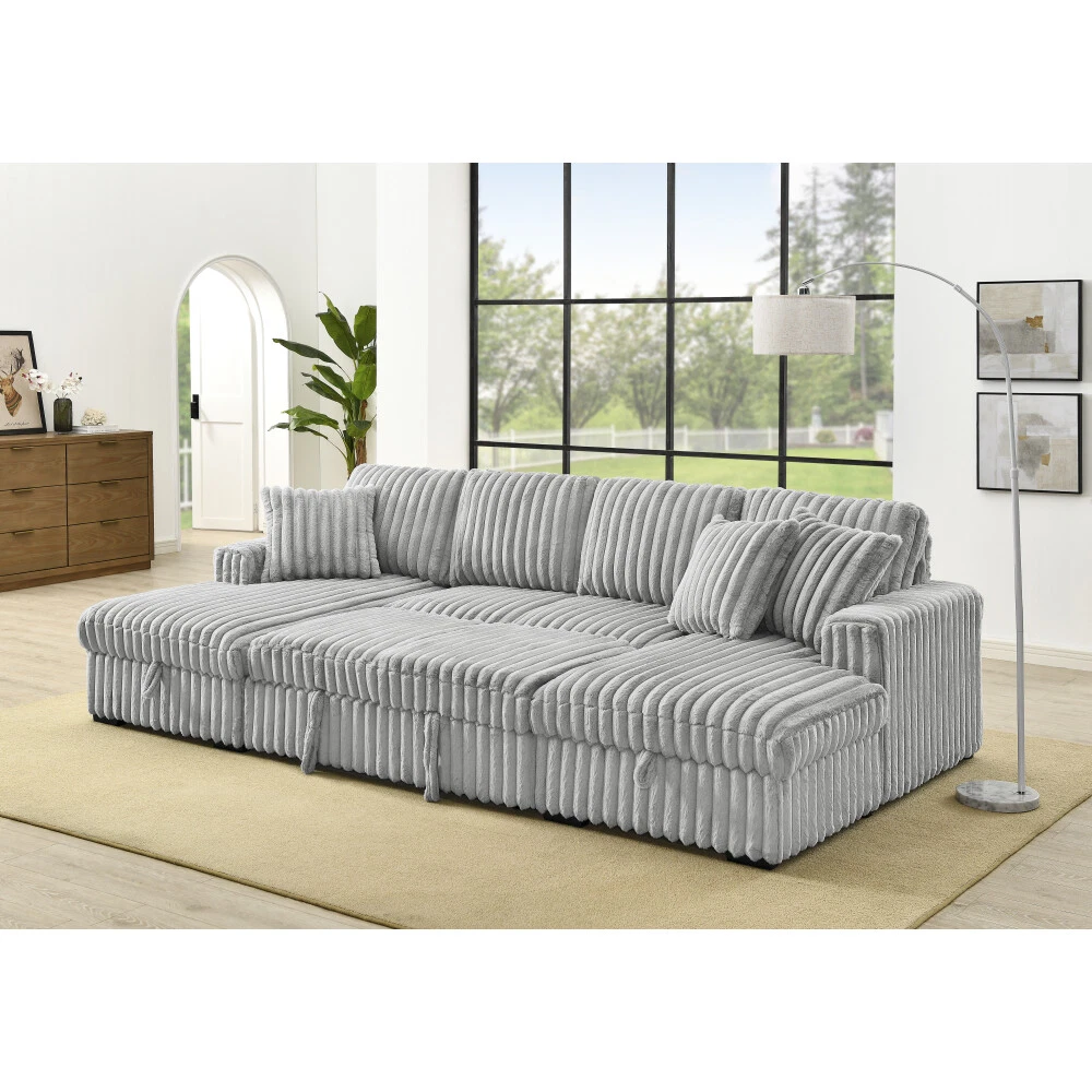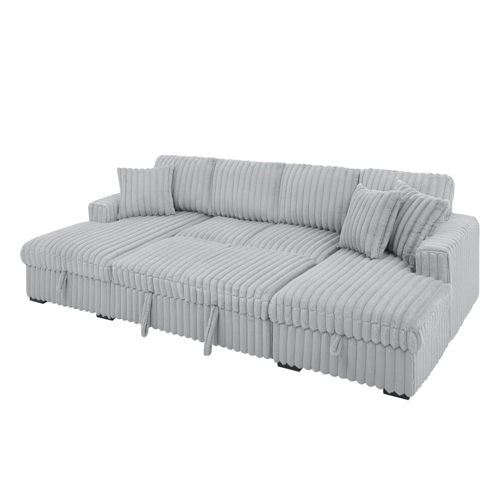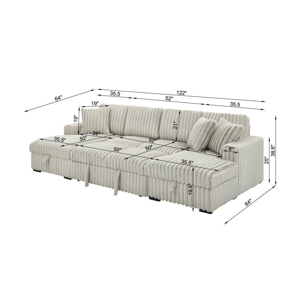 【Ultra Spacious Area】122" Enormous size allows you can stretch out comfortably, accommodates multiple family members or friends, offering utmost comfort whether for a cozy movie night or entertaining gatherings. 【Sturdy & Durable Pull Out Bed】Turn any room into bedroom or guest room with bed couch easily and quickly with one smooth motion without squeaking Firm frame ensure the sleeper couch longer lifespan. 【Ample Storage Space】: Double built-in storage units integrated into the chaises, maximizing space utilization. Effortlessly organize cluttered items and maintain a tidy and appealing living area. 【Rabbit plush】Corduroy Fabric/Rabbit plush Fabric sofa sleeper is breathable and does not pill, ensuring a longer lifespan. Also has a soft touch, providing a comfortable and natural feeling. Sturdy & Durable Pull Out Bed+Hidden Storage Sleeper Sofa: The hidden bed under the sofa can be changed into a sleeping bed that can be easily pulled out and pushed in to allow for extra guests and space saving accommodation The hidden storage space in the chaise is perfect for storing seasonal blankets, extra pillows. On Mar 7, 2025 at 08:24:40 PST, seller added the following information: