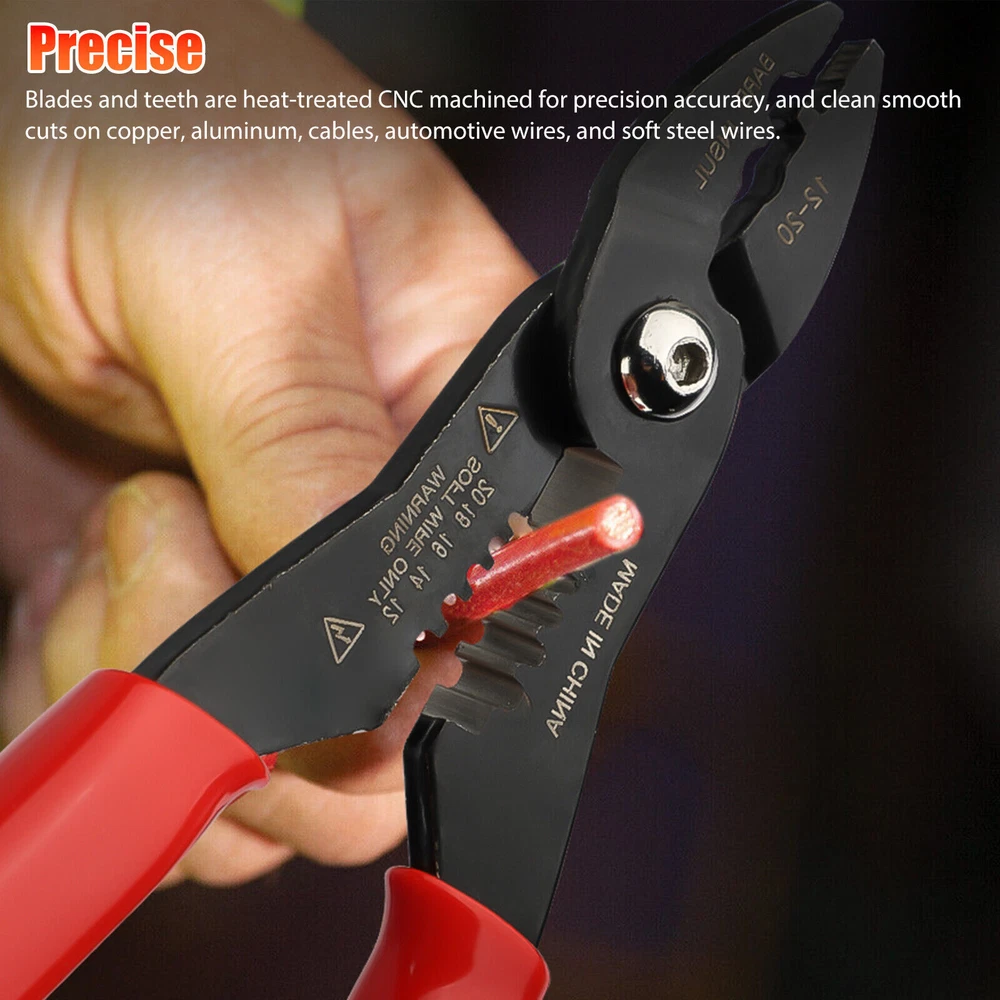 Product Description Features: Solid forged alloy steel construction with a protective black finish stands up to extensive everyday carry and daily use. Strips and removes insulation. Crimp insulated and bare wires. gripping nose works to pull, hold, twist, and bend wire ends. Blades and teeth are heat-treated CNC machined for precision accuracy, and clean smooth cuts on copper, aluminum, cables, automotive wires, and soft steel wires. Cut, grip, twist, pull, crimp, and strip wires and cables in gauges from 12-20 AWG in one small handheld tool. Specifications: Type: Wire Pliers Material: Alloy Steel Color: Red and Black Size: 175*55mm/6.9*2.17inch Application for 12-20AWG wires and cables Package include: 1* Pliers If you have any doubts or uncertainty about this item, contact us with no hesitation, we are always here and will solve your problems. Thanks and wish you a nice day! About Us We dedicated to provide excellent products and services for all customers on ebay. hope we all can have a nice experiences on eBay. Payment We accept all verified payment through PAYPAL payment. Shipping Usually, Item will be shipped within 1-2 working day after full payment is received. Normally, you will receive the item in 5-7 days. Please contact us if you don’t receive the items after 10 working days after the payment If you have any questions about shipping, please feel free to contact us. Returns Always believe we can solve problems by communication if it comes to any problems about products or any others. If it comes to a return, the products must be intact and as original when you received, and should be within 30 days after you received it. Contact Us Work time: 9:00 AM to 18:00 PM Beijing Time You can contact us at anytime you want, we will reply all messages at the first time. powered by