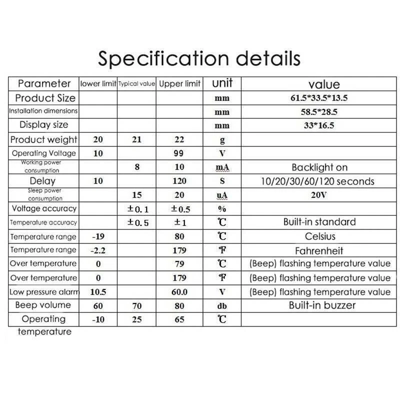 DC 100A 100V Voltmeter Ammeter Volt Amp Meter Voltage Current Tester with Shunt 10.41 USD Free shipping Voltage Tester Pen Non Contact AC Sensor Power Alert 12-1000V Electric Detector 8.99 USD Free shipping 12V LED Digital Display Voltmeter Car Motorcycle Voltage Volt Gauge Panel Meter 7.49 USD Free shipping 12/24/48V Battery Capacity Status LCD Digital Display Indicator Monitor Meter 8.95 USD Free shipping Product Description Product Description Size: 61.36*33.6*13.5mm Color: black Material: ABS Suitable for battery: 12V/24V/36V/48V Display: LCD Protection: reverse protection Working voltage: 10-100V Working current: 9MA Sleep mode dissipation: 10UA Temperature: -10℃-55℃ Features: Applicable battery: Battery capacity monitor is suitable for 10-100V lithium battery, lead-acid battery, lithium iron phosphate battery, Ni MH battery and other batteries. Multifunctional: Not only can display battery capacity and voltage, but also can display the temperature, ℃ and ℉ could be easily switched. Protection: the battery power detector comes with input reverse connection protection, won't burn if connect reversely. Auto-off: Automatically turn off for saving the power, the auto-off time can be adjusted from 10 seconds to 120 seconds. LCD display: Adopts clear LCD color screen, displays battery capacity, voltage, temperature value. Widely used: Can be used as battery voltage tester meter, battery capacity detector and temperature indicator panel for car, marine, RV, boat and so on. Easy to operate: It is designed with the on/off switch, convenient for your daily operation. Package list: 1 x battery monitor Note: Due to the light and screen difference, the item's color may be slightly different from the pictures. Please allow 2-3mm differences due to manual measurement. Payment Shipping Terms Returns Contact Us Policies 1.We accept PayPal only. 2.All major credit cards are accepted through secure payment processor PayPal. 3.Payment must be received within 7 business days of auction closing. 4.We ship to your eBay or Paypal address. Please make sure your eBay and Paypal address is correct before you pay. Feedback will be left automatically after we receive your feedback. Please contact us before leaving a Negative feedback or Neutral feedback. We would try our best to help you solving any problem. 1.We ship to your eBay or Paypal address. Please make sure your eBay and Paypal address is correct before you pay. 2.Items will be shipped within 1-3 business day when we received payment. 3.Delivery time depends on destination and other factors; 4.International buyers please note: a.Import duties, taxes and charges are not included in the item price or shipping charges. These charges are buyer’s responsibility. We will try our best to reduce the risk of the custom duties. b.Please check with your country's customs office to determine what these additional costs will be prior to buying. We offer full refund 100% from the price you buy. You can return item within 30 days after items received. We do our best to value every customer a 5-star positive eBay experience by working hard and professional. We also provide accurate information for our products, prompt communication and reasonable and fair price (the balance between price and quality) to our customers. We are welcome and happy if you have any issues, problems or suggestions. Please feel free to email us thru eBay. If there is no response after contacting us several times, please check your email spam folder. Please DO NOT Leave us Neutral or Negative Feedback without telling us in advance. We will do our best to help you to resolve your problems. We reply any email messages within 1 business / working days; Our Business hours: Mon-Fri 9:00-18:00, UTC/GMT +8 hours. 1.We are not responsible for any custom duty or import tax. 2.We will leave POSITIVE FEEDBACK after receiving the payment. Please contact us if you are not satisfied with the item after receive it. 3.All messages will be answered within 1 business day. If you do not receive our reply, please kindly re-sent your message and we will reply to you as soon as possible. 4.Serious Buyer Only! Please place bid only if you agree with all the terms. Payment 1.We accept PayPal only. 2.All major credit cards are accepted through secure payment processor PayPal. 3.Payment must be received within 7 business days of auction closing. 4.We ship to your eBay or Paypal address. Please make sure your eBay and Paypal address is correct before you pay. Feedback will be left automatically after we receive your feedback. Please contact us before leaving a Negative feedback or Neutral feedback. We would try our best to help you solving any problem. Shipping 1.We ship to your eBay or Paypal address. Please make sure your eBay and Paypal address is correct before you pay. 2.Items will be shipped within 1-3 business day when we received payment. 3.Delivery time depends on destination and other factors; 4.International buyers please note: a.Import duties, taxes and charges are not included in the item price or shipping charges. These charges are buyer’s responsibility. We will try our best to reduce the risk of the custom duties. b.Please check with your country's customs office to determine what these additional costs will be prior to buying. Terms Returns We offer full refund 100% from the price you buy. You can return item within 30 days after items received. Contact Us We do our best to value every customer a 5-star positive eBay experience by working hard and professional. We also provide accurate information for our products, prompt communication and reasonable and fair price (the balance between price and quality) to our customers. We are welcome and happy if you have any issues, problems or suggestions. Please feel free to email us thru eBay. If there is no response after contacting us several times, please check your email spam folder. Please DO NOT Leave us Neutral or Negative Feedback without telli