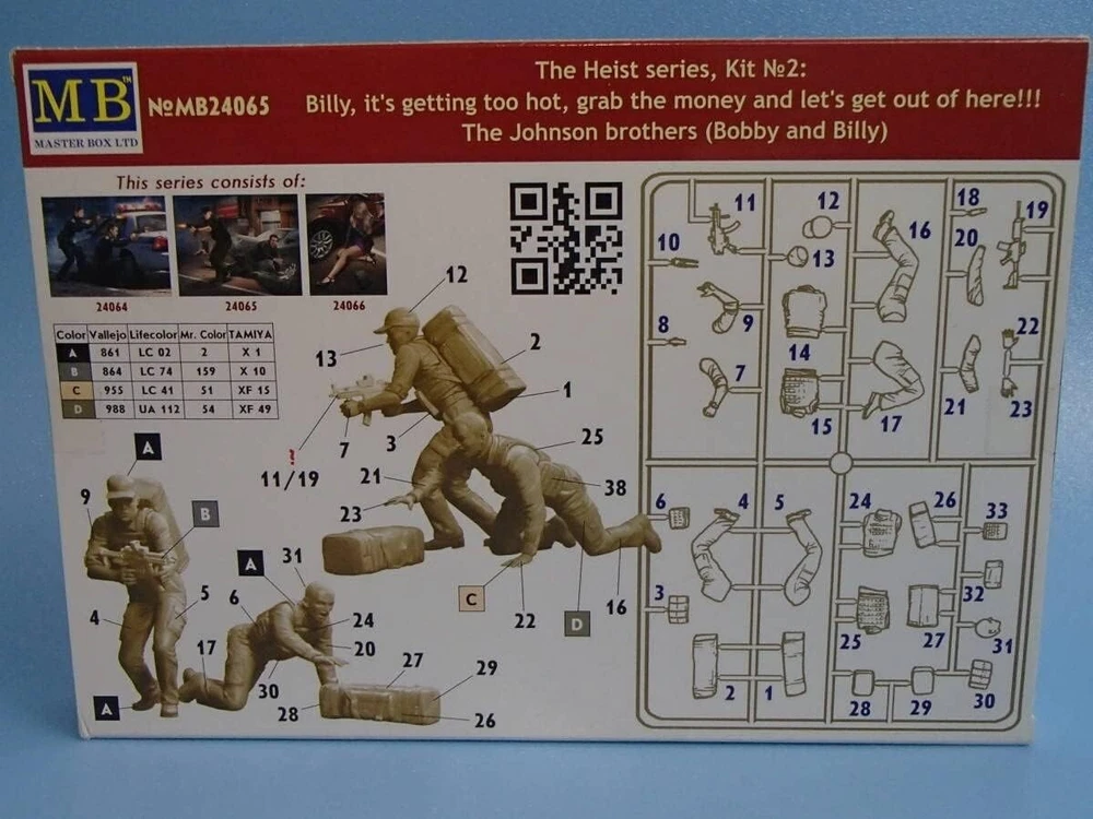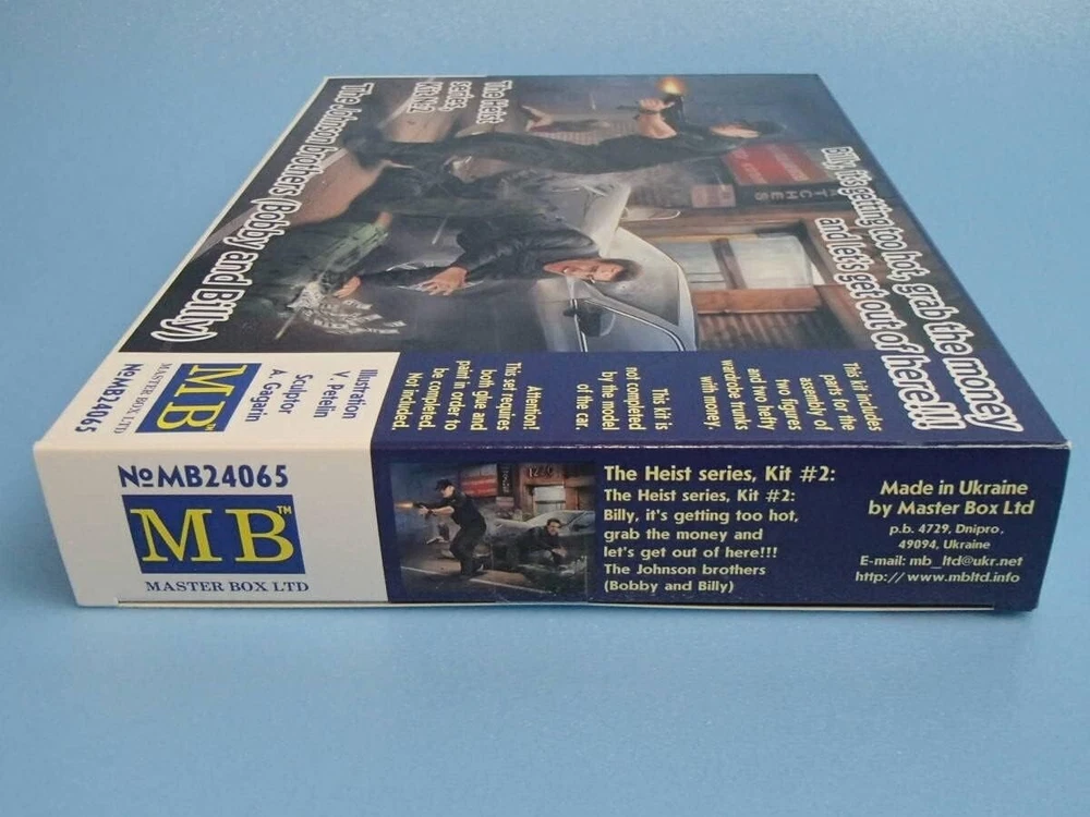 MASTER BOX MB24065 Scale Figure Kit 1:24 “The Heist series, Kit №2. Billy, it's getting too hot, grab the money and let's get out of here!!! - Plastic model kit ---------------------------- If you have a desire to procure a GREATER NUMBER OF ITEMS THAN WHAT IS CURRENTLY DISPLAYED, kindly let us know, and we will happily modify our offerings to suit YOUR EXACT QUANTITY NEEDS. ---------------------------- Scale: 1:24 Manufacturer: Master Box (Ukraine) Country/Region of Manufacture: Ukraine Condition: New in Box Features: Kit Series: Heist Series / Scale Figure Kit The kit consists of: - 2 figures in different poses Figures are not painted Glue and paint are not included The model is suitable for experienced and beginner modelers. ---------------------------- Scale model kits are a great way to create something truly unique and special. Whether you're a beginner or an experienced modeler, we have the perfect kit for you. Our kits are made from high-quality materials and come with detailed instructions, so you can be sure to create a masterpiece. We also offer a variety of accessories and tools to help you customize your model to your liking. With our scale model kits, you can bring your imagination to life. Build your favorite car, plane, or train. Create a replica of your favorite historical figure. Or even build something completely original. No matter what you choose to build, you're sure to have a rewarding and enjoyable experience. So what are you waiting for? Start building your masterpiece today!