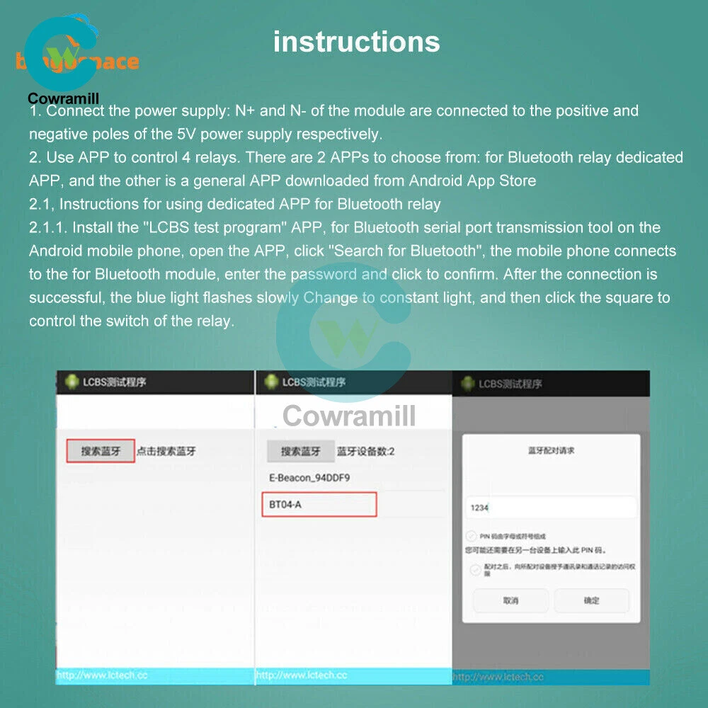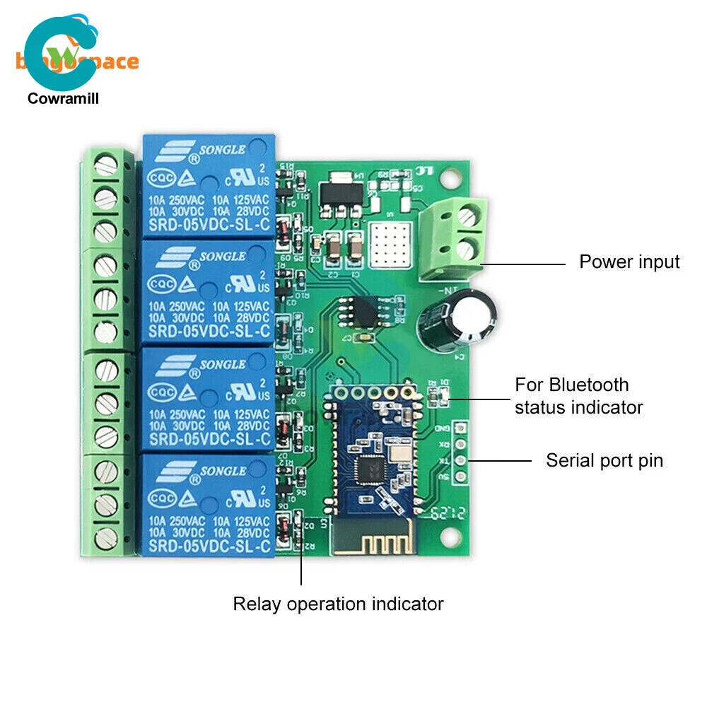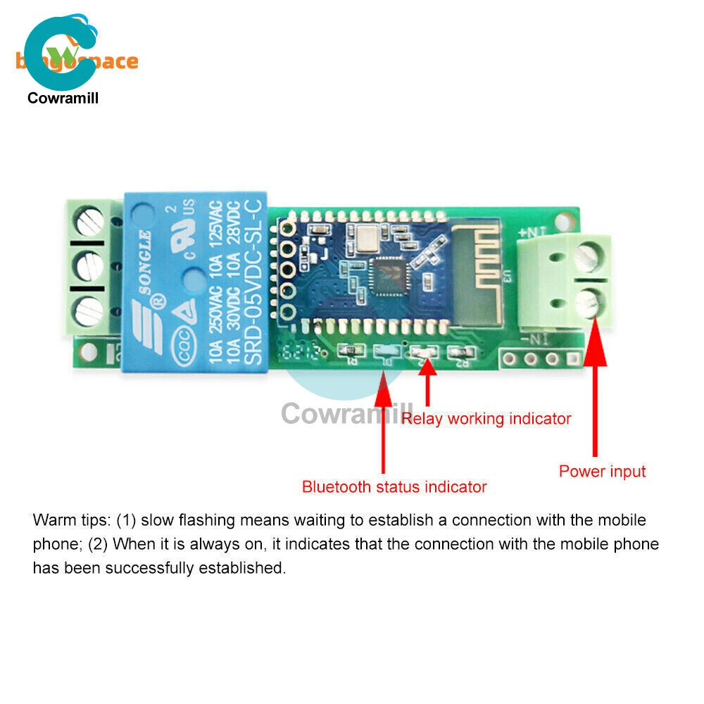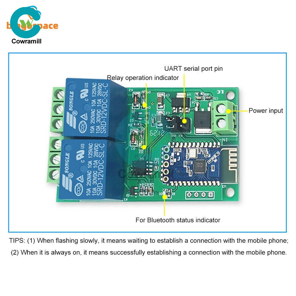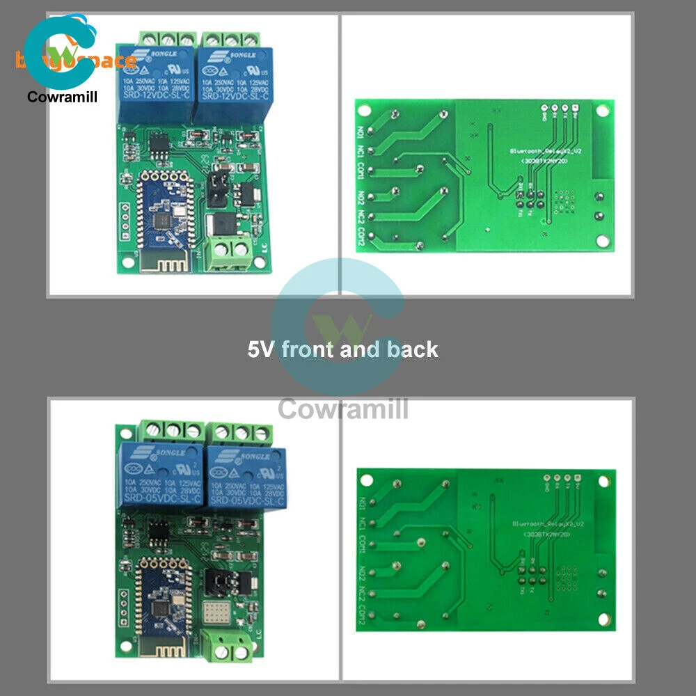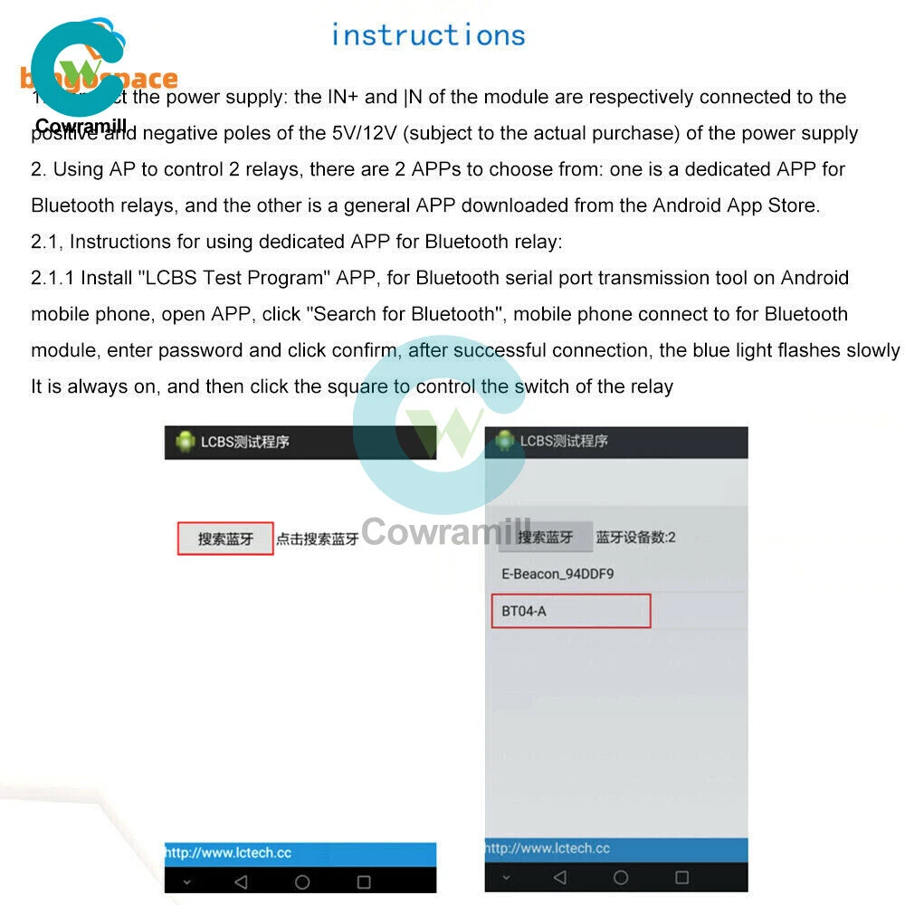 Home Payment Shipping About us Contact us Store Categories Store Categories Business, Office & Industrial Home, Furniture & DIY Computers/Tablets & Networking Sound & Vision Consumer Electronics Other Details Single-Channel: 1: Widely used 2: Control distance: 10M (open environment) 3: Provide Bluetooth relay control app 4: Stable performance 5: Easy to understand The single channel Bluetooth relay module includes one channel 5V / 10A or one channel 12V / 10A relay module and spp-c Bluetooth serial port slave module. The switch of the relay can be controlled by sending instructions through the mobile phone app. It is a new and modified version, which is more practical and more stable. Function description: 1. Onboard high-performance MCU and spp-c Bluetooth 2.1 slave module; 2. Provide Bluetooth relay control app; 3. Control distance: 10M (open environment); 4. Working voltage: DC12V; 5. On board 1-way 12V, 10a / 250V AC, 10a / 30V DC relay, which can be pulled in for 100000 times continuously, with diode leakage protection and short response time; 6. Onboard Bluetooth status indicator and relay indicator; 7. UART debugging interface is reserved, which can be used to modify Bluetooth pairing password, etc. 8. Board size: 62 * 20MM 1. Connect the power supply: the in + and in - of the module are respectively connected to the positive and negative poles of 5V / 12V (subject to the actual purchase) power supply. 2. Use app to control 1-way relay. There are two apps available: one is a special app for Bluetooth relay developed by LC electronics, and the other is a general app downloaded from Android application mall 2.1. Instructions for use of special app for Bluetooth relay: 2.1.1. Install the "lcbs test program" app and Bluetooth serial port transmission tool on the Android mobile terminal. Open the app and click "search Bluetooth". The default Bluetooth names are generally bta-04, jdy-30, spp-c, etc. connect the mobile phone to the Bluetooth module, enter the password and click OK (the initial password is 1234). After the connection is successful, the blue light changes from slow flashing to constant on, and then click the box to control the switch of the relay. detailed list: 1 * Relay module 2 Channel: 1. Description: The 5V dual circuit Bluetooth relay module consists of 2 5V//10A relay modules and a SPP-C Bluetooth serial slave module. The switch of the relay can be controlled by sending instructions from the mobile APP. 2. Functions: 1>. On-board loaded STM8S high performance MCU and SPP-C Bluetooth 2.1 slave module 2>. Provide Bluetooth relay control APP 3>. Control distance: 10M (open environment) 4>.Operating voltage: DC5V/12V(Optional) 5>. On-board 2 way 5V, 10A/250V AC 10A/30V DC relay, can be continuously absorbed 100 thousand times. With diode purging protection, the response time is short. 6>. On-board Bluetooth status indicator and relay indicator 7>. Reserve UART debug interface and STM8 SWIM program download interface 8>. Board size: 40*64.5mm 3. Operation description: 1>. Connection power: the IN+ and IN- of the module are connected to the positive and negative poles of the 5V power supply 2>. Use APP to control 2 way relay Bluetooth Relay General APP Usage Description: 2.1>. Android mobile phone installation APP “BlueSPP-37”, Bluetooth serial port transmission tool, used to send relay control instructions. Click “switch”. Then press the gray square in the interface, and then input the name and content of the 2 relay control instructions (the instruction format is HEX) respectively. 2.2>. Open “BlueSPP-37”, APP, click "connect". The mobile phone is connected to the Bluetooth module. After the connection, the blue light turns from slow flash to steady light. Click on the gray square can send instructions to control the switch of the relay. 3>. Additional functions (as USB relay) instructions: Prepare a USB to TT serial module, TTL module GND, TX, RX respectively relay module GND, TX, RX. On the computer, open the serial port debugging software (such as SSCOM32, select baud rate is 9600, send sixteen A0 (HEX) form A0 0101 A2 and A0 0201 A3, you can turn on the first, second way relay separately. The A0 0100 A1 and A0 0200 A2 are sent in the form of sixteen (HEX), and the first, second road relay can be closed respectively. Take the example of opening the relay as an example: 4 Channel: Description: Usage: Telecommunication Voltage: 5V Power Source: DC Theory: bluetooth relay LC 12V Bluetooth 4-channel relay module equip with SPP-C Bluetooth 2.1 slave module and 8 bit high performance MCU, you can control the relay with cellphone APP directly. Protect Feature: Epoxy Contact Load: Low Power Model Number: bluetooth relay module The function and characteristics: 1, On-board N76E003/STM8S003 and SPP-C Bluetooth 2.1 module 2, The relay can be controlled with APP 3, Effective control distance(on open area): 10m 4, Power supply: 12V 5, On-board 12V, 10 A / 250 v AC 10 A / 30 v DC relay, absorb 100000 times continuously, Module with diode effusion protection, short response time 6, On-board optocoupler isolation components, anti-interference ability is strongly 7, On-board Bluetooth indicator and relay indicator LED 8, On-board preserved UART debug interface(Baud rate is 9600) and MCU program interface Interface: IN+, IN-: 12V power input TX, RX: UART communication SWIM, NRST: MCU program interface LED D2/D3/D4/D5(red): Relay indicator LED D1(blue): Bluetooth state indicator, the description of D1 as below: (1)It's means wait for establishing connection with the APP when D1 blink slowly (2)It's means the Bluetooth connect with the APP successfully when D1 on all the time colour:blue Material:PCB size:62.7*63.2mm Package Contents: 1 * Module Shipping Policy Payment Method Returns Policy Shipping Policy Payment Method Returns Policy Home Payment Shipping About us Contact us Copyright©2018 datacaciques Top & Fast Shipping! Get The Right At The Right Price! 1/2/4Channel Bl