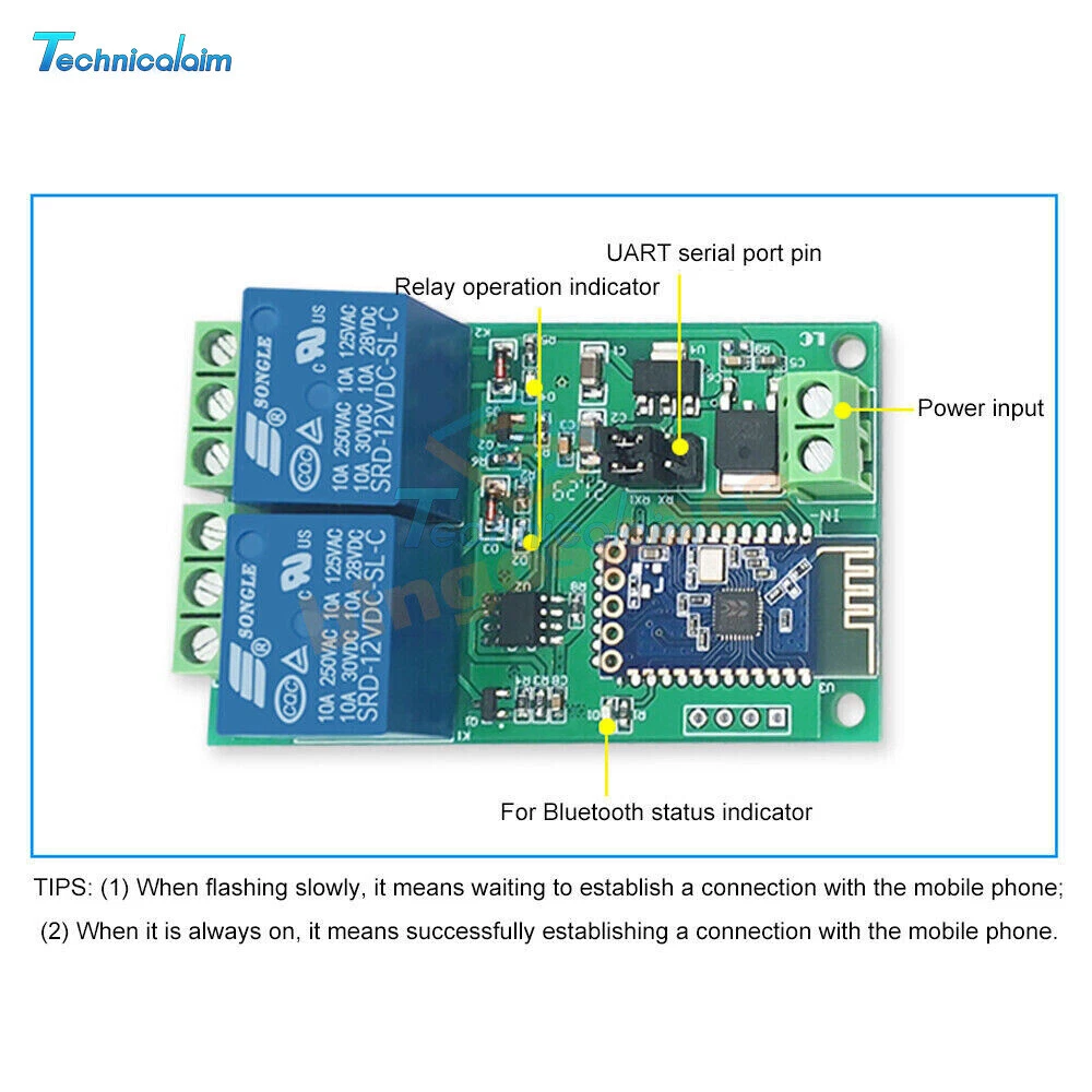 Home Payment Shipping About us Contact us Store Categories Store Categories Business, Office & Industrial Home, Furniture & DIY Computers/Tablets & Networking Sound & Vision Consumer Electronics Other Details Single-Channel: 1: Widely used 2: Control distance: 10M (open environment) 3: Provide Bluetooth relay control app 4: Stable performance 5: Easy to understand The single channel Bluetooth relay module includes one channel 5V / 10A or one channel 12V / 10A relay module and spp-c Bluetooth serial port slave module. The switch of the relay can be controlled by sending instructions through the mobile phone app. It is a new and modified version, which is more practical and more stable. Function description: 1. Onboard high-performance MCU and spp-c Bluetooth 2.1 slave module; 2. Provide Bluetooth relay control app; 3. Control distance: 10M (open environment); 4. Working voltage: DC12V; 5. On board 1-way 12V, 10a / 250V AC, 10a / 30V DC relay, which can be pulled in for 100000 times continuously, with diode leakage protection and short response time; 6. Onboard Bluetooth status indicator and relay indicator; 7. UART debugging interface is reserved, which can be used to modify Bluetooth pairing password, etc. 8. Board size: 62 * 20MM 1. Connect the power supply: the in + and in - of the module are respectively connected to the positive and negative poles of 5V / 12V (subject to the actual purchase) power supply. 2. Use app to control 1-way relay. There are two apps available: one is a special app for Bluetooth relay developed by LC electronics, and the other is a general app downloaded from Android application mall 2.1. Instructions for use of special app for Bluetooth relay: 2.1.1. Install the "lcbs test program" app and Bluetooth serial port transmission tool on the Android mobile terminal. Open the app and click "search Bluetooth". The default Bluetooth names are generally bta-04, jdy-30, spp-c, etc. connect the mobile phone to the Bluetooth module, enter the password and click OK (the initial password is 1234). After the connection is successful, the blue light changes from slow flashing to constant on, and then click the box to control the switch of the relay. detailed list: 1 * Relay module 2 Channel: 1. Description: The 5V dual circuit Bluetooth relay module consists of 2 5V//10A relay modules and a SPP-C Bluetooth serial slave module. The switch of the relay can be controlled by sending instructions from the mobile APP. 2. Functions: 1>. On-board loaded STM8S high performance MCU and SPP-C Bluetooth 2.1 slave module 2>. Provide Bluetooth relay control APP 3>. Control distance: 10M (open environment) 4>.Operating voltage: DC5V/12V(Optional) 5>. On-board 2 way 5V, 10A/250V AC 10A/30V DC relay, can be continuously absorbed 100 thousand times. With diode purging protection, the response time is short. 6>. On-board Bluetooth status indicator and relay indicator 7>. Reserve UART debug interface and STM8 SWIM program download interface 8>. Board size: 40*64.5mm 3. Operation description: 1>. Connection power: the IN+ and IN- of the module are connected to the positive and negative poles of the 5V power supply 2>. Use APP to control 2 way relay Bluetooth Relay General APP Usage Description: 2.1>. Android mobile phone installation APP “BlueSPP-37”, Bluetooth serial port transmission tool, used to send relay control instructions. Click “switch”. Then press the gray square in the interface, and then input the name and content of the 2 relay control instructions (the instruction format is HEX) respectively. 2.2>. Open “BlueSPP-37”, APP, click "connect". The mobile phone is connected to the Bluetooth module. After the connection, the blue light turns from slow flash to steady light. Click on the gray square can send instructions to control the switch of the relay. 3>. Additional functions (as USB relay) instructions: Prepare a USB to TT serial module, TTL module GND, TX, RX respectively relay module GND, TX, RX. On the computer, open the serial port debugging software (such as SSCOM32, select baud rate is 9600, send sixteen A0 (HEX) form A0 0101 A2 and A0 0201 A3, you can turn on the first, second way relay separately. The A0 0100 A1 and A0 0200 A2 are sent in the form of sixteen (HEX), and the first, second road relay can be closed respectively. Take the example of opening the relay as an example: 4 Channel: Description: Usage: Telecommunication Voltage: 5V Power Source: DC Theory: bluetooth relay LC 12V Bluetooth 4-channel relay module equip with SPP-C Bluetooth 2.1 slave module and 8 bit high performance MCU, you can control the relay with cellphone APP directly. Protect Feature: Epoxy Contact Load: Low Power Model Number: bluetooth relay module The function and characteristics: 1, On-board N76E003/STM8S003 and SPP-C Bluetooth 2.1 module 2, The relay can be controlled with APP 3, Effective control distance(on open area): 10m 4, Power supply: 12V 5, On-board 12V, 10 A / 250 v AC 10 A / 30 v DC relay, absorb 100000 times continuously, Module with diode effusion protection, short response time 6, On-board optocoupler isolation components, anti-interference ability is strongly 7, On-board Bluetooth indicator and relay indicator LED 8, On-board preserved UART debug interface(Baud rate is 9600) and MCU program interface Interface: IN+, IN-: 12V power input TX, RX: UART communication SWIM, NRST: MCU program interface LED D2/D3/D4/D5(red): Relay indicator LED D1(blue): Bluetooth state indicator, the description of D1 as below: (1)It's means wait for establishing connection with the APP when D1 blink slowly (2)It's means the Bluetooth connect with the APP successfully when D1 on all the time colour:blue Material:PCB size:62.7*63.2mm Package Contents: 1* Module Shipping Policy Payment Method Returns Policy Shipping Policy Payment Method Returns Policy Home Payment Shipping About us Contact us Copyright©2018 datacaciques Top & Fast Shipping! Get The Right At The Right Price! 1/2/4Channel Blu