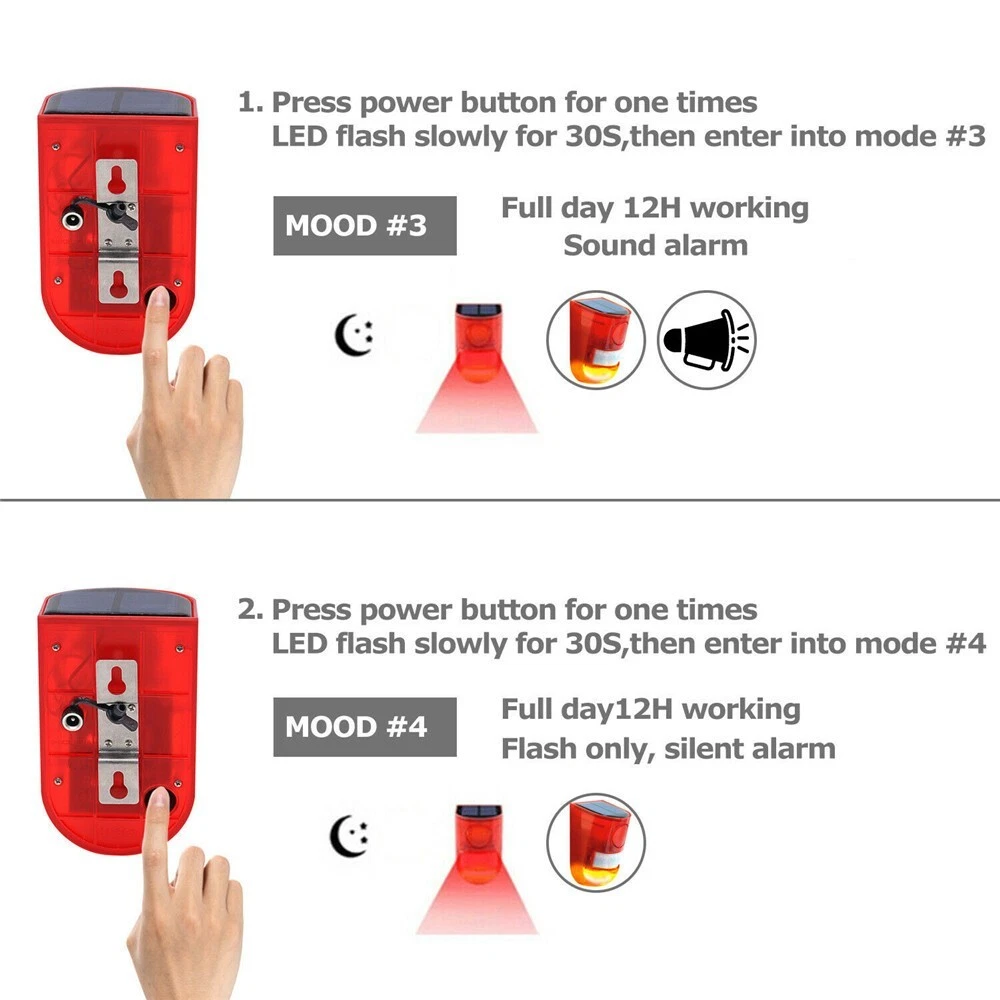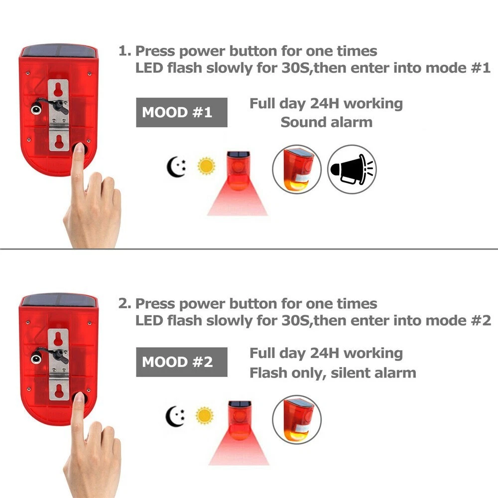 1/2/4/6/8Pcs Solar Alarm LED Light Solar Strobe Light Wireless Motion Sensor Detector Outdoor # Ship within 24 hours. # 100% New & Excellent Quality # Strictly QC, Each item was fully checked before shipping # FREE & FAST Shipping delivery with Tracking Number ✔️ Features: 1.Solar acoustooptic alarm lamp has two functions, the first mode is 24-hour induction acoustooptic alarm in daytime. 2.The second mode is night mode (no daytime induction,dark induction acoustooptic alarm), induction distance of 5-8 meters. 3.Modal induction angle 110 degrees, solar light about 6 hours full of electricity, a charge can be used 24 hours a day for 30 days of ultra-long duration, 365 days continuous power, no power-consuming alarm lights. 4.It is suitable for farms, villas, orchards, tea gardens, farms, factory warehouses and other places. ✔️ Function: Daytime mode (24-hour induction acoustooptic alarm) Night mode (no daytime induction, dark induction acoustooptic alarm) Only flashing lights during the day without sound Only flashing at night without sound ✔️ Specifications: * Solar panels: 5V*0.6W polycrystalline silicon * LED: 6 flash red lights, 1000 meters visible * Product Material: ABS * Size: 4.72''x2.72"/120x69mm * Waterproof grade: IP65 * Induction Angle: Film Induction Angle 110 Degree * Charging Method: Solar Energy Charging * Alarm sound: 110 decibels (1000 meters clear) * Induction distance: 5-8 m/16.4-26.2 ft (affected by ambient temperature) * Battery parameters: 3.7V*400mAh full capacity polymer lithium battery * Working hours: induction 45 seconds or so sound and light alarm more than 300 times, once charged, standby for 30 days ✔️ Package Included: 1/2/4/6/8PC Solar Warning Light. Detail Image: Payment: 1.We accept ebay payment only. 2.All major credit cards are accepted through secure payment processor ebay payment. Shipping: 1.We ship to your eBay or ebaypayment address. Please make sure your eBay and ebaypayment address is correct before you pay. 2.Items will be shipped within 1-3 business day when we received payment. 3.Delivery time depends on destination and other factors; 4.International buyers please note: a.Import duties, taxes and charges are not included in the item price or shipping charges. These charges are buyer’s responsibility. We will try our best to reduce the risk of the custom duties. b.Please check with your country's customs office to determine what these additional costs will be prior to buying. Returns: Please contact me before opening any return,don't worry, I will definitely solve your problem.thank you!!! 1) If you received an incorrect, damaged, defective, or item not as described, contact us for a partial/full refund or replacement on our cost. 2) If you want to return the item, please contact us within 30 days after package received. Return products must also be in its original condition: including box, packaging and all other accessories. Payment 1.We accept PayPal only! 2.Please keep the consistency of the address from Paypal and eBay. 3.Payment must be received within 3 days since you won the item, or eBay will launch Unpaid Reminder Against you. Delivery Details 1. All items will be shipped to buyer's ebay address,we don't take charge for wrong address left. 2. All items will be shipped within 24 working hours upon receipt of payment, and multiple items will be combined shipping. 3. In most cases, delivery takes around 1-7 business days from US Warehouse by UPS/USPS, it's highly depended on the efficiency of the shipping carrier. If your item doesn't arrive on time, please contact us immediately for further assistance. Please note there is no local pickup service available. Term of Sales Customer satisfaction is our top priority. Please message us over the eBay messages. All returns must have RMA number. Returns with no RMA number will be avoided! Changed your mind and don't want the item anymore? No Problem! Please contact us within 30 days. We do not charge restocking fee unless the item you are returning is Brand New. Defective/Dead items will be fully refunded or replaced after matching the serial number with the one in our records. Order/bid cancellation: We can cancel your order only if you contact us within 15 min after your purchase. No exceptions. If your order arrives incorrect or the package is damaged in result of a carrier company, you must notify us within 2 days of receipt. We are aware of all fraud cases and have all the items details in our records. If the goods are not defective, you will be responsible for the return postage costs. Returned item must include all previously included accessories. No restocking fee will apply. If there is a quality issue or malfunction with the product, we strongly suggest you to contact us asap. Any item needed to be returned must be securely packaged, insured and shipped with tracking for safety. We cannot be responsible for lost damaged packages. We carefully inspect returned items upon receipt before any possible refunds, credits, or exchanges. Thank you for purchasing from us We are professional manufacturer seller. All products are factory direct sales, best quality at best price.We strive for 100% customer satisfaction. We maintain high standards of excellence and strive for 100% customer satisfaction. Positive feedback with 5 star rating is very important to us. Please give us a chance to resolve any issues before posting a neutral or negative feedback. Thanks a lot. 1. All items will be shipped to buyer's ebay address,we don't take charge for wrong address left. 2. All items will be shipped within 24 working hours upon receipt of payment, and multiple items will be combined shipping. 3. In most cases, delivery takes around 2-3 business days from UK Warehouse by RoyalMail, it's highly depended on the efficiency of the shipping carrier. If your item doesn't arrive on time, please contact us immediately for further assistance. Please note there is no local pickup service availabl