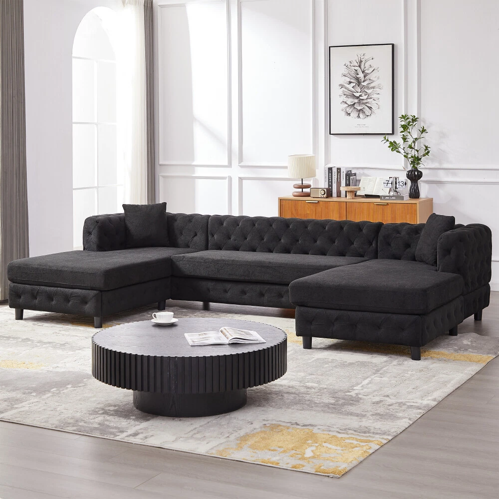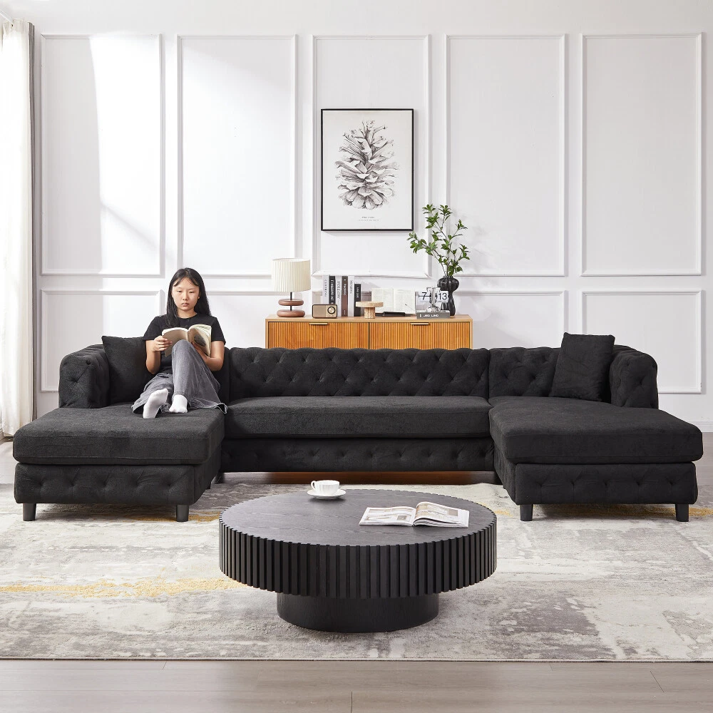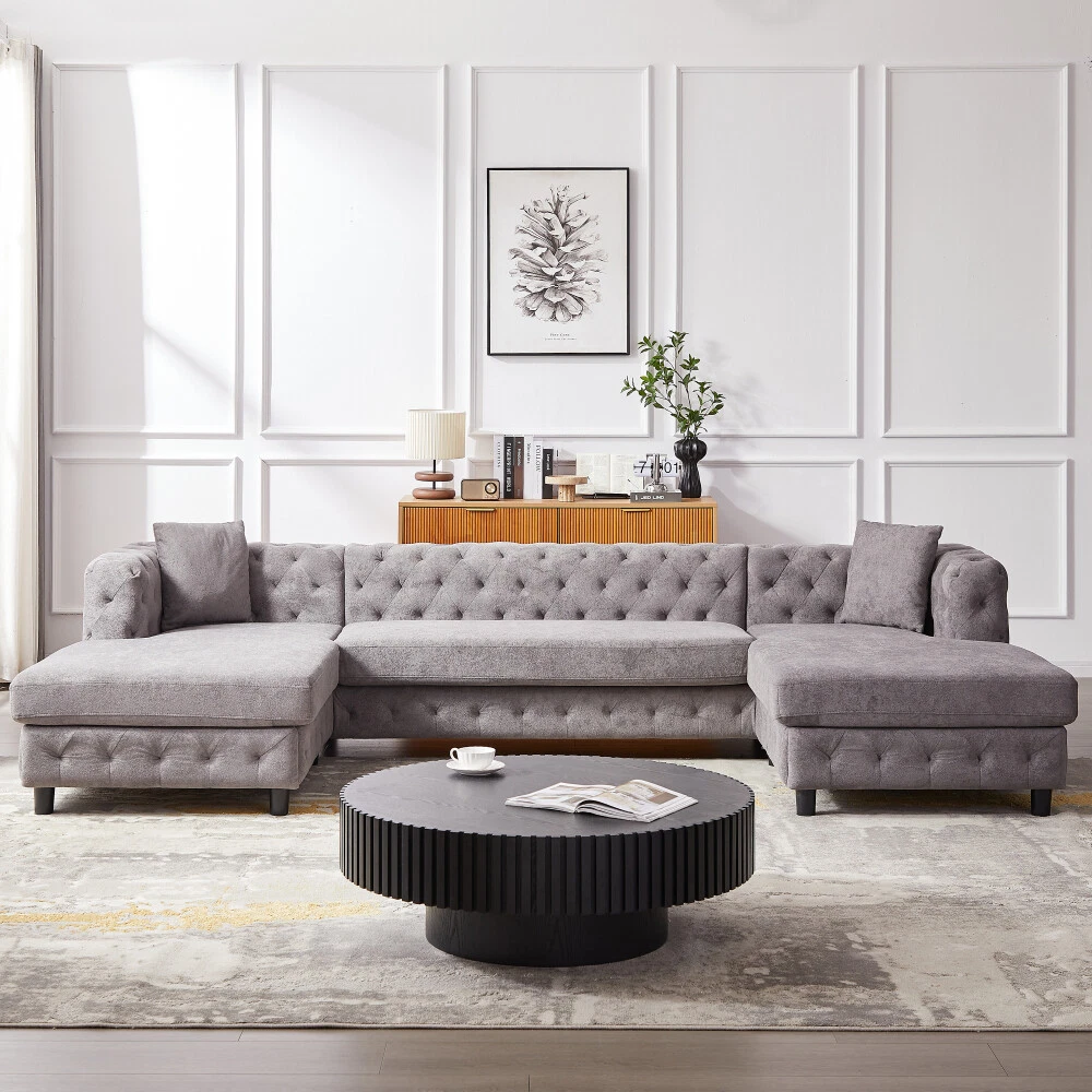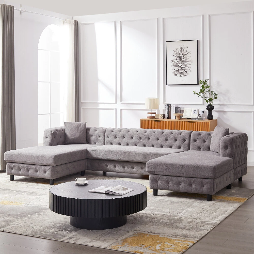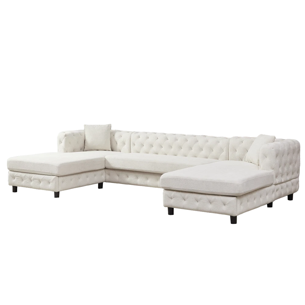 This U-shaped sectional is a dream for lounging—super soft chenille fabric feels luxurious, and the pull-point detailing adds elegant texture. The two chaise seats make it perfect for movie nights, offering plenty of space to stretch out. Comes with comfy pillows, and the sturdy plastic legs keep it stable. Easy to clean (just wipe with a damp cloth), though avoid direct sunlight. Arrives in four boxes for manageable setup. Love how spacious and cozy it is!