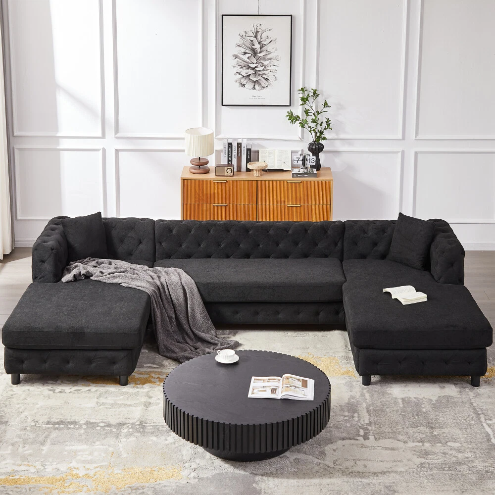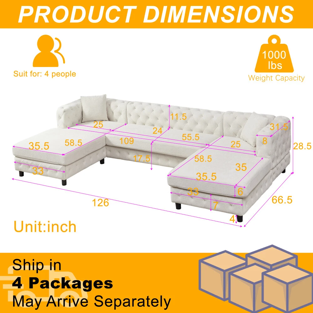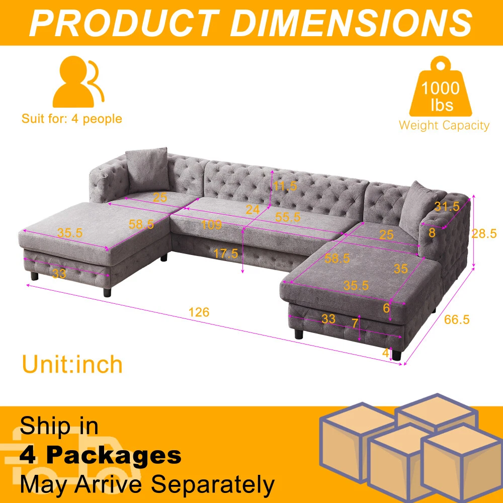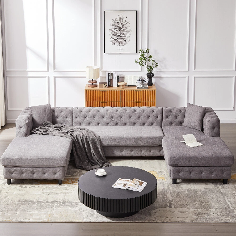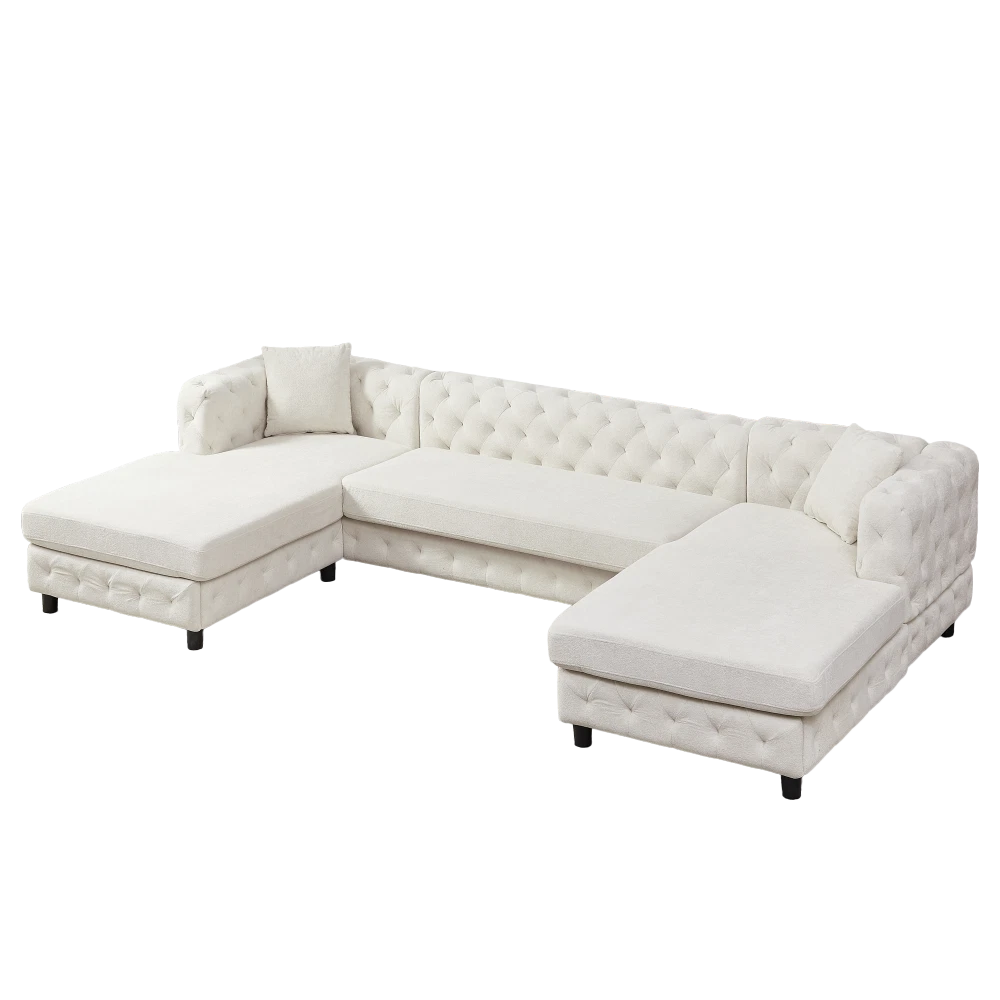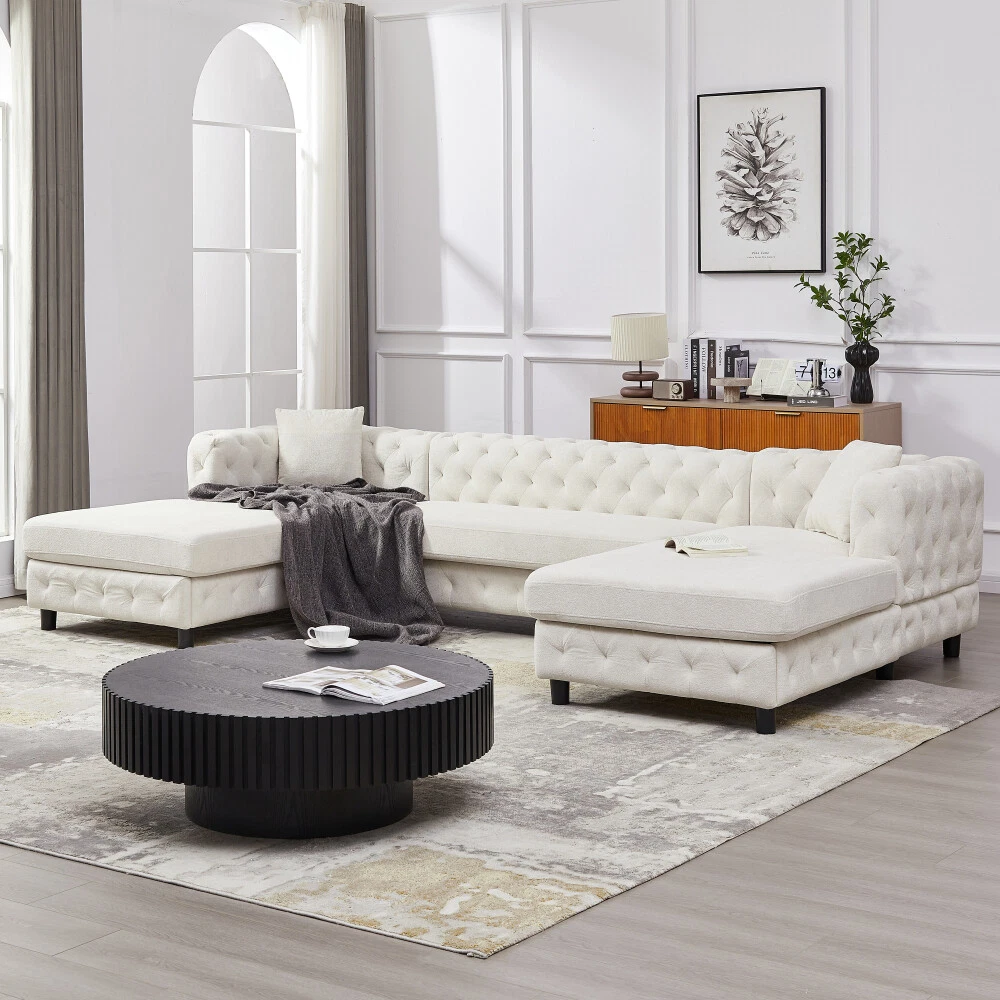 This U-shaped sectional is a dream for lounging—super soft chenille fabric feels luxurious, and the pull-point detailing adds elegant texture. The two chaise seats make it perfect for movie nights, offering plenty of space to stretch out. Comes with comfy pillows, and the sturdy plastic legs keep it stable. Easy to clean (just wipe with a damp cloth), though avoid direct sunlight. Arrives in four boxes for manageable setup. Love how spacious and cozy it is!