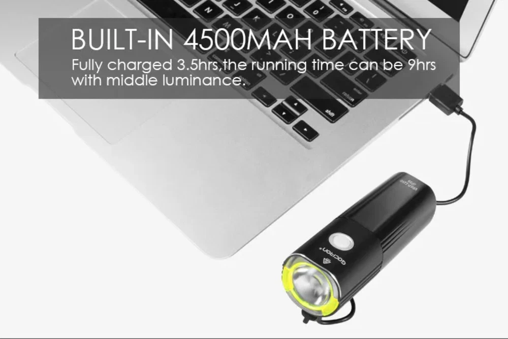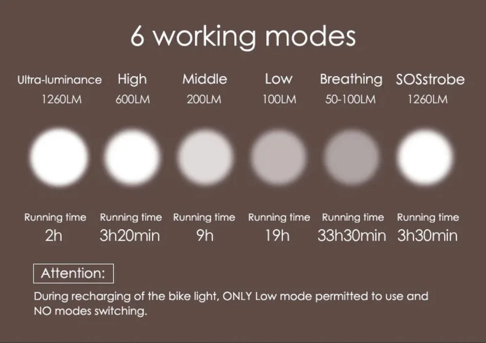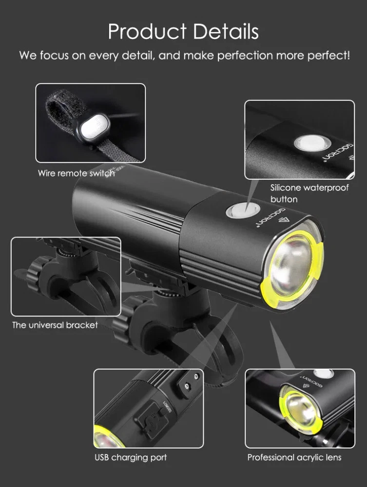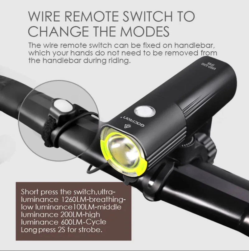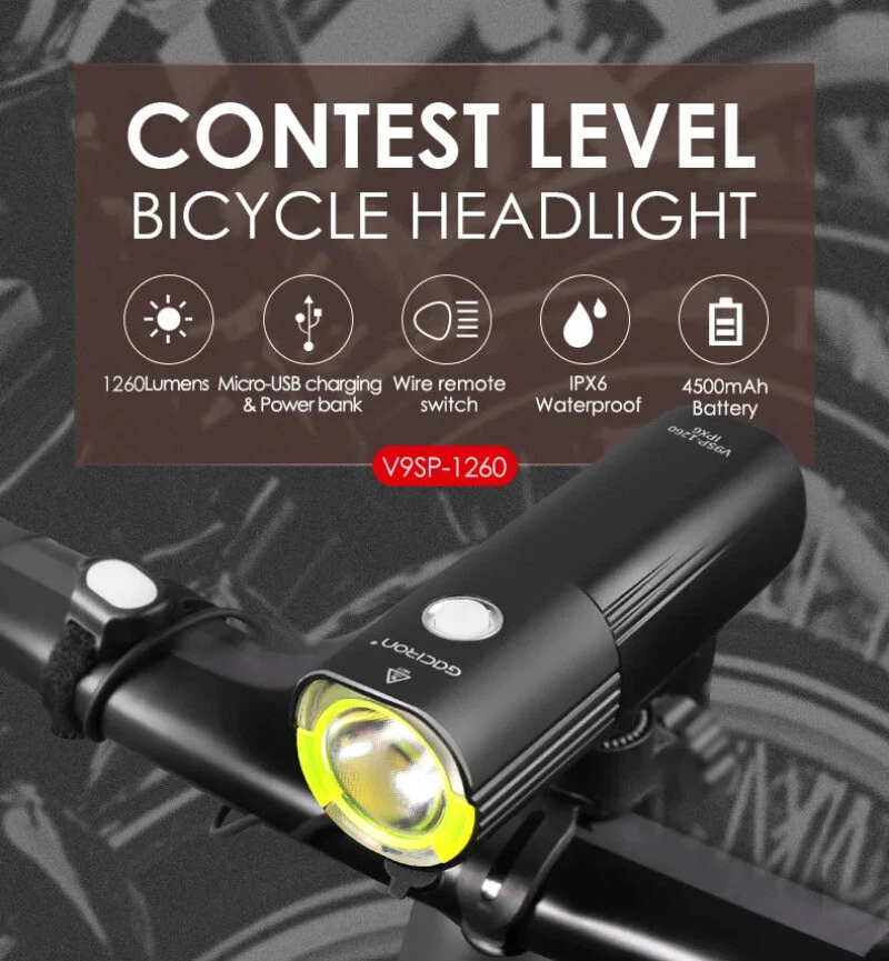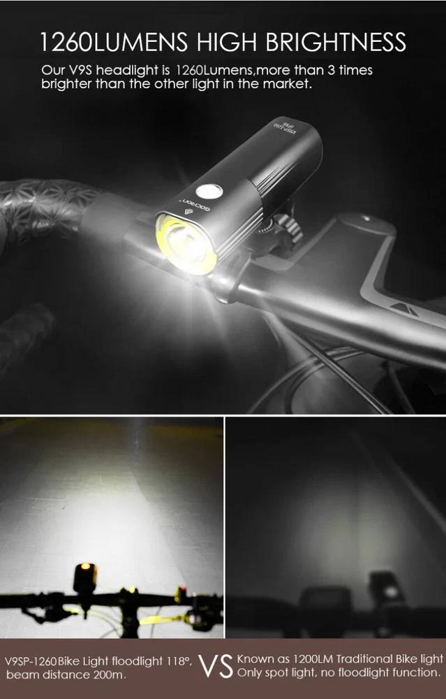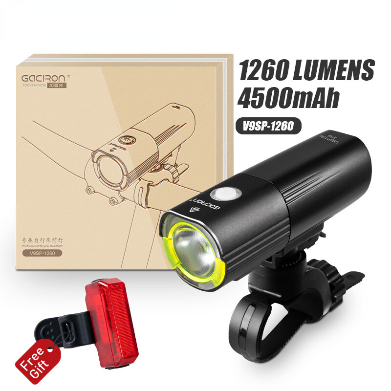 Bike Light V9SP 1260 Lumens MTB Headlight 4500mAh USB Rechargeable Bike Accessories Bicycle Lights Waterproof Cycling Front Lamp For Riding. Features: - 1260 lumens High Brightness - Micro-USB charging & Power bank - R01 Wire Remote Control Switch - IPX6 Waterproof - 4500mAh Large Capacity Battery - Aluminum Alloy CNC Housing Description: - 1 * CREE XML2 as light sources, grants up to 1260lumen max, one of the brightest of its kind; - Optional 6 light modes , to meet different needs of light brightness; - Overheat protection circuit ensures stable and long service life; - Comes with detachable wired switch for handy mode change; - Built-in quality battery provides long run time up to 34 hours - Sturdy built bracket for firm and wide dia. mount; - Quick mount and release . Specification: - Brand Name: GACIRON - Product Name: V9SP-1260 - LED: CREE XML2 - Highest Brightness: 1260 Lumens - Floodlight Angle:118° - Battery: 26650 3.7V 4500mAh - Input:Micro 5V/2.0A - Output:USB 5V/1.0A - Beam Distance:>200m - Waterproof Level: IPX6 - Net Weight: 193.6g - Size:113*39*42mm - Charging Time:3.5h - Material: Aluminum Alloy CNC Housing Package includes: - 1*V9SP-1260 Bicycle Headlight - 1*H07P Holder - 1*USB Cable - 1* R01 Wire Remote Switch - 1*User Manual 1, The light gets hot in use and it has overheat protection by lowering brightness when it detects over heat. And when it cools down, the lamp restores the previous brightness mode. Lamp turns off by itself when detecting internal temperature to 90 degrees celcius. Hello, we updated the V9S-1000 to new version V9SP-1260, which has higher brightness 1260lm, instead of 1000lm. And high 600lm, instead of high 400lm. Other parameters remain unchanged. We will send you the new V9SP-1260, which has a better illumination performance. Best wishes!