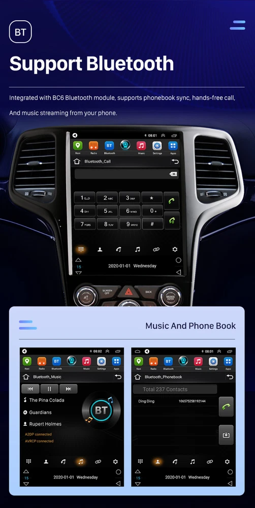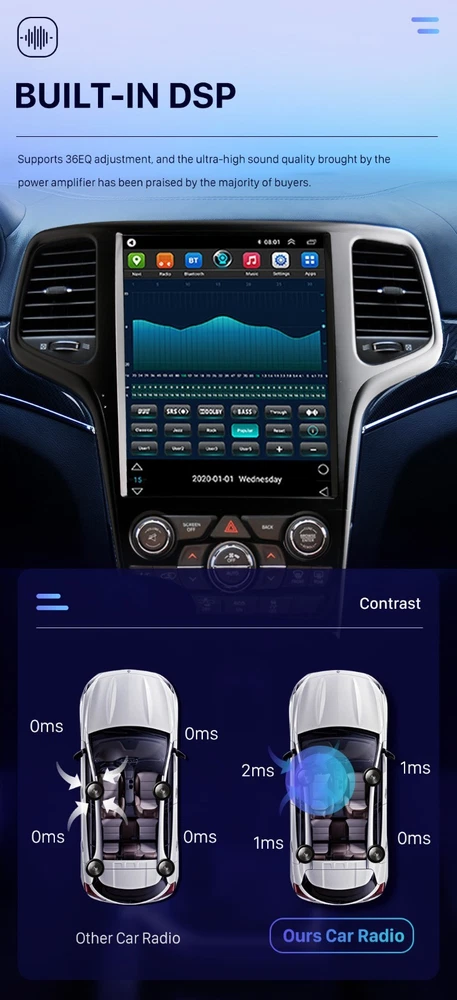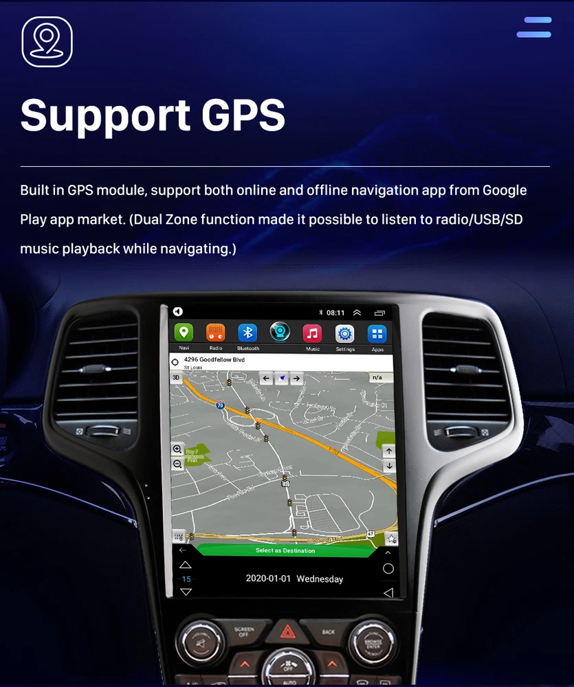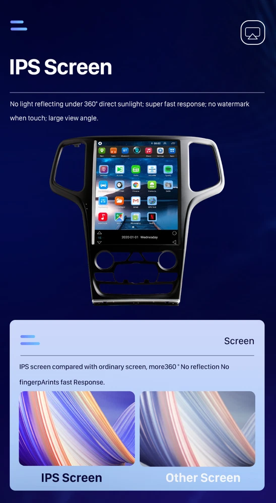 About this item 【 Applicable models 】 This Android car radio is suitable for Jeep Grand Cherokee 2014/2015/2016/2017/2018/2019/2020. The Jeep Grand Cherokee car stereo equipped with 8 Core+2GB RAM+32GB ROM. If you are not sure whether it is suitable for your model when you buy it, please send me the photo of the car dashboard, and we have professional engineers to confirm the model. As well as after-sales installation and use, you can contact us at any time, and we will reply to you in the shortest time. 【 GPS navigation 】 The car radio for Jeep Grand Cherokee has a built-in GPS navigation. You can download Maps (offline Maps) from the Store, or open Maps (online Maps) via the Internet. gps navigation for car,You can find your own way without using the Internet and bring you a happy trip. 【 Bluetooth/FM.AM. RDS 】 Car stereo with bluetooth, With this car radio, its bluetooth radio for car function can make your journey more enjoyable and safer to drive. Hands-free answering calls, checking the phone book, playing music FM. AM The car radio can listen to news and real-time road conditions while driving. 【 Car multimedia stereo player touch screen/DSP/split screen 】 Touch screen radio system for car. This car navigation uses high-end 12.8 Inch QLED 2.5D IPS capacitive multi-touch, with color button lights . High-definition display (768*1024), MP4, MP5 high-definition video player (1080P)/DSP sound quality equalizer, let you listen to more beautiful music/car multimedia supports split-screen playback. 【 Operating System/UI Interface 】 This car radio is a multimedia navigation system for Android 14 radio Mirror link /Apple carplay. The Android system can download all kinds of APP applications you like, more than 50 languages are available for selection, a variety of UI display interfaces for you to choose. Support the original car multi-function steering wheel. car stereo with apple carplay. 12.1 inch Android Car Radio Product Parameters Operating System Stable and Real Android 14 Operating System Screen Size 12.1 inch T Style Touch Screen Radio Screen Resolution QLED 1280*720 Din Type Double Din Car GPS Radio CPU Quad Core 2GB RAM + 32GB ROM EQ Build in DSP-32 Equalizer Radio AM, FM, RDS Build in WiFi Support online navigating, apps downloading, etc. Remarks Support Wired & Wireless Android Auto and Apple CarPlay APK Installer Support Android Package installer Backup Camera Support AHD 720P Backup Camera ( included ) More Functions Steering Wheel Control, Support 5G Network, Build in WiFi, Blutooth, GPS, etc. Compatible Car Models For Toyota Land Cruiser LC100 Lexus LX470 2002-2007 Product Description For Jeep Grand Cherokee 2014 2015 2016 2017 2018 2019 2020 Android 14 system, provides the Multi-task function, users can operate on radio/music/video while using navigation Steering Wheel Control 12.8 inch HD Capacitive Touch Screen, Super High Definition with 768 x 1024 pixel Build in 2+ 32GB Flash Memory for Music/Navigation Map Data/Video AM/FM/RDS Radio, Auto Memory Store/Preset Scan Build-in Bluetooth 5.0 with A2DP/Hands Free/Phone book 2 x Rear USB Input Build-in GPS receiver, compatible with Waze/Navfree/Google/Yandex Map etc Back Camera Input Preset Multi EQ Settings with 32 Band DSP Volume/Fader/Balance/Treble/Bass Control Multimedia Player Compatibility with all format 4 x 45W Power Output, 4.1 Channel RCA/Sub output, 1 Channel Video Input, 2 Channel Audio Input Apple Car-Play,the smarter,safer and more fun way to use your iPhone in the car. Apple CarPlay gives iPhone users an incredibly intuitive way to make calls,use Maps, listen to music,and verbally send and listen to messages with just a word or a touch. Apple CarPlay requires iPhone 5 or newer with the latest version of IOS. Android Auto,which extends the Android platform into the car in a way that’s purpose-built for driving. Android Auto automatically brings you useful information and organizes it into simple cards that appear just when they’re needed. It’s designed to minimize distraction so you can stay focused on the road ahead. Multiple Applications Downloads You can connect to the Internet in a variety of ways, download various applications through the app store, such as YouTube, Facebook, etc., so that your driving journey is not lonely and boring, and increase the fun of driving. Car Radio with Apple Carplay This double din car stereo apple carplay supports Apple carplay. After connecting to IOS through the original mobile phone data line, you can make calls, access map, and access music. Send and receive information, get directions, etc. Can also be done through SIRI. 1024*768P HD video playback Equipped with the latest video decoder, supports playing HD video and is compatible with most video formats,alowing you and your passengers to view your favorite movies on the road. car stereo video for Cadillac Escalade radio car stereo Car Stereo with Bluetooth Car Radio For Jeep Grand Cherokee car stereo with Bluetooth support dluetooth call and music, support hands free, free hands, make driving safer, Bluetooth music and mobile phone music play simultaneously, say goodbye to driving and calling violations! Support WIFI The car stereo supports WiFi hotspot connection. You can easily access and download online navigation apps, Instagram, YouTube, Facebook, TikTok, etc. from the Google Play Store. After connecting to WiFi/hotspot, it can be used as a multi - functional iPad, bringing you a pleasant driving journey. Built-in DSP Sound System With the built-in Digital Signal Professor (DSP) , you can enjoy high-fidelity soundquality with our car stereo,higher then the quality of the peer car level, the ultimatechoice of enthusiasts Car stereo with backup camera The car radio with backup camera is equipped with a reversing waterproof night vision camera. When you switch to reverse gear, the screen will automatically switch to the parking rear view, and the reversing image will be clearly displayed on t
