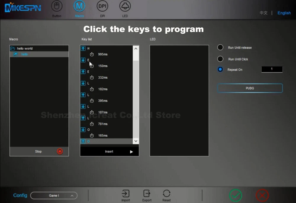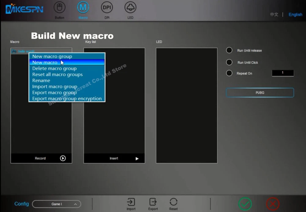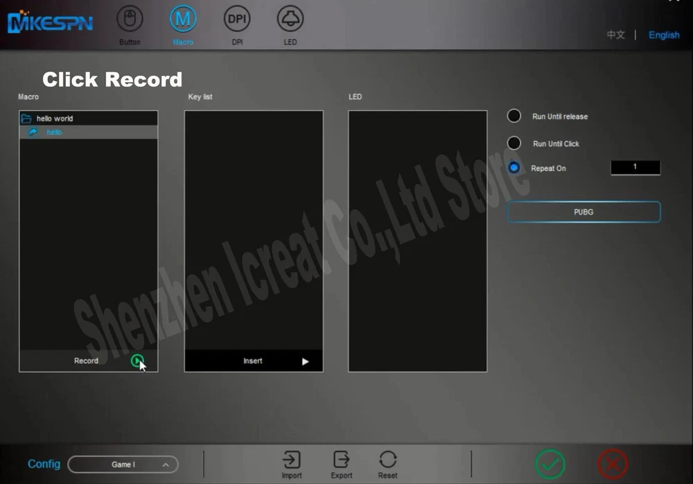 12800DPI Free Weight Macro RGB Gaming Mouse 12 Programmable Keys Game Mouse RGB Light Max to 6 levels For pc mac gun PUBG Laptop 13 kinds RGB backlight Equipped with 13 knids of RGB cool lighting effects of about 16.8 million colors. Between the illuminating of light and shadow, the trend becomes extraordinary. SKIN-LIKE FEEL COMFORTABLE Ergonomic design, the streamline curve fits the player's fingers better, Skin-like feel, comfortable grip, quicker operation. FREE WEIGHT ADJUST ABLE FEEL In order to adapt players with different hand feel, 5g-10g-15g counterweight irons are equipped. Give it a better feel and stability by customizing the weight. How To Macro 1.Click Macro 2.Build New Group 3. Build New macro 3. Define new name 4. Click the record button. 5. Type the keys you want to program. When finishing, please type Stop. 6. THIS IS VERY IMPORTANT. There are 2 ways to upload the macro, Macro and Convert K1. If you choose Macro, you only need type Programmed key on mouse. It will show the programmed information. Take an example, We take "hello" macro to key 6. If you press key 6,it will show "hello". Convert K1 like a switch. If you choose it, you type Programmed key on mouse,liking open switch, and than you press left button. It will show the programmed information. Finally, you type the Programmed key again, liking close switch. You press left button, there is no information out. It likes a switch. When you use, you open it. Take an example, We take "hello" macro to key 6. If you press key 6 and than type left button. it will show "hello". If you do not press left button, it will show nothing. You press key 6 again, meaning close switch. 7. Click √ to save. GUN GAME