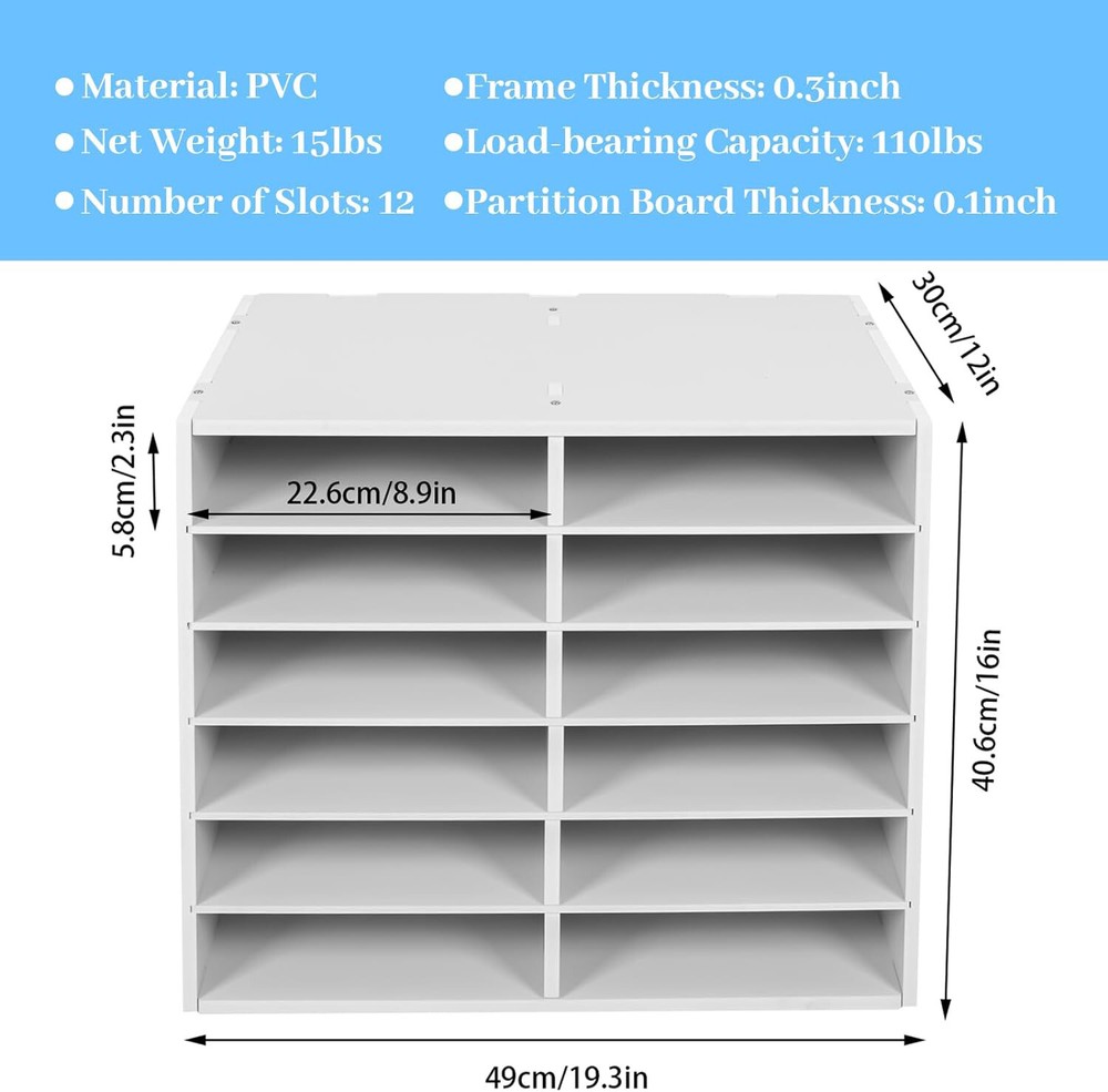 12Compartments Literature Organizer File Sorter Mail Center Holder Paper Cabinet Description The piles of messy documents on the desk make us feel bad, spend a lot of time looking for them, and slow down our work efficiency. This literature organizer offers a great solution to these problems. Made of thickened PVC, it is strong, durable, and has a strong load-bearing capacity(50kg/110lbs). The large size (19.3*12*16inch) can meet your daily storage needs and it is your ideal choice! Specification Color: White Material: PVC Shape: Rectangular Style: Modern Number of Slots: 12 Load-bearing Capacity: 50kg/110lbs Net Weight: 7kg/15lbs Gross Weight: 7.5kg/16.5lbs Product Size: 49*30*40.6cm/19.3*12*16inch Each Slot Size: 22.6*30*5.8cm/8.9*12*2.3inch Frame Thickness: 10mm/0.3inch Partition Board Thickness: 5mm/0.1inch Package Included 1* Literature Organizer 1 Pair* Gloves 1* Sandpaper 1* English Installation Diagram 1* Schematic Diagram of Sandpaper Grinding All Accessories for Assembly Key Features Strong and Durable: This product is made of high-quality PVC, which is wear-resistant, shock-resistant, strong, durable, and not easy to deform. Large Storage Capacity: This product is large with 12 slots and each slot (8.9*12*2.3inch) can store about 400 A4 sheets, which can meet your daily storage needs. Meanwhile, you can disassemble the partition boards to place high objects. This can make the space out of clutter and back to a neat and organized state. Open Design: It adopts an open design, allowing you to easily access items. This can save you lots of time. Good Stability: The rectangular shape and thickened PVC frame (10mm/0.3inch) ensure good stability and allow it to have a strong load-bearing capacity of 50kg/110lbs, so you don't need to worry about it shaking or tipping. Multiple Usage Scenarios: It can be used in schools to sort students' assignments or organize tablets in the classroom, and can be put in the office to present brochures and flyers for guests. Meanwhile, the studio can use it to arrange art supplies and letter-size paper stock. Easy Assembly: This product is simple in structure and complete in the package. You only need a few simple steps to install it, which is very time-saving and labor-saving. Modern Style: The pure white color, rectangular shape, and delicate lines make it stylish to blend in with different decor styles and add color to the space. Easy to Clean: The surface of this product is smooth and flat, which is easy to clean. You just need to wipe it with a wet rag. Guaranteed Customer Service: We aim to provide quality products and services. If you have problems, please feel free to contact us. We will reply and solve the problem for you as soon as possible. Details Thickened Top Panel: The thickened top has a strong load-bearing capacity, which allows you to put a lot of items on it with peace of mind. It can also facilitate your access to commonly used objects. Globes: A pair of gloves are included in the package, which can protect your hands from getting hurt while installing. Sandpaper: You can use it to polish the edges of the board to prevent scratching your hands. Application It is suitable for classifying and storing literature, magazines, comic books, files, student assignments, binders, catalogs, diaries, papers, documents, etc, and can be used in the home, school, office, and other places with a load-bearing capacity of 50kg/110lbs. Notes Please read the English installtaion diagram completely before installation. Please allow the slight color difference caused by the shooting light and 1-3cm error due to manual measurement, and make sure you do not mind before ordering. Payment Delivery details Terms of sales About us Contact us Payment We accept ebay payment 。 Fees such as import duties, taxes are not included in the item price or shipping costs. These charges are the buyer's responsibility. Delivery details Shipping: 2-9 working days to: USA Terms of sales We maintain high standards of excellence and strive for hundred percent customer satisfaction. Feedback is very important to us. We hope that you contact us immediately before you give neutral or negative feedback, so that we can address your concerns. It is impossible to address issues if we do not know about them! About us Your satis faction is our ultimate goal. We work hard to earn your trust and future business. Our certified technicians have tested each item before shipping. The unit comes with 1 year limited warranty on all manufacturing defects. a) If you receive a defective item, you may return it or ask for a discount. Please contact us within 14 days after you receive the package. b) What you returned must be intact and in its original packaging as re? u. Customer is responsible for shipping costs of the returned item. c) We will cover the cost of shipping back t with the shipping rate indicated in the registration page. We will send you a new unit or refund the full payment you paid. Thank you. Contact us Business Hour Business Hour: Monday To Friday: 8:30 AM to 5:00 PM (Beijing China time) Due to time zones, our reply to your questions may not be immediately. But within above working time, we will reply your email within 24 hours. If it's non-workdays, please kindly be patient and wait till Monday. Please contact us with ebay message. Please feel free to contact us if you have any questions. Monday To Friday: 8:30 AM to 5:00 PM (Beijing China time) Due to time zones, our reply to your questions may not be immediately. But within above working time, we will reply your email within 24 hours. If it's non-workdays, please kindly be patient and wait till Monday. Please contact us with ebay message. Please feel free to contact us if you have any questions.