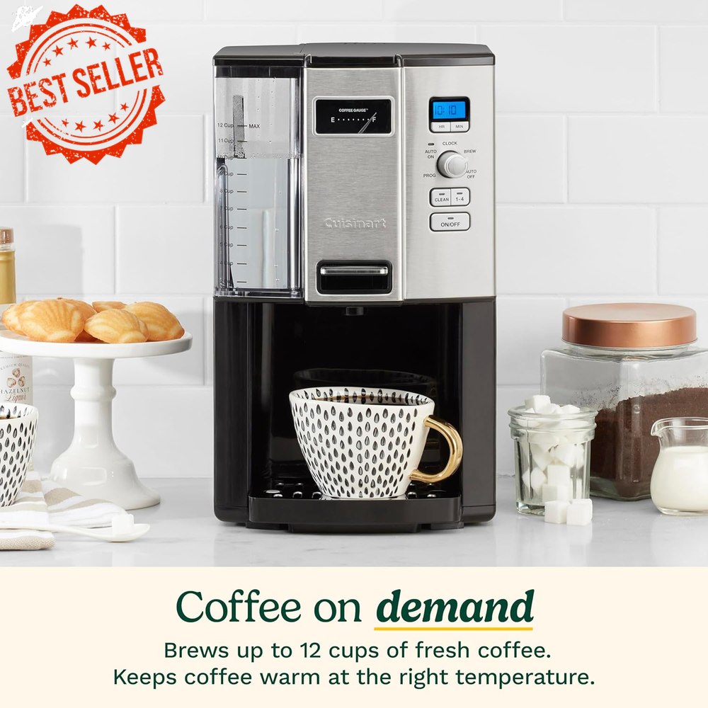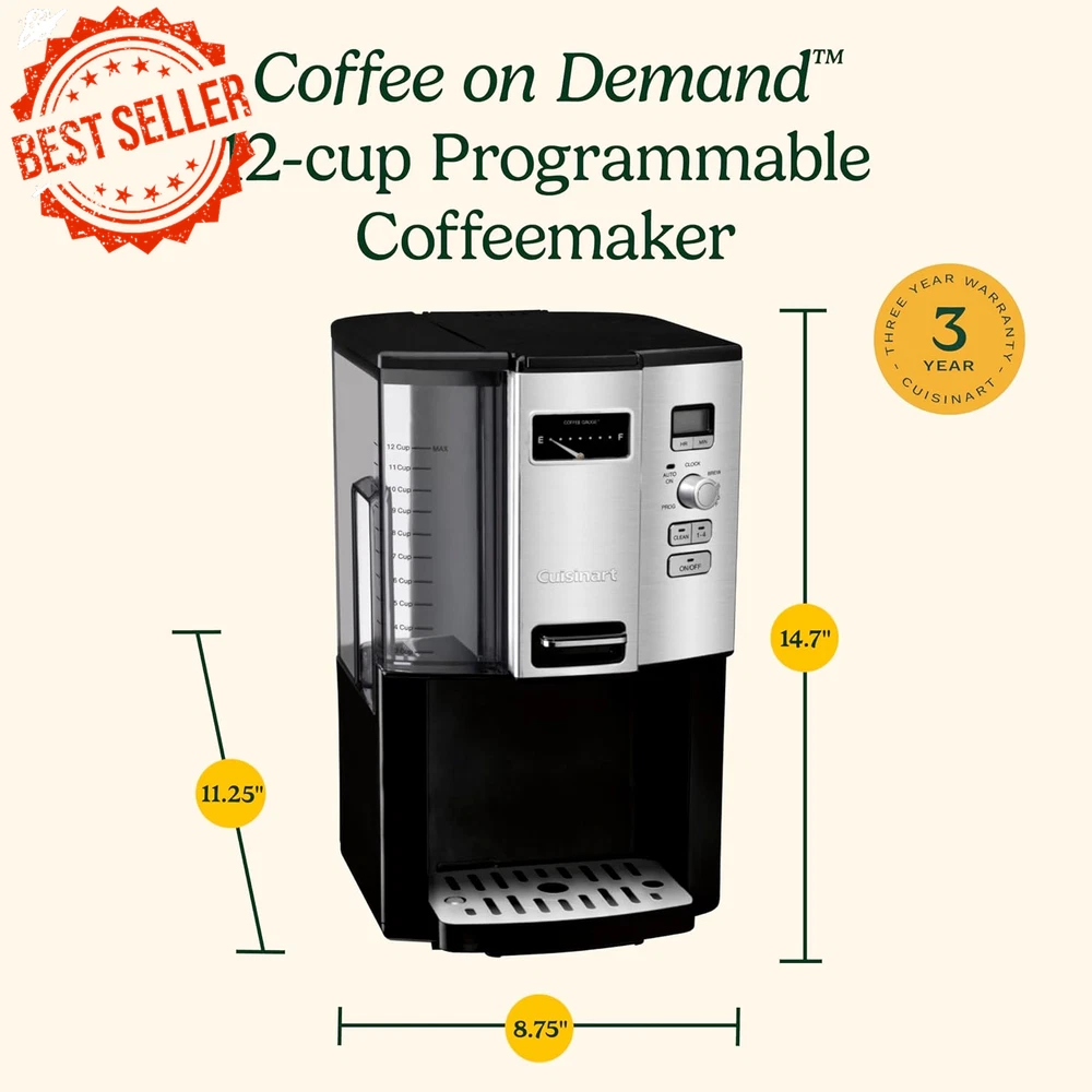 Fast Shipping On All Items 30 Days Money Guarantee Customer Support Excellent Service 100% Satisfaction Satisfaction Guaranteed 12 Cup Programmable Drip Coffee Maker DCC-3000P1 Black Specification Item model number DCC-3000P1 Style Modern Number of Items 1 Country of Origin China Department Unisex Unit Count 12.0 Count Manufacture Year 2020 Pattern Name Coffeemaker Model Name DCC-3000P1 12-Cup Programmable Coffee Maker Is Discontinued By Manufacturer No Specific Uses For Product Make Coffee Customer Package Type Standard Packaging Item Weight 9 pounds Human Interface Input Mouse, Buttons Filter Type Paper Exterior Finish Stainless Steel Capacity 12 Cups Material Stainless Steel, Plastic Color Black Coffee Maker Type Drip Coffee Machine Global Trade Identification Number 00086279169044 Coffee Input Type Ground Coffee, Paper Filter Operation Mode Fully Automatic Voltage 110 Recommended Uses For Product Personal coffee consumption at home or office Included Components Hot Beverages;Coffee Machines;drip coffeemakers Product Dimensions 11.25"D x 8.75"W x 14.7"H Item Weight 9 Pounds Wattage 400.6 8.75 "h x 11.25 "h x 14.7 "h. Weight: 400.6 oz Item Description The Cuisinart DCC-3000 Coffee on Demand is a convenient coffee maker that allows you to brew and serve coffee one cup at a time. With a large 12-cup reservoir and programmable features, it provides a hassle-free coffee-making experience. Features & Benefits: Removable Water Reservoir: Detaches easily for quick and convenient filling. Drip Tray & Plate: Removable drip tray plate to catch any excess coffee, preventing messes and providing easy cleanup. Coffee Reservoir: The double-wall coffee reservoir holds up to 12 cups, keeping your coffee hot for hours. Charcoal Water Filter: Eliminates chlorine and bad tastes or odors, ensuring your coffee tastes fresh and pure. Coffee Gauge: Displays how many cups of coffee remain in the reservoir, keeping you informed. 1-4 Cup Setting: Specifically designed for brewing smaller amounts, enhancing flavor extraction and temperature. Showerhead: Distributes water evenly over the coffee grounds to reduce temperature loss during brewing. Dispenser Lever: Dispenses coffee directly into your mug or travel cup without the need for a carafe. Gold-Tone Cuisinart Commercial-Style Filter: For a more refined brewing process and easy cleaning. BPA-Free Materials: All materials in contact with liquid are free from BPA, ensuring safe coffee consumption. Controls & Functions: Easy-to-Use Control Panel: Clock Display: Displays the time of day and Auto On/Off times. Function Knob: Selects Auto On, Auto Off, Program, Clock, and Brew functions. Hour and Minute Buttons: Set time of day and program auto features. Programmable Features: Auto On: Set the coffee maker to start brewing at a designated time (up to 24 hours in advance). Auto Off: Automatically turns off the machine between 0 to 4 hours after brewing ends. Program Function: Set the brew start time using the hour and minute buttons. Brew Function: Initiates the brewing cycle directly. Clean Setting: Indicates when it's time to clean the machine by removing built-up calcification in the water reservoir. Ready Tone: Signals the completion of the brew cycle with five beeps. Power Loss Back-Up System: Protects your programmed settings for one minute if there is a power failure or the unit is unplugged. Installation & Usage Tips: Preparing the Unit: Before First Use: Ensure the coffee grounds/particles in the brewing area are removed to prevent issues with the sealing gasket. Rinse the valve located at the bottom of the coffee container under tap water to remove any accumulated grounds. Brewing Coffee: Select the number of cups you want to brew using the 1-4 cup setting for smaller brews. Set the Auto On time if you want the coffee maker to start brewing automatically at a later time. Cleaning the Coffee Maker: Periodically clean the coffee maker using the Clean Setting to prevent calcium buildup in the water reservoir. This will extend the life of the machine and maintain the quality of your coffee. Troubleshooting: Coffee Not Dispensing Properly: If coffee grounds accumulate in the coffee container, the valve might not be sealing correctly. Rinse the valve with tap water while holding it open to flush out any coffee particles. Important Note: Ensure you follow the safety instructions and avoid overfilling the coffee reservoir. Always use filtered or clean tap water for optimal coffee taste. Enjoy your perfect cup of coffee every time with the Cuisinart DCC-3000 Coffee on Demand! About us We offer the best prices around on high quality products. Our E-store includes media such as books, movies, music and games while offering electronics, toys, sporting apparel, clothing, tools, general home, garden items and more. Shipping We are always working hard to ensure your package arrives as soon as possible. Please understand that some factors like weather, high postal traffic, and the performance of shipping companies are outside of our control. We offer free shipping to the lower 48 states and ship within 2-3 business days of payment, usually sooner. We do not accept P.O. Boxes. Please provide a physical address. For shipping outside of the continental USA, we only use eBay's Global Shipping Program.The item is shipped to KY and then sent to the rest of the world. International customers are responsible for all duties and taxes. Continue to check out to calculate costs for shipping the item to your country. Messages regarding eBay's Global Shipping Program MUST be directed at eBay EXCLUSIVELY. Returns We offer a 30-Day Return Policy on items in which you are not completely satisfied with. You have the option of a full-refund or an exchange of the item. No returns are available on items shipped outside of the USA Satisfaction We try over very best to make sure every customer is completely satisfied. If there's a problem, message us! We're happy to help. Payment Options Shop W
