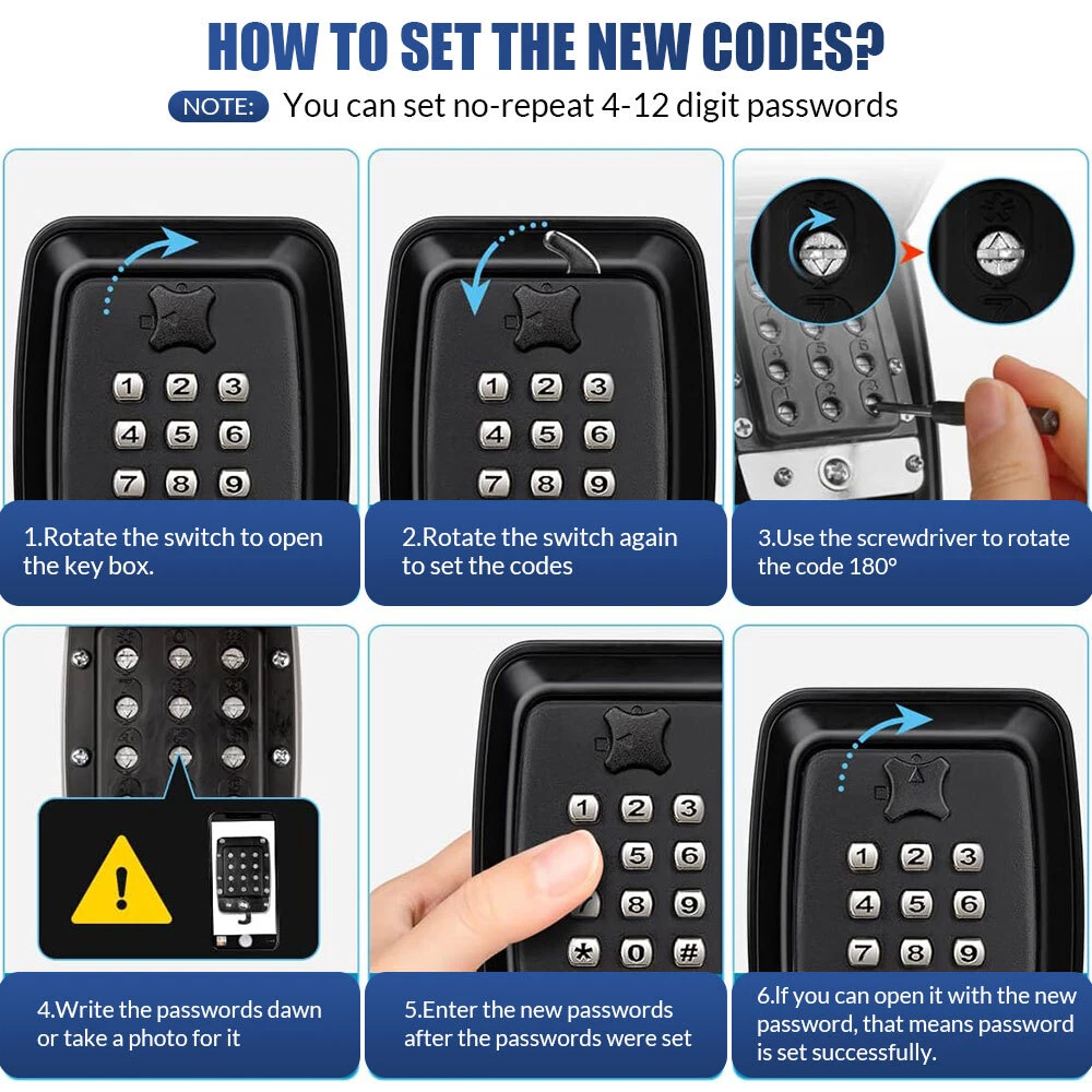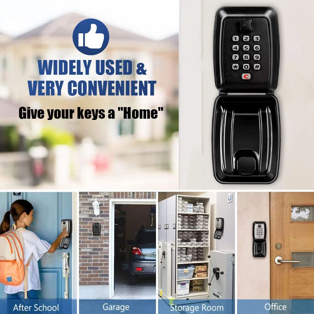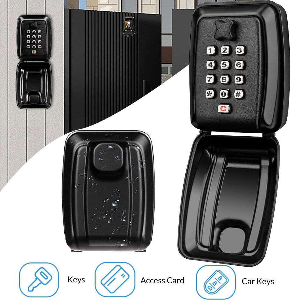 About this item 【HIGH SECURITY】- Key lock box can be set with a code of 1-12 digits at will. Provides more combination possibilities than many general 4-digit passwords on the market, so it’s harder to crack and has higher security. 【STURDY & DURABLE】- The key storage box made of high-strength zinc, aluminum alloy and heavy-duty stainless-steel material, enough to withstand hammered, sawed and pried, has a long service life, keeps your key safer. 【RAINPROOF & DUSTPROOF】- The key hider lock box comes with removable cover shields and a removable hang ring, which can effectively protect from rain, snow and sun. You can securely hang this key lock box on a doorknob, fence and anywhere you want, no need to put the keys under the carpet or flower pot. Key lock box for outside suitable for indoors and outdoors, such as garage doors, wardrobes, offices and schools. 【LARGE CAPACITY】- The security lock box size: 4.76*3.78*2.44 inches, it has ample storage space, a built-in key hook, which can hold multiple keys or other small things like ID cards, access cards, car keys, etc. Perfectly for family members, realtors, current students, office staff, pet sitters. Note: This "C" button means cancel, so you can re-enter the password if you entered it incorrectly. Specification: Material: Aluminum alloy + ABS. Weight: 650g. Color: black. What do you get? 1 x security key box 1 x User manual 1 x Screwdriver 1 x Packing box