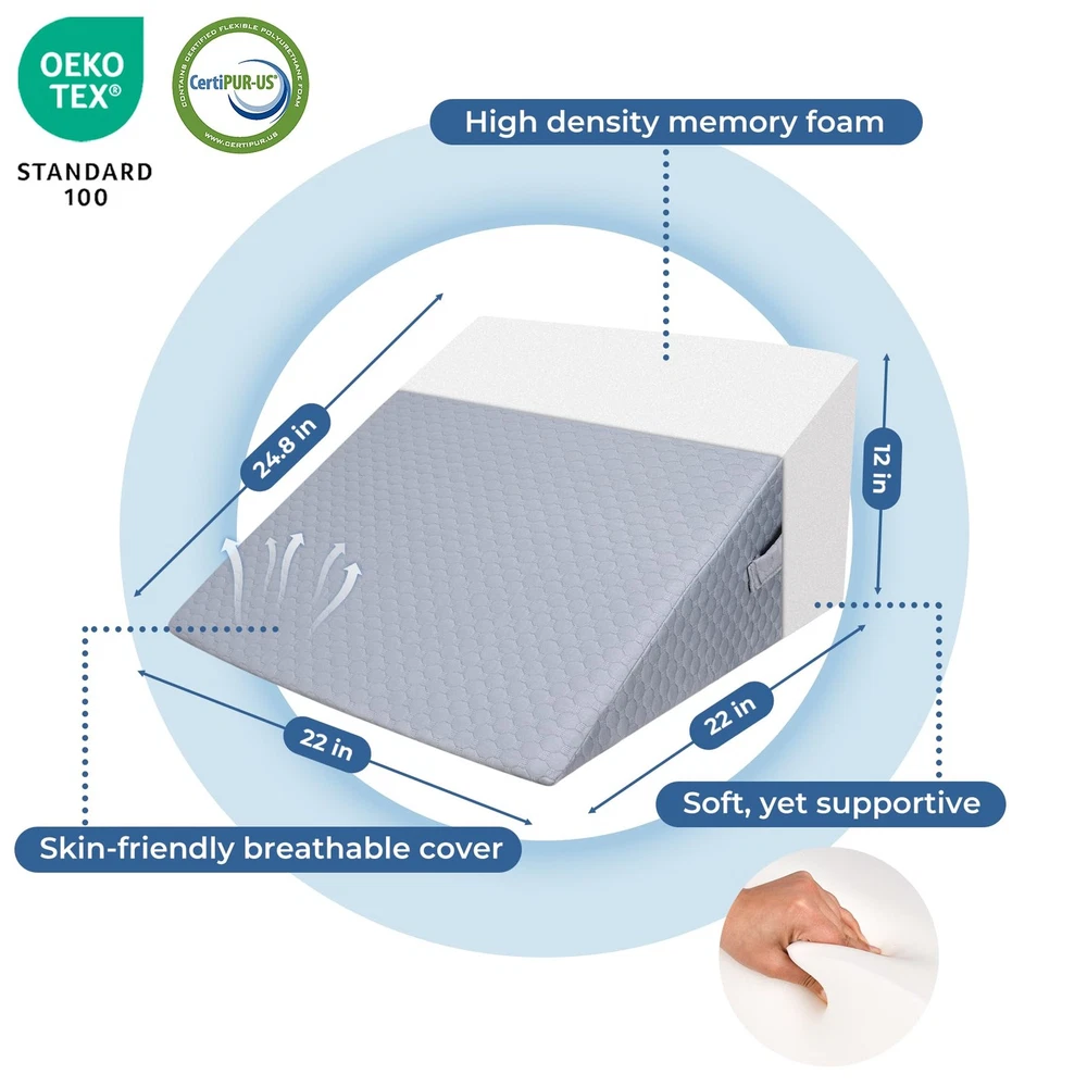 Ergonomic Bed Wedge Pillow: The bed wedge is soft, yet supportive, It remains uniform in density and conforms to your shape to reduce pressure points, help increase blood flow and provide the support, comfort and alignment you need for a comfortable and restful sleep - Foam wedge specifically designed for ultimate relaxation. Versatile 12inch Wedge Pillow: It not only improves your sleep quality, but it is also a multifunctional lifting pillow. Wedge pillow can serve as a head or back pillow, providing just the right amount of support to help you relax your body while reading or watching TV. Place it on your lap during work to effectively isolate the heat from the computer, keeping you cool and comfortable Premium Bed Wedge Pillow: The ergonomic wedge pillow is made of premium-grade 25D memory foam, which is comfortable and breathable, wedge pillow for sleeping has been certified by CertiPUR US and OEKO-TEX, which is safe and hypoallergenic Friendly-design for Pain Relief: Supportive and elevated post-surgery wedge pillow helps you reduce snoring, relieve back pain, acid reflux and breathing issues, improving blood circulation and health. Ideal wedge pillows for after surgery and sleep apnea, providing more comfortable night's sleep for you Breathable & Removable Zippered Cover: The bed wedge pillow has a removable soft and breathable air layer pillowcase, which can be washed by hand or machine. Besides, with a handle, our foam wedge pillow is easy to carry and move around Good Choice: If you struggle to sleep at night, this wedge pillow for sleeping is a good choice for you, it can help you solve the problem. Whatever concerns about the wedge pillow you have, we provide customer service for you and reply within 24 hours