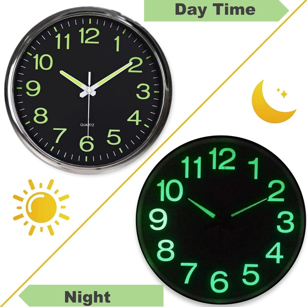 Luminous wall clocks, super quiet and non-ticking with night lights function, large enough for easily to see and read 12 inch diameter round fram, reliable quality Glowing up function, the large stereoscopic numeral have green night light asks for absorbing enough light energy during the day Super Silent clock, precise quartz movements to accurate time, quiet sweep second hand ensure a good sleeping and work environment Easy to Use, Hooks included with the clock , wide slot in back for easy hanging Battery operated and low-power quartz movement requires 1 AA battery - not included (a good battery can be used for more than year, energy saved)
