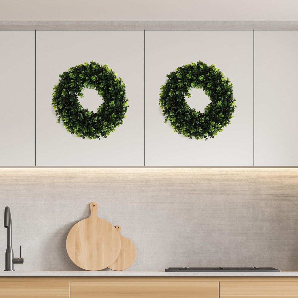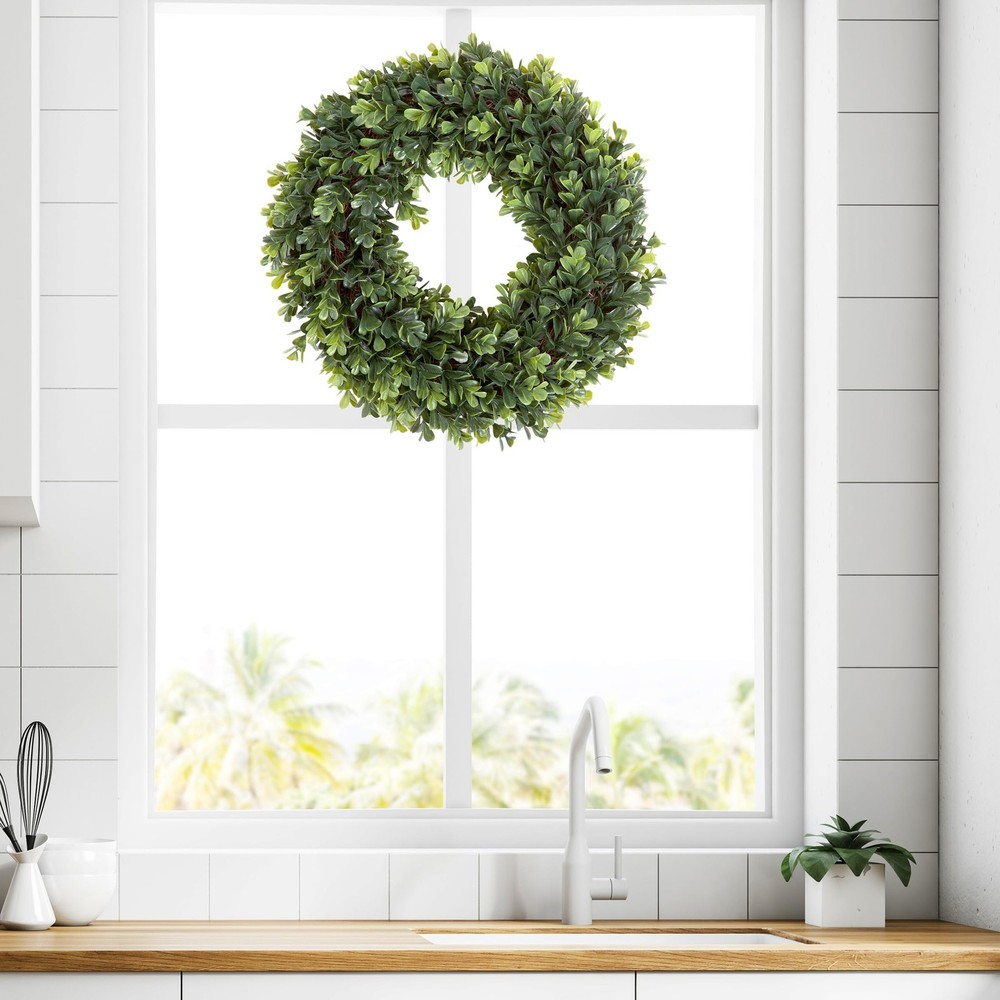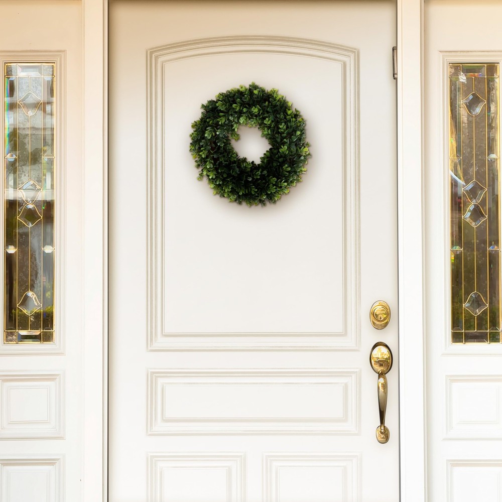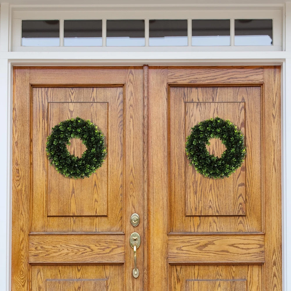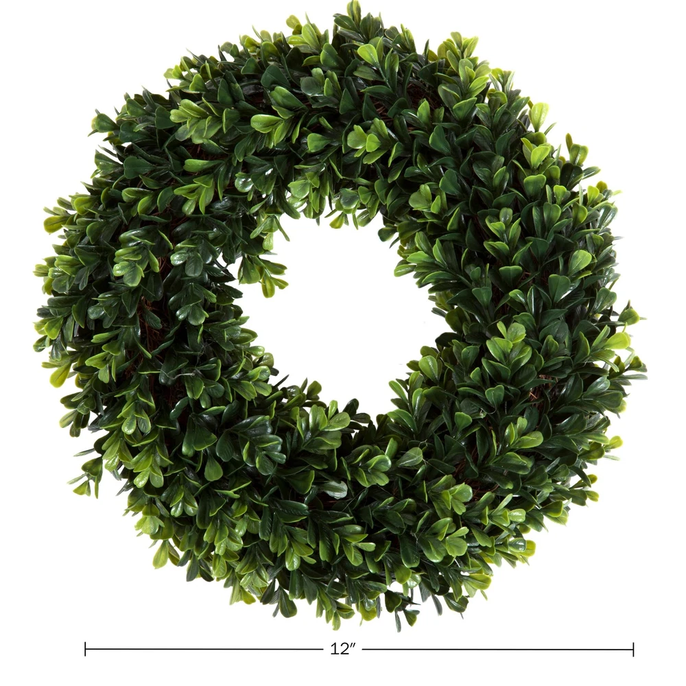 12-INCH WREATH - The faux boxwood door wreath is UV-protected to resist fading in sunny conditions, so it maintains a vibrant hue over time. These versatile all-season wreaths are perfect for summer, fall, winter, or spring door décor. LIFELIKE DESIGN - The vivid greenery of the front door wreath is full of natural-looking color variations and enhanced with embedded faux twigs to give the boxwood wreath a lush and lifelike appearance to your kitchen, living room, or front door décor. ALL-SEASON USE - Add some colorful berries to transform it into a holiday wreath or create fall and spring inspiration with a welcoming classroom door decoration by attaching golden-hued artificial leaves or flowers to the rich green faux foliage. LOW MAINTENANCE - This outdoor wreath needs no special care to keep it looking fresh and clean. Simply dust the wreaths for front door occasionally or wipe the leaves with a soft cloth to keep them looking great for year-round use indoors and out. PRODUCT DETAILS - Materials: UV-Resistant Plastic. Dimensions: (L) 12" x (W) 12". Color: Green.
